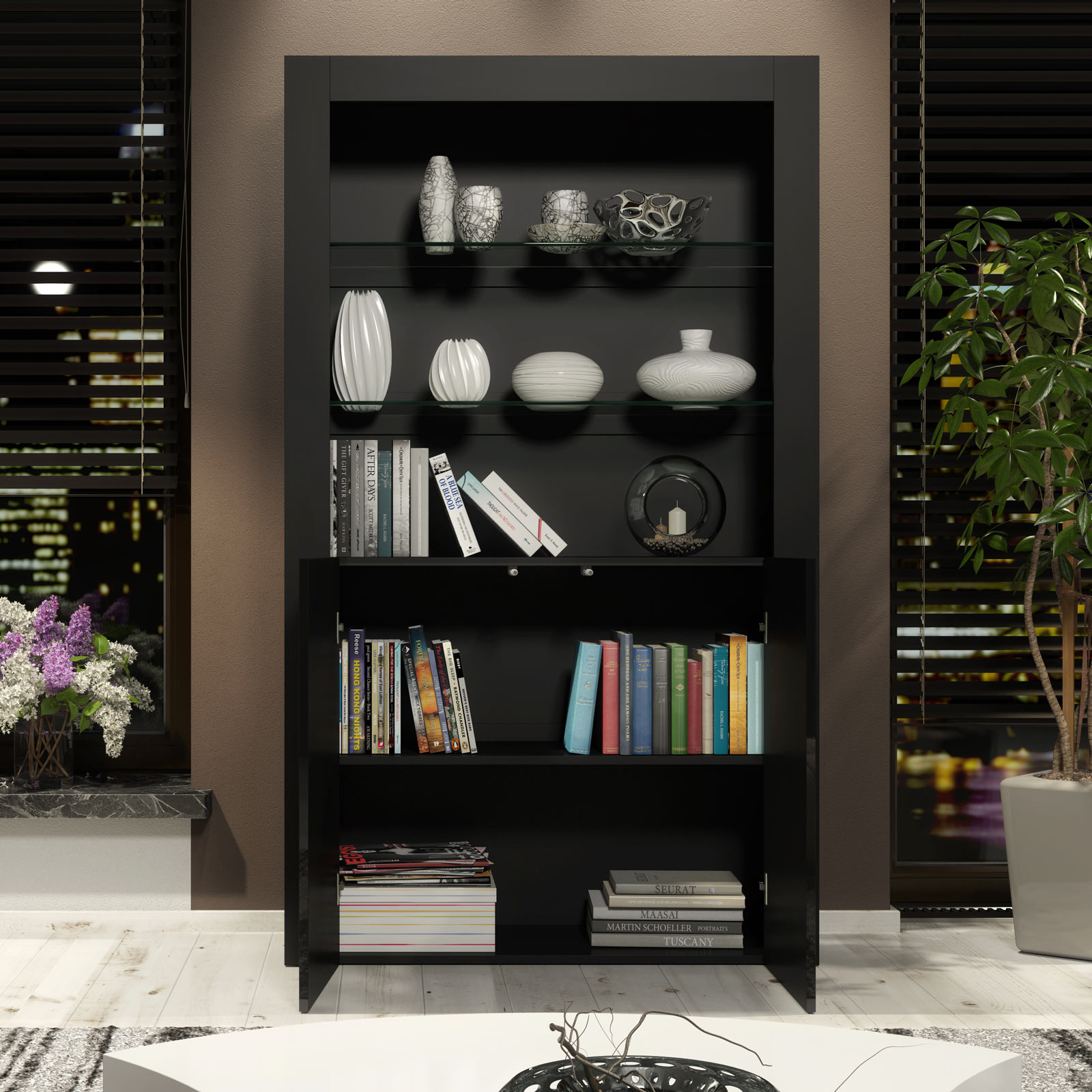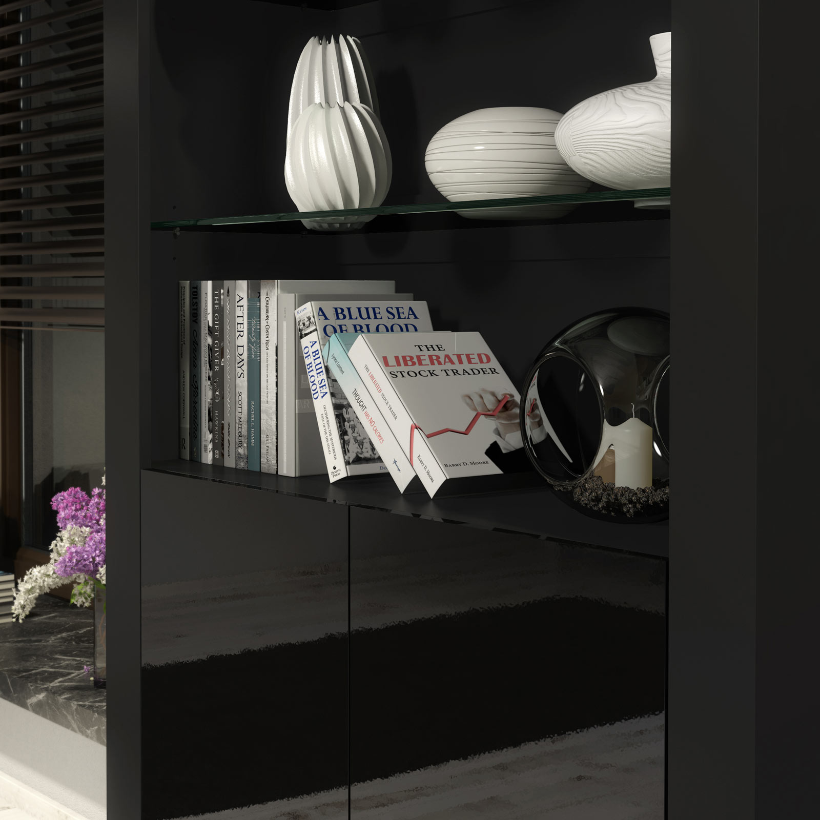The upper section features two glass shelves, offering a refined display area for decorative pieces, books, or statement accessories. The glass shelves add visual lightness and balance to the strong black structure.