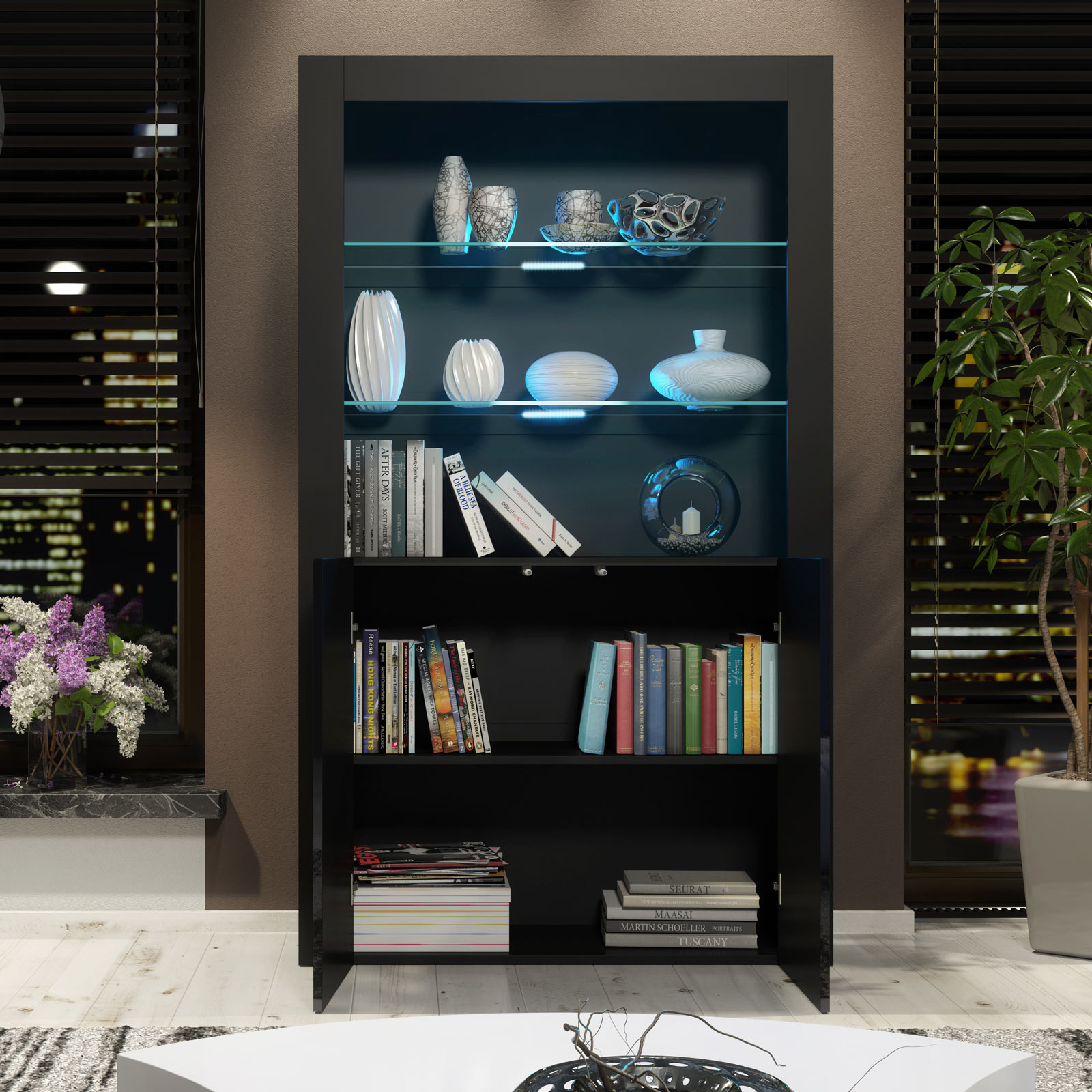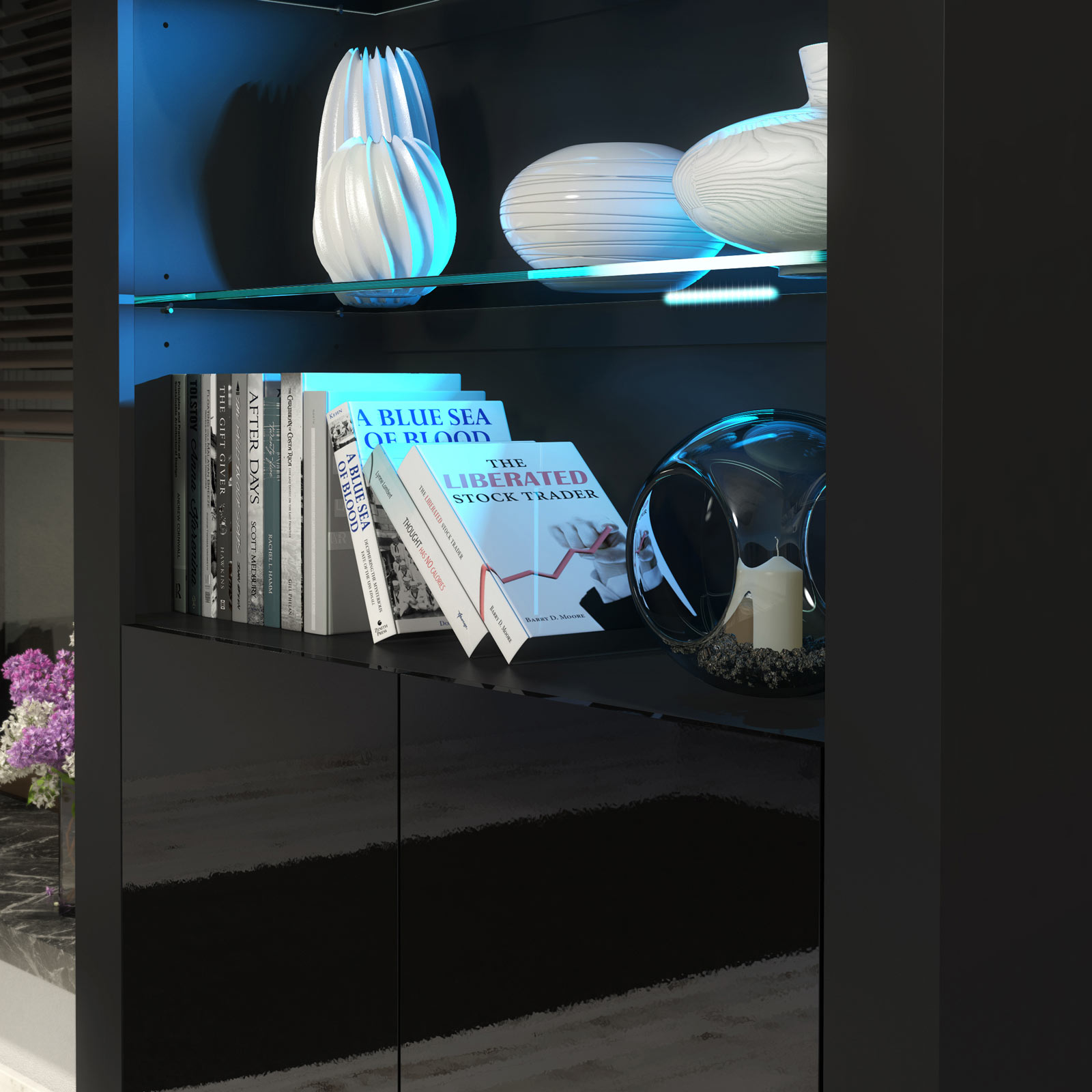 The upper section features two glass shelves illuminated with free LED lights, creating an eye-catching display area for decorative accessories, glassware, or statement pieces. The subtle lighting enhances depth and adds a sophisticated ambience to your space.