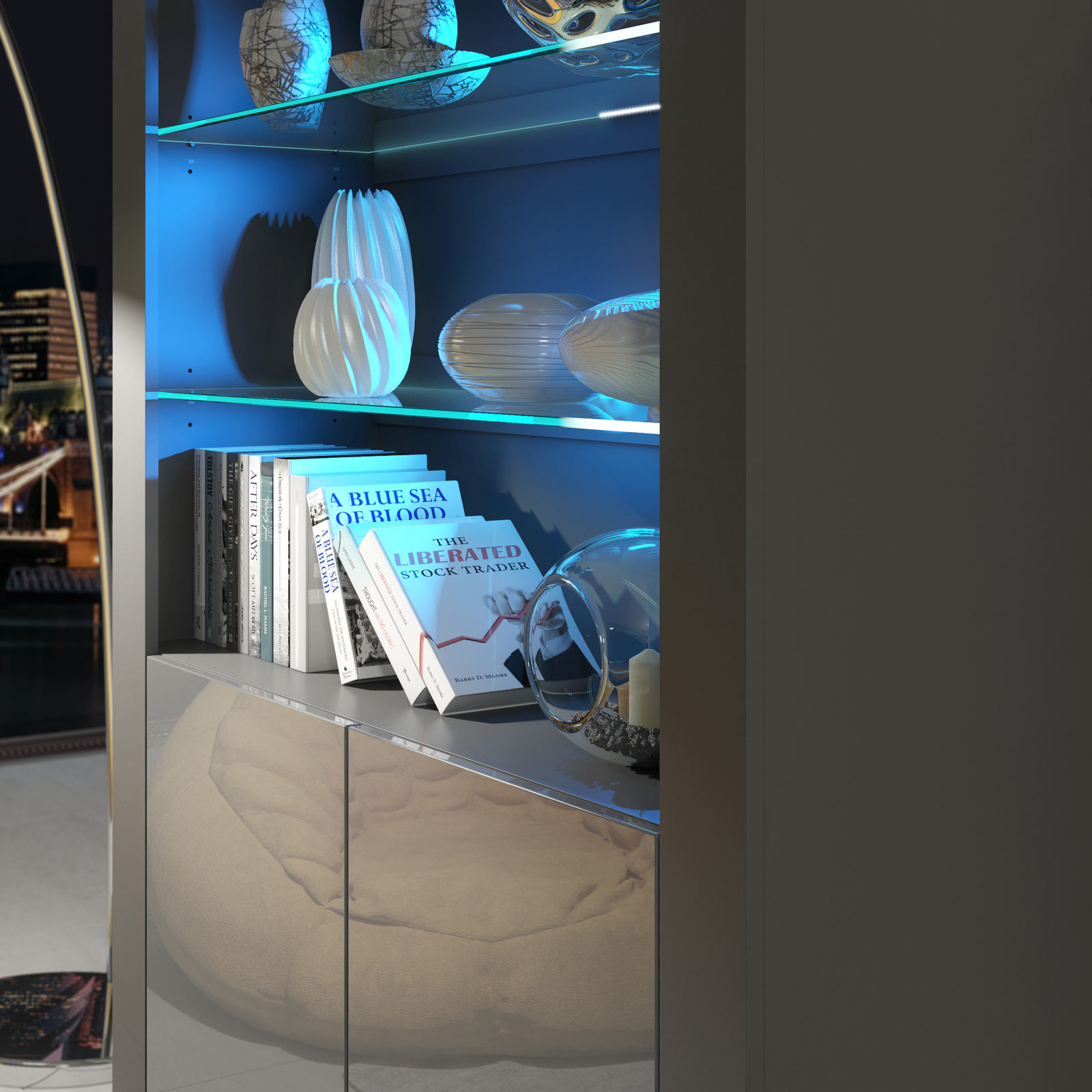 In the lower section, two push-to-open gloss doors maintain a smooth, handle-free look. Behind the doors, a central internal shelf provides generous concealed storage — ideal for keeping everyday essentials neatly organised and out of sight.