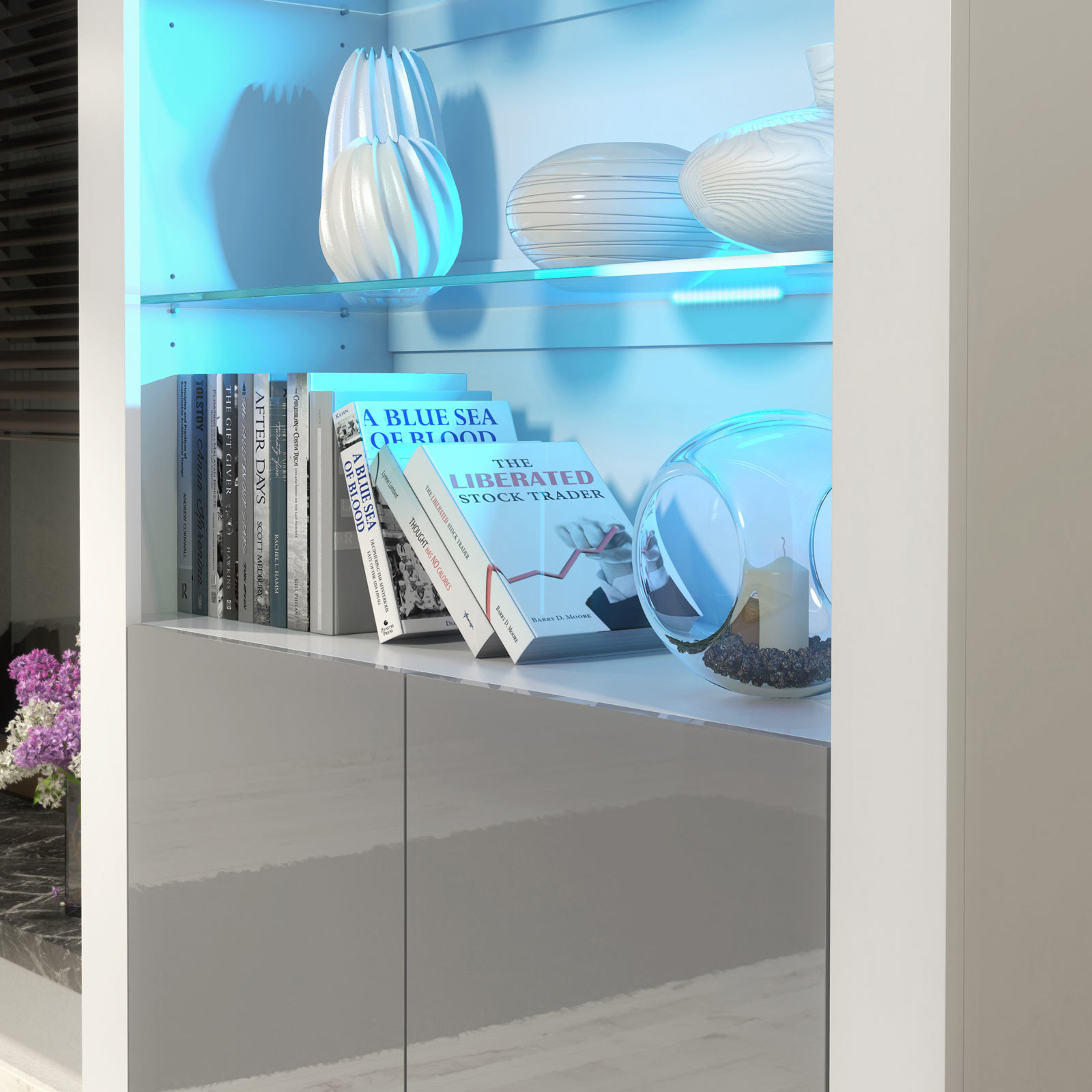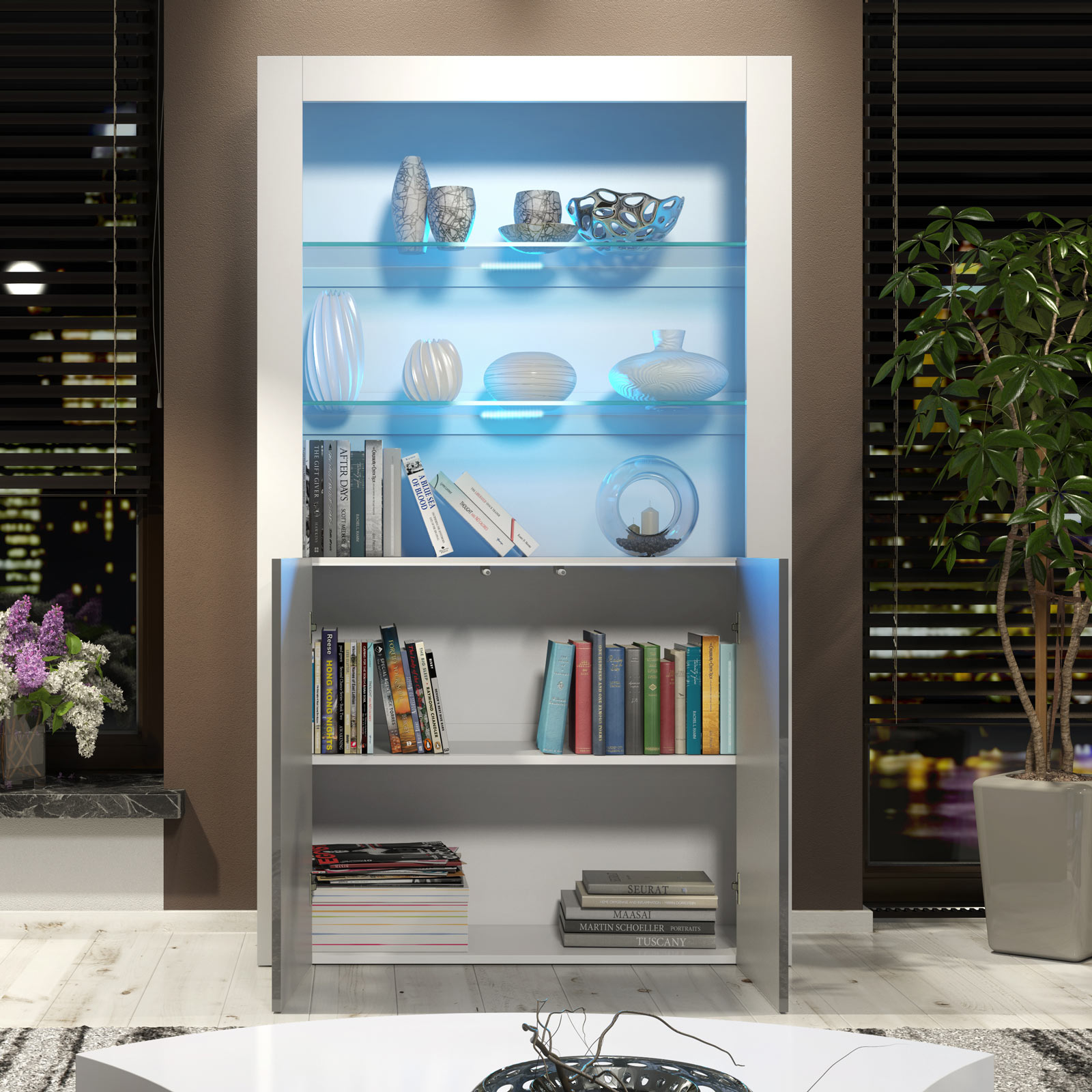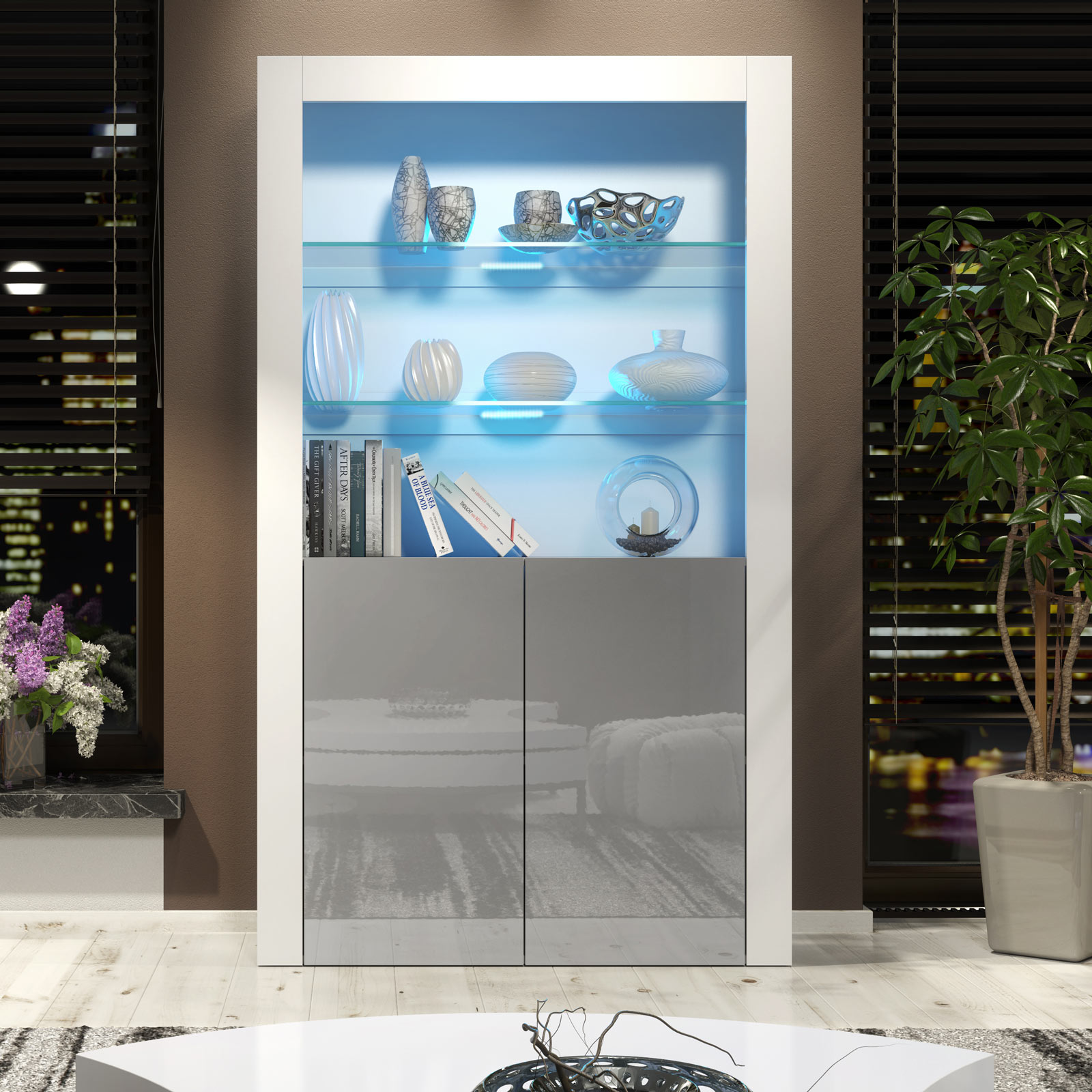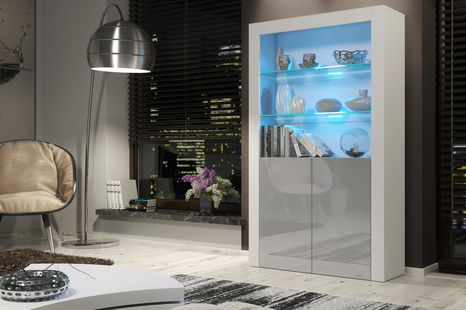 Pair with grey accents, metallic décor, or textured fabrics to highlight the subtle contrast between the white matt body and grey gloss doors. Keep accessories balanced within the illuminated glass section to create a refined, modern display.