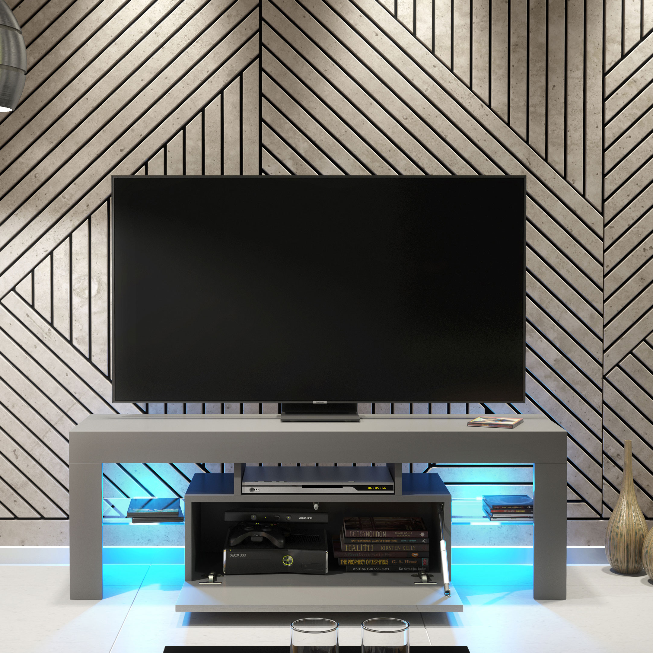 At the centre, a push-to-open drop-down door opens smoothly downwards to reveal generous concealed storage — perfect for remotes, cables, gaming accessories, and everyday living room essentials. Above the central compartment, an open AV niche provides practical space for a Sky box, media player, router, or console, keeping devices organised and easily accessible.