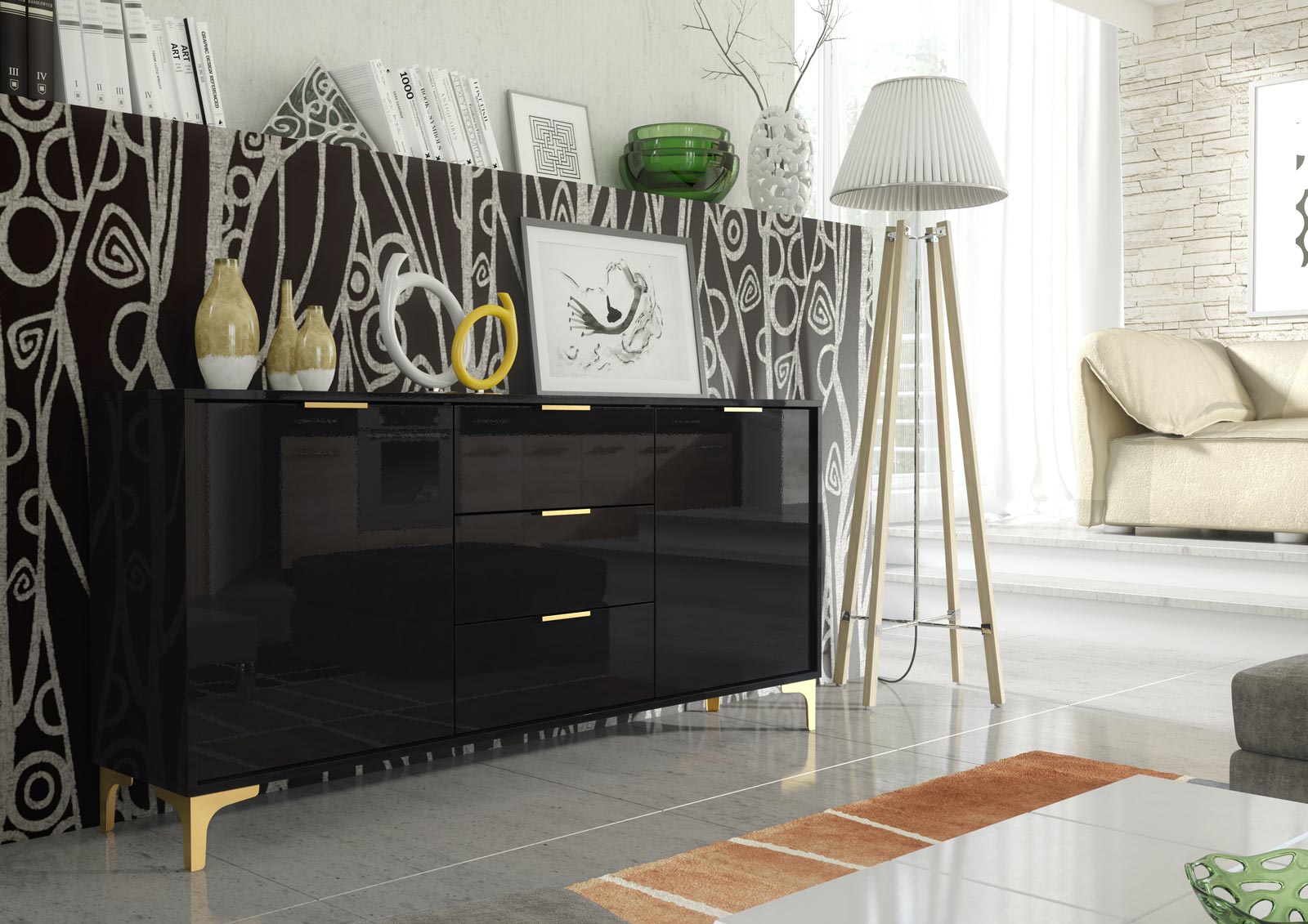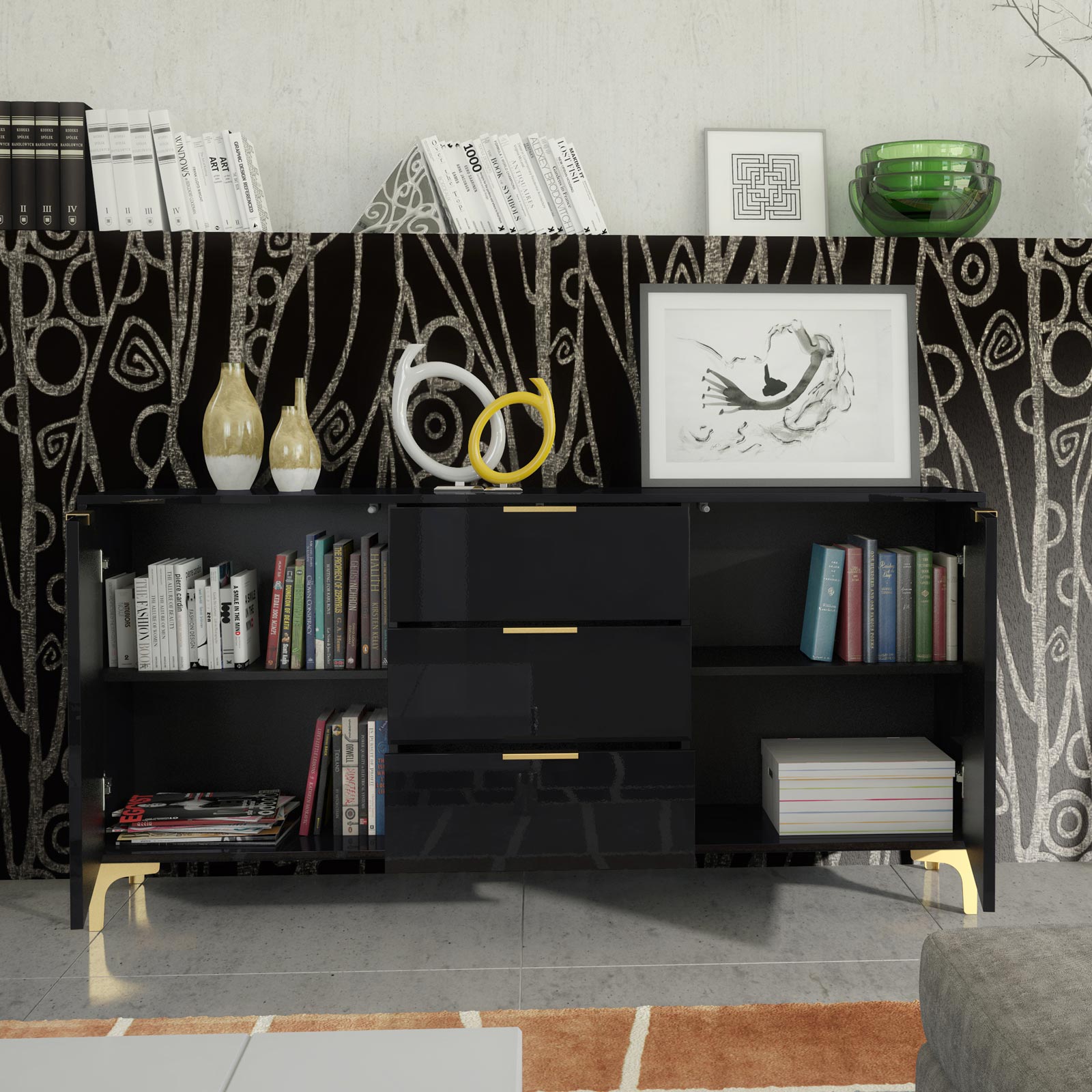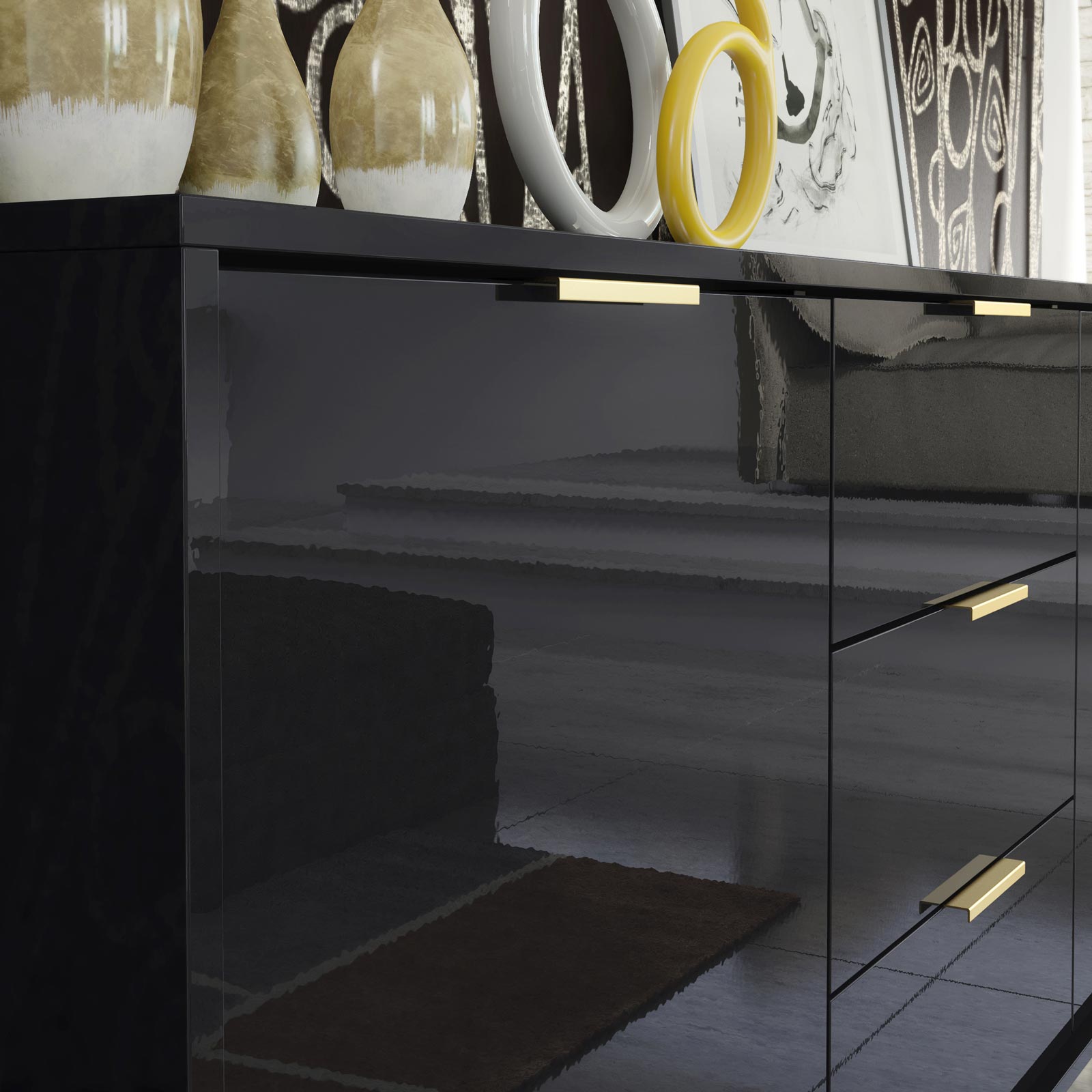 Finished entirely in a deep black high gloss, this sideboard creates a sleek, mirror-like surface that reflects light beautifully while adding depth and sophistication to your space. The contrast of the glossy black finish with gold metal handles and gold legs delivers a premium, modern look inspired by high-end interior design trends.