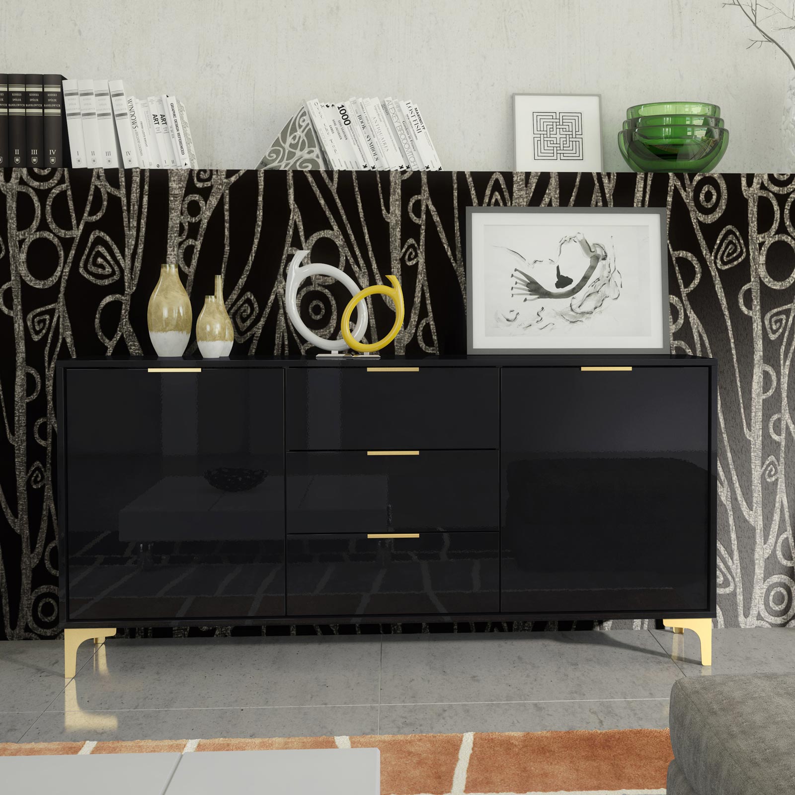140cm Black High Gloss Sideboard Cabinet with Gold Handles & Gold Legs – 3 Drawer Modern Storage Unit