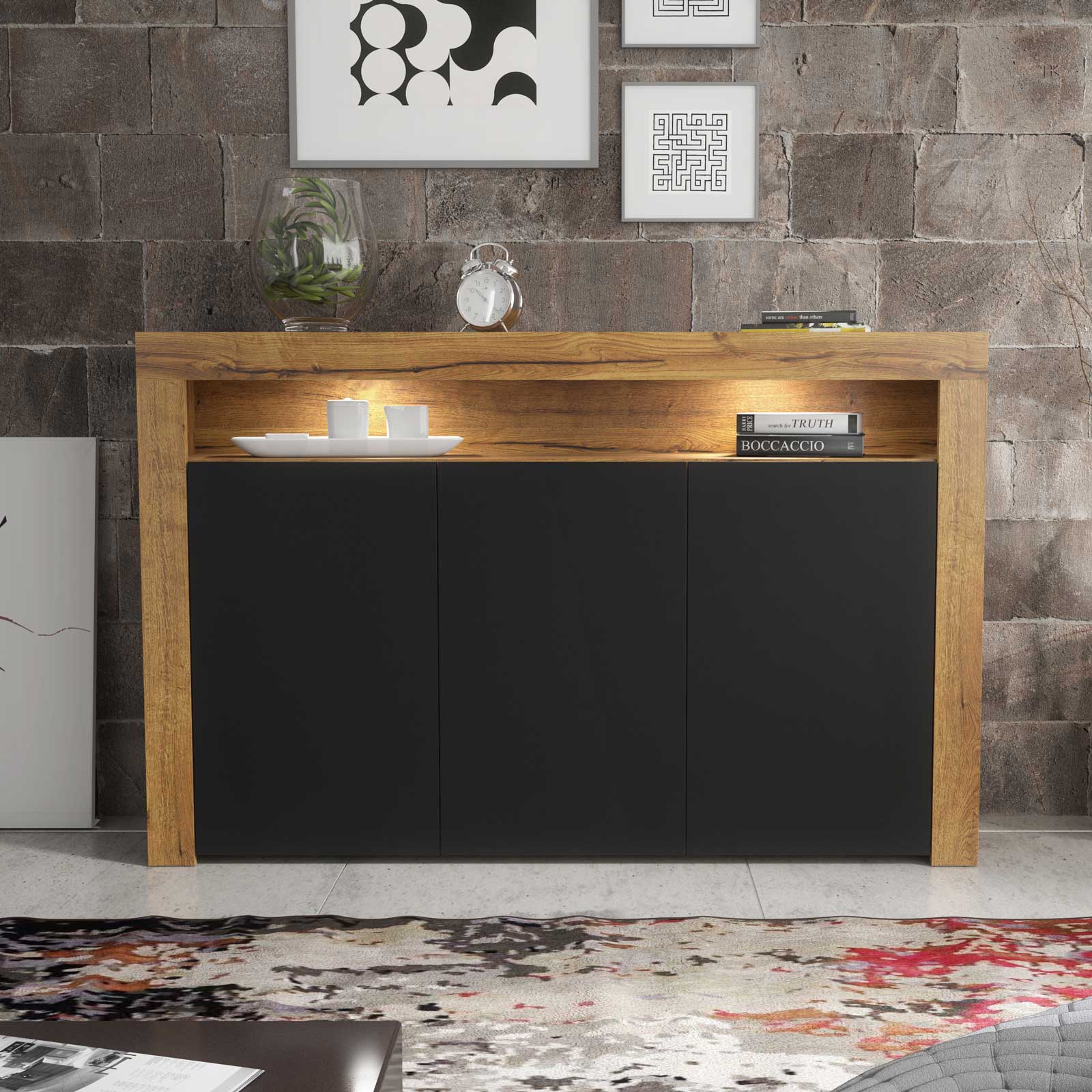 155cm Modern Sideboard Oak Matt & Black Matt, 3 Push-to-Open Doors, Free LED Lights, Contemporary Storage Cabinet for Living Room