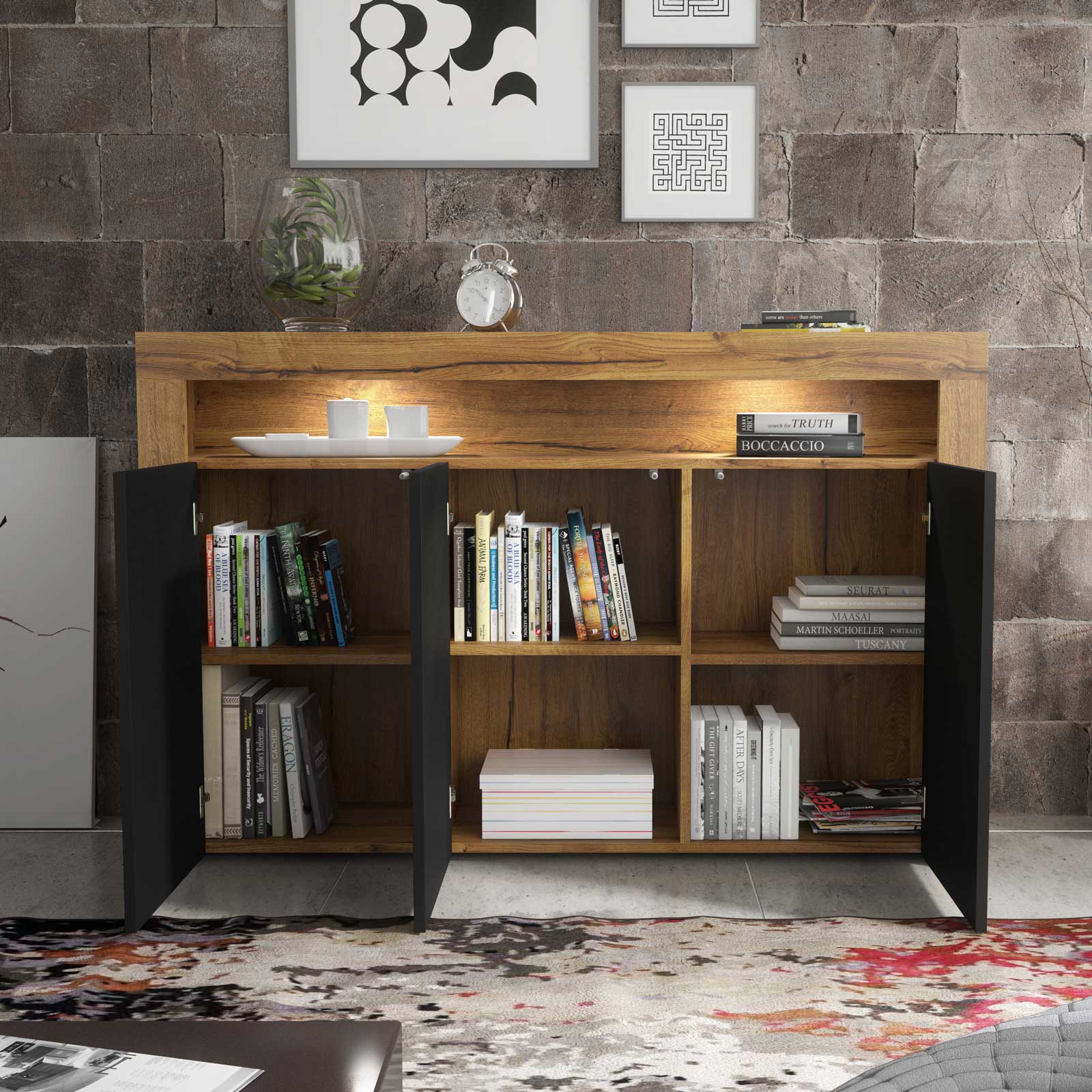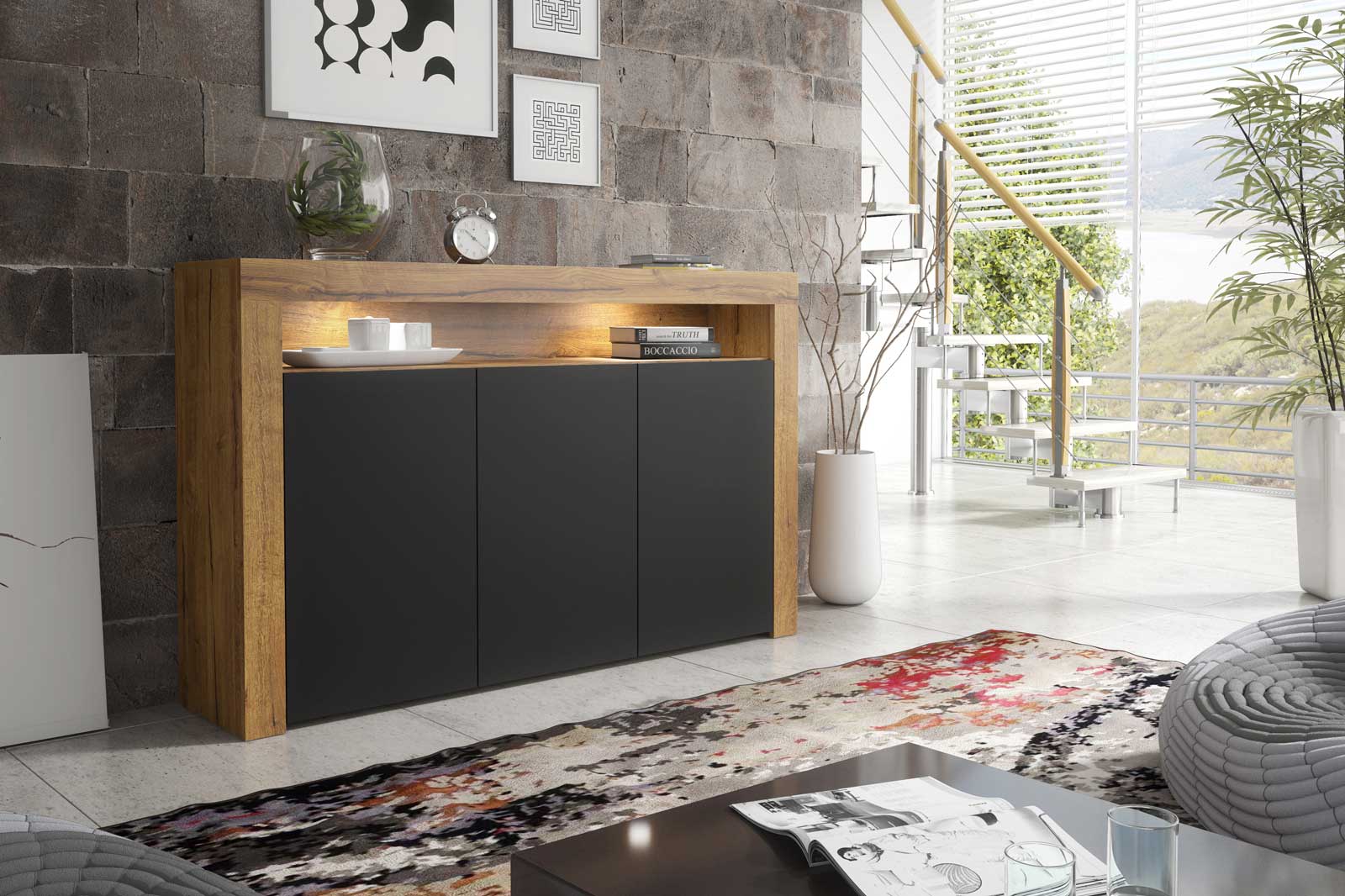 Bring bold contrast and natural warmth into your interior with this 155cm Oak Matt & Black Matt sideboard — a modern storage solution designed to make a statement.