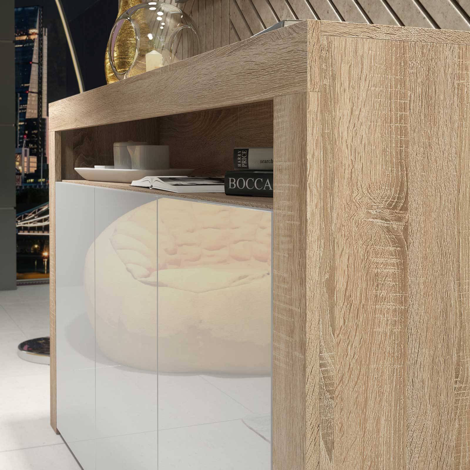 Pair with neutral tones, natural fabrics and light wood accents to enhance the warmth of the oak finish. Keep styling simple to allow the contrast between oak texture and white gloss to stand out.