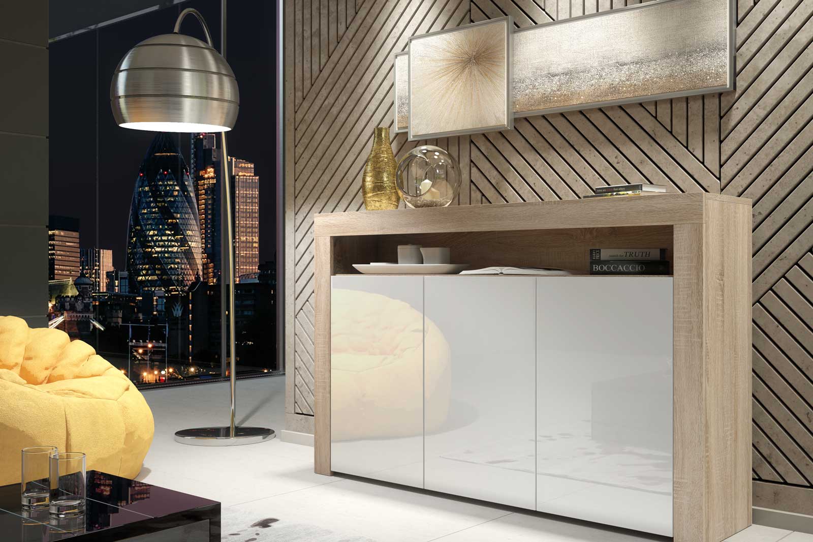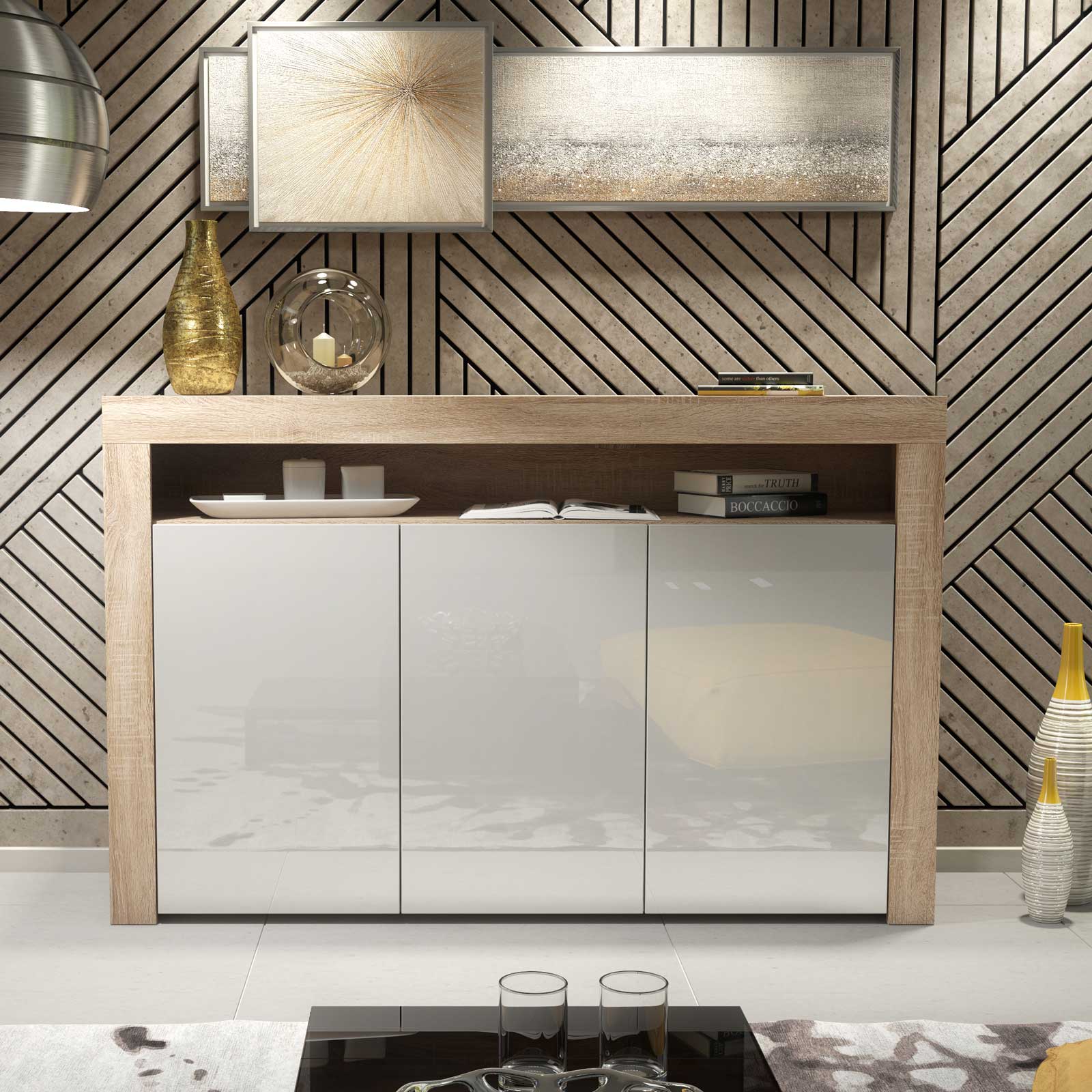 Introduce warmth and modern contrast into your interior with this 155cm Oak Matt & White Gloss sideboard — a stylish storage solution designed for contemporary living spaces.