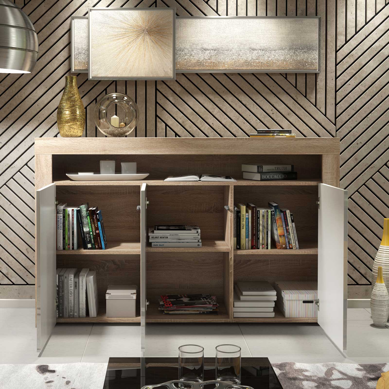 Behind the three push-to-open doors, you’ll find generous internal compartments, each fitted with a central shelf to help keep tableware, documents, or everyday essentials neatly organised. The handle-free push-to-open system ensures a sleek, uninterrupted front design.