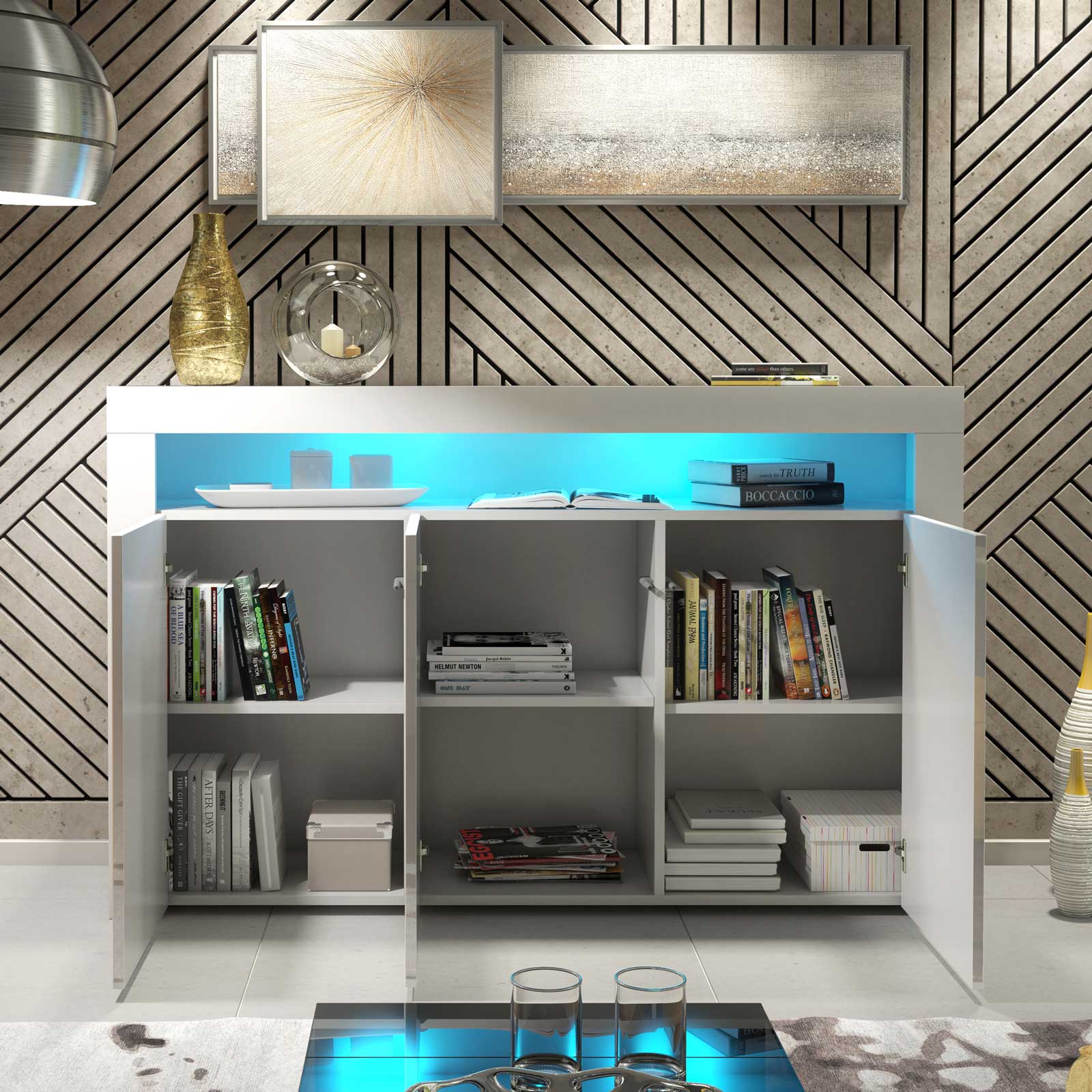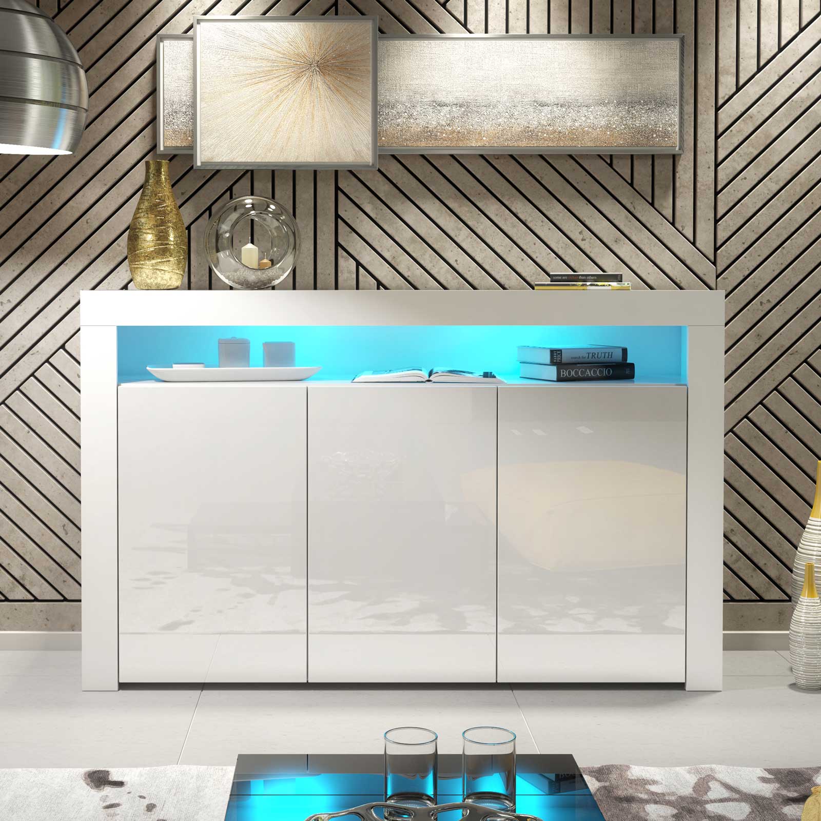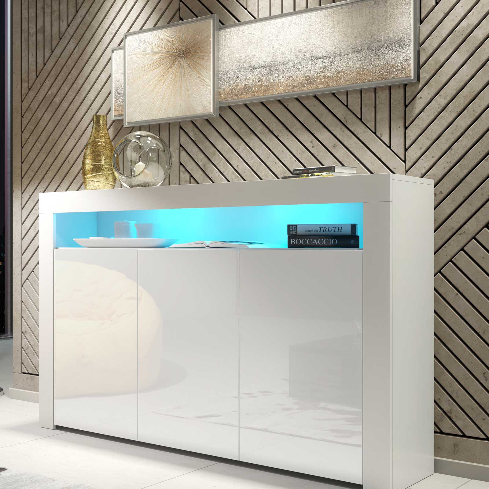 155cm Modern Sideboard White Matt & White Gloss with Free LED Lights, 3 Push-to-Open Doors, High Gloss Storage Cabinet for Living Room