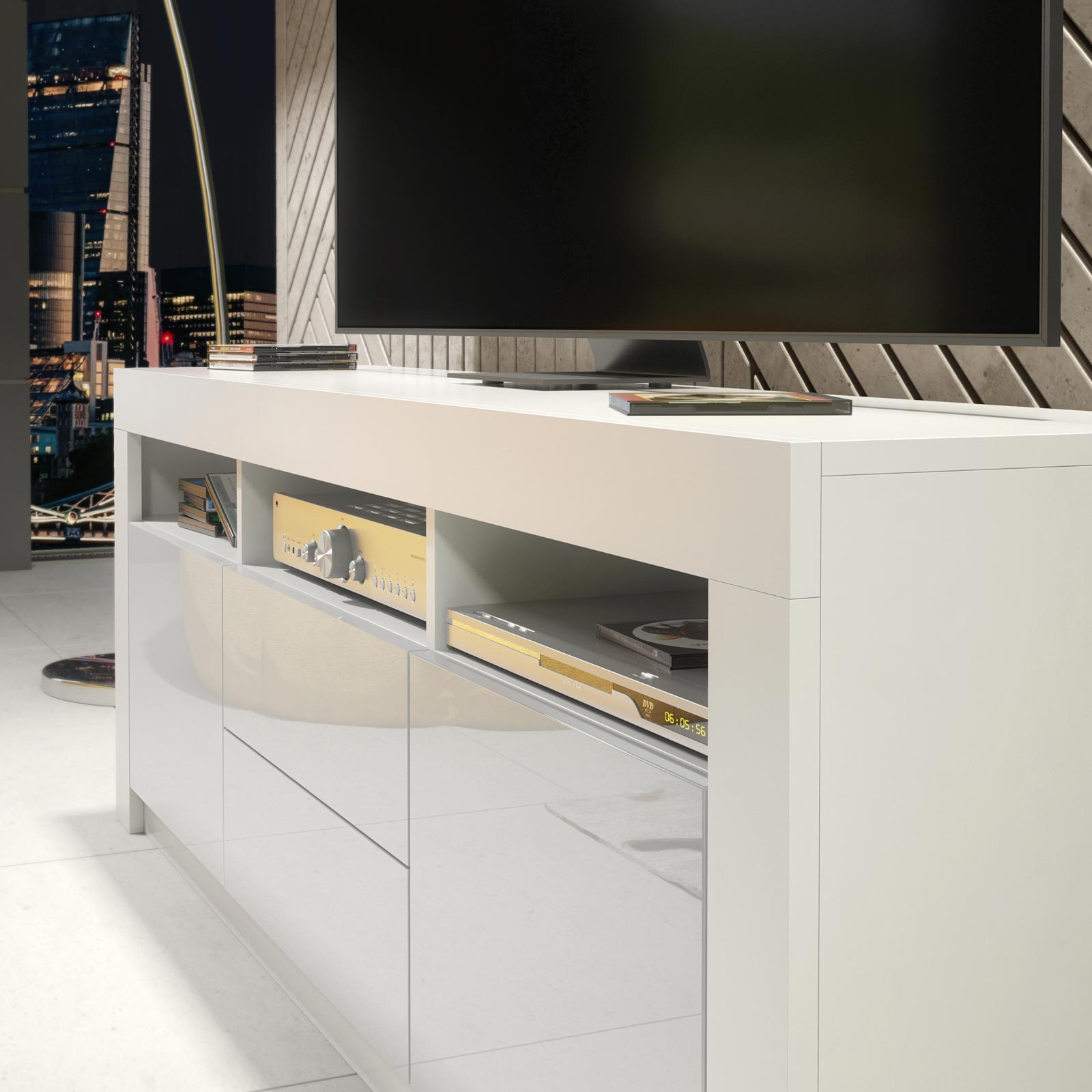 The white matt body provides a soft, minimalist base, while the white gloss doors and drawers add depth and a refined, light-reflecting finish. This crisp white-on-white combination enhances brightness and space, making it ideal for modern, Scandinavian, and minimalist living rooms.