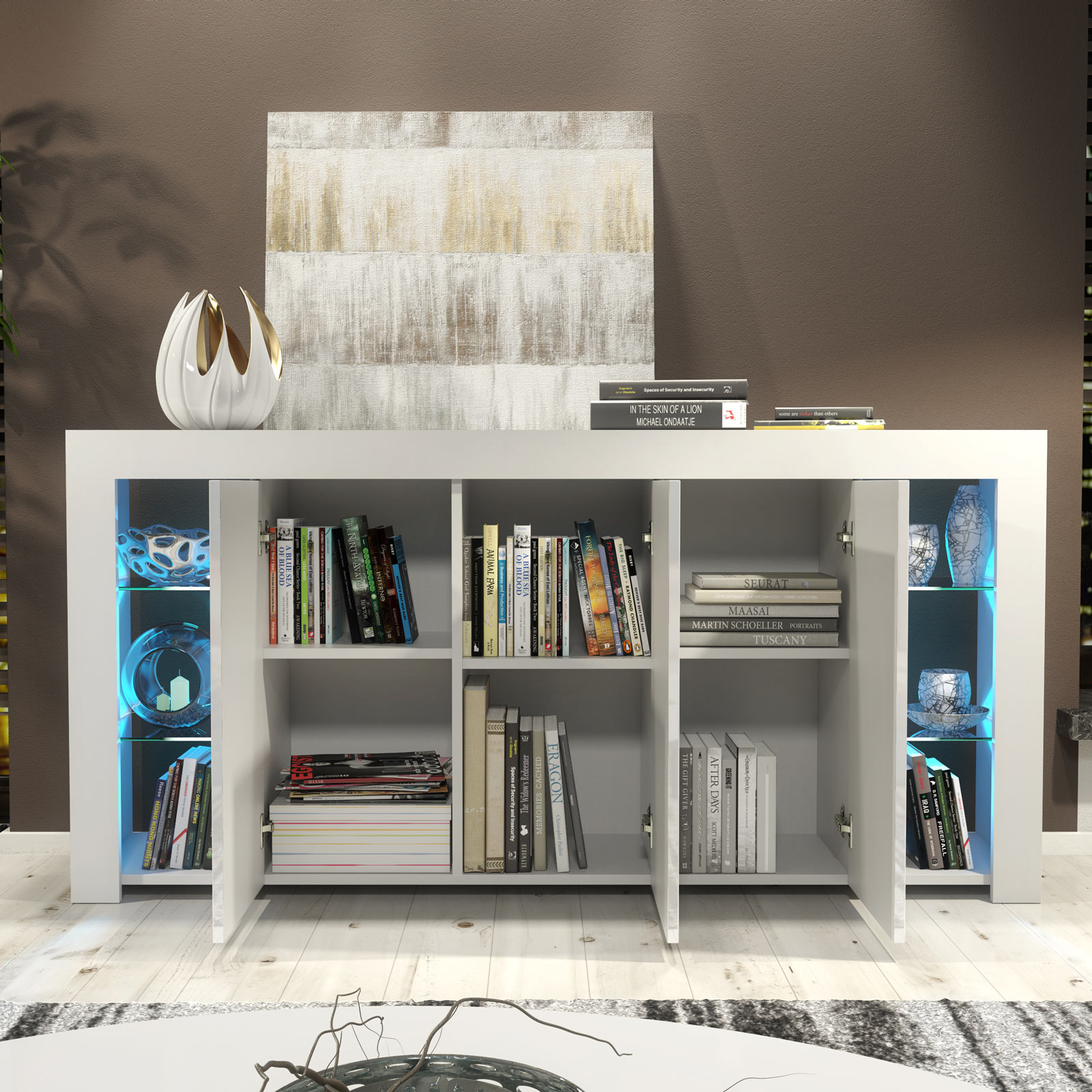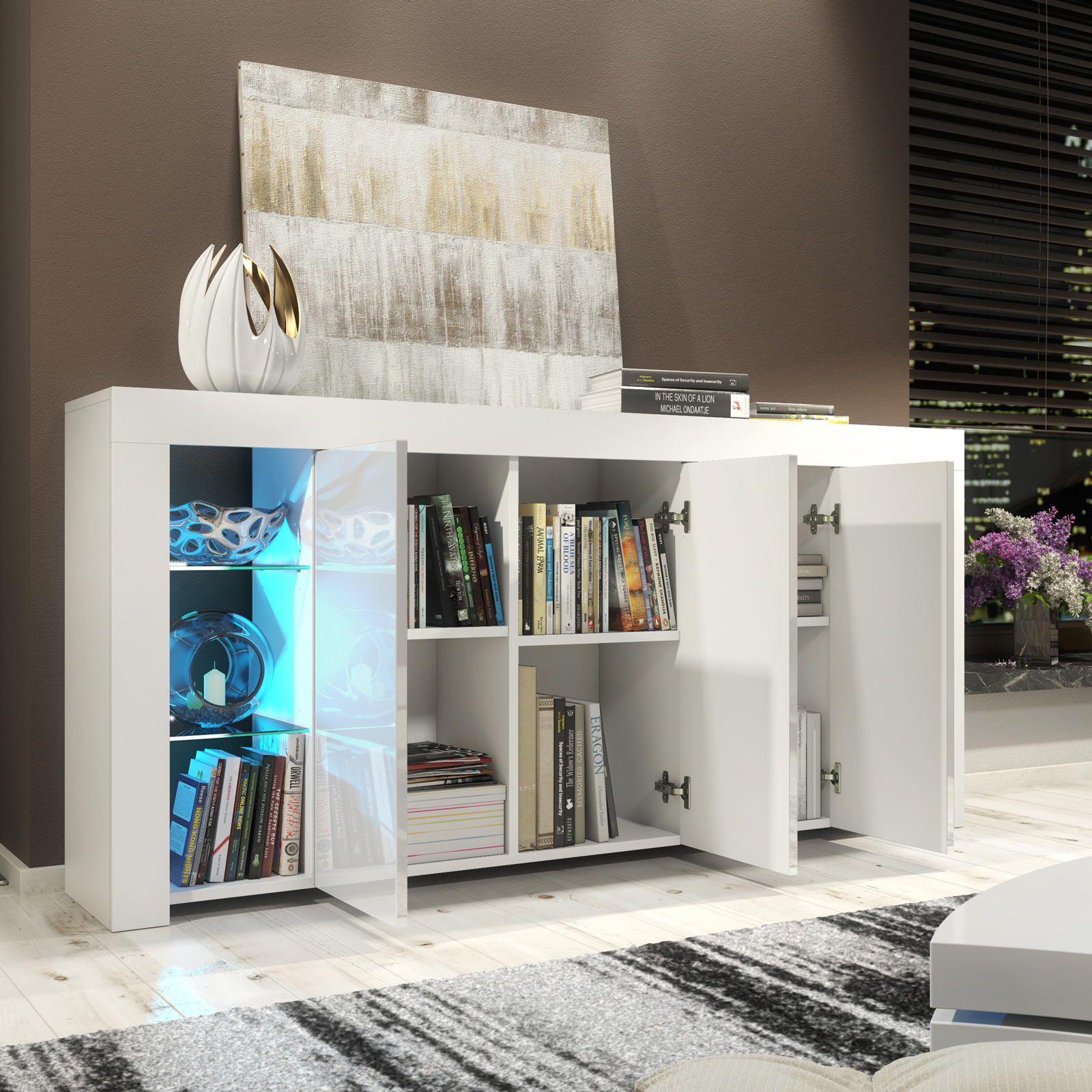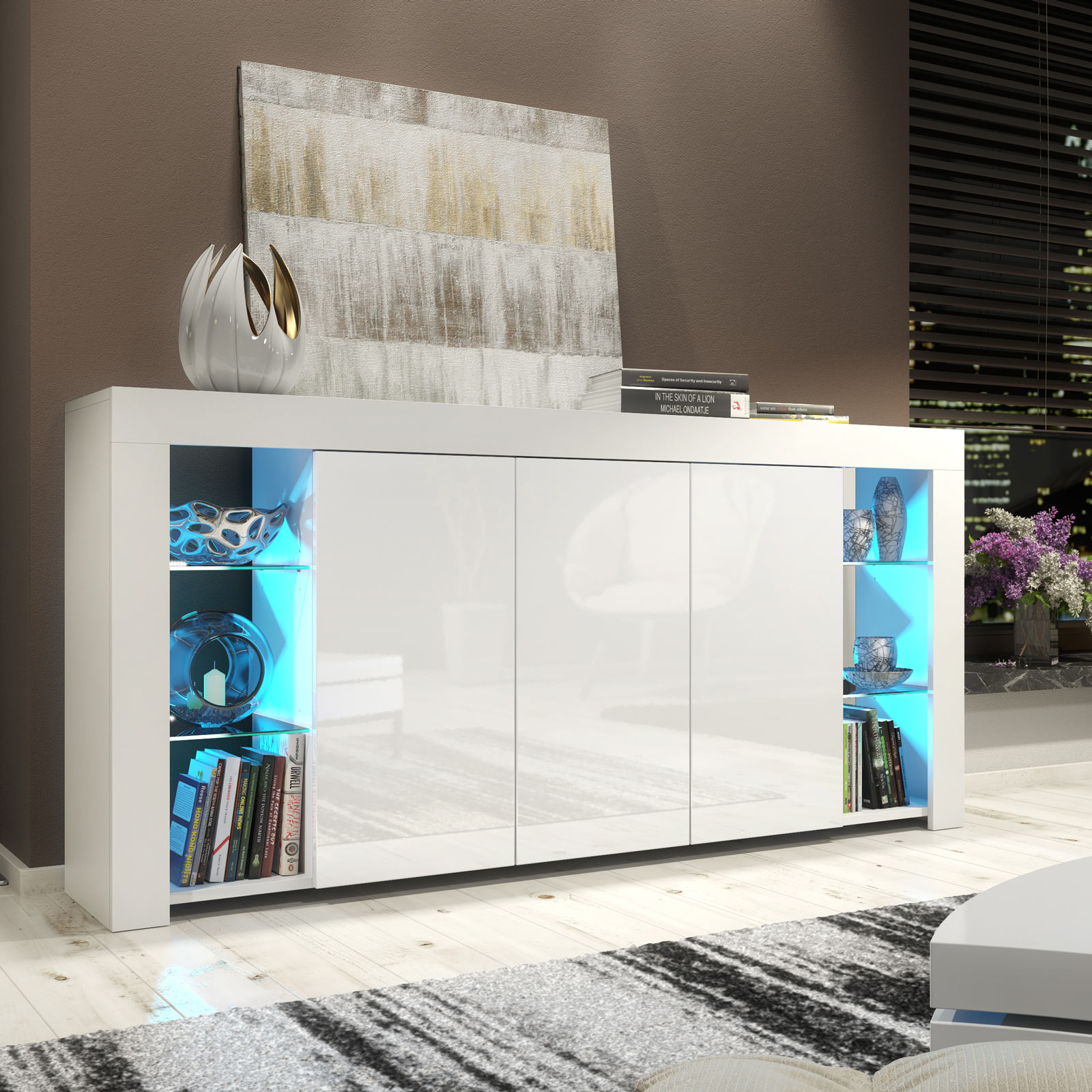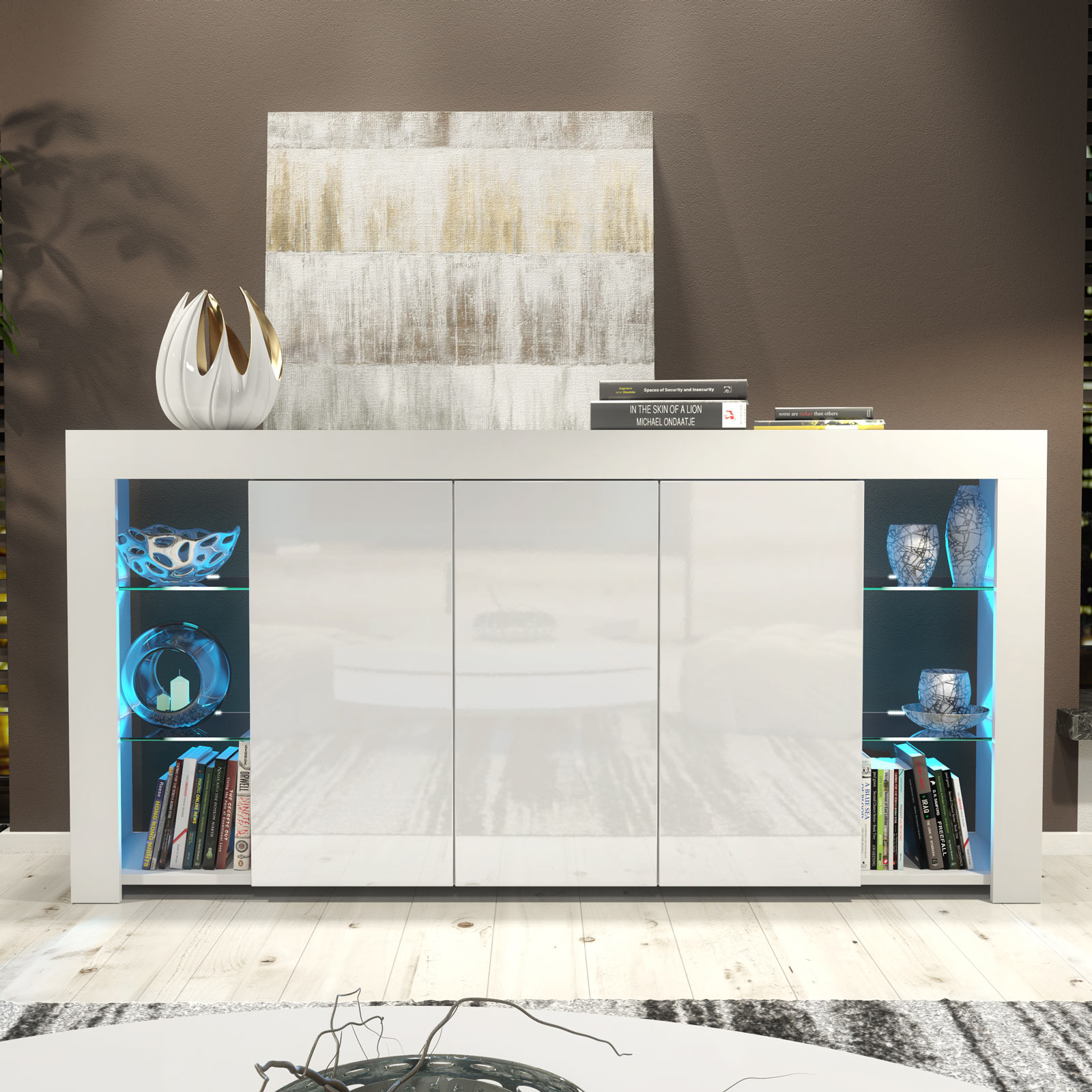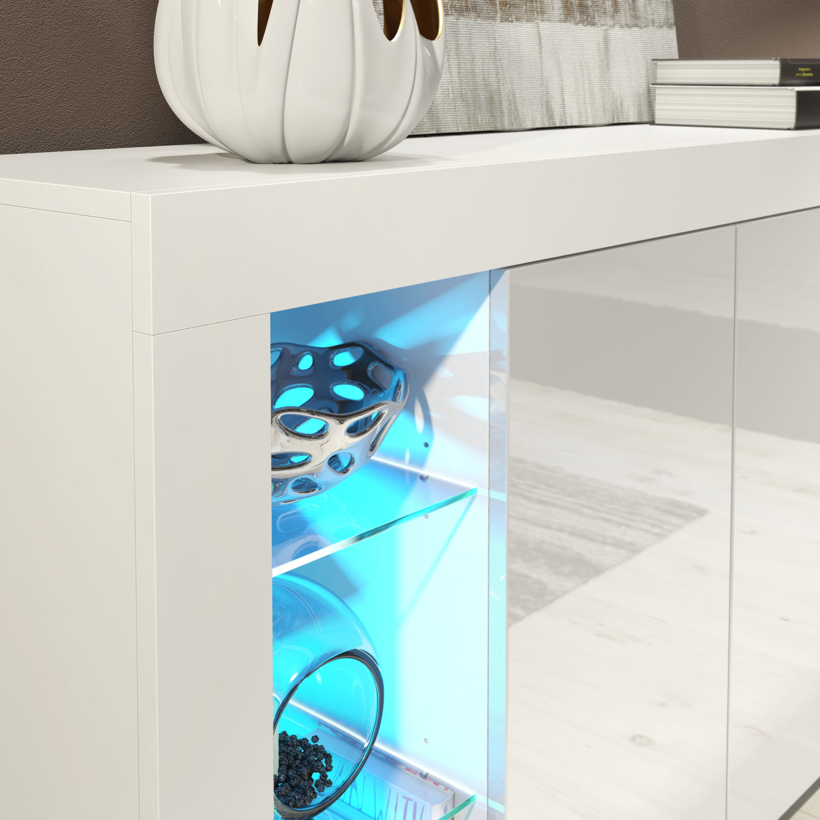Pair with neutral walls, metallic accents, and textured fabrics to enhance the gloss finish. Use the illuminated glass sections to showcase statement décor pieces while keeping everyday items neatly stored behind the central doors for a balanced, modern interior.