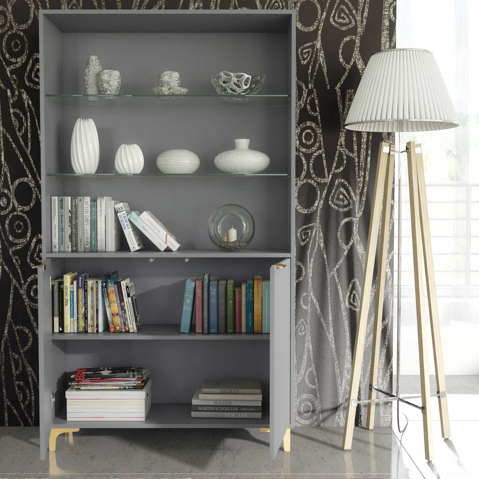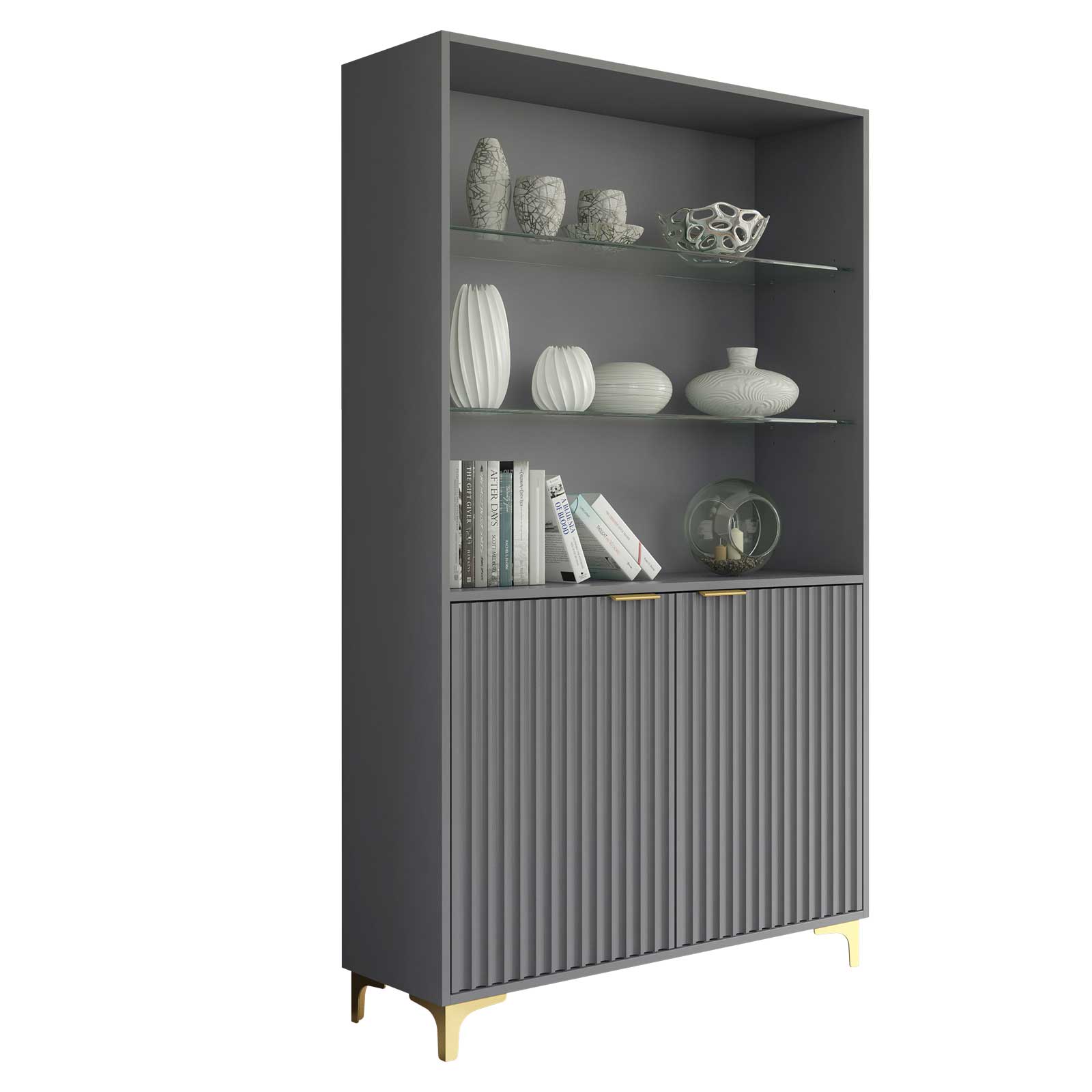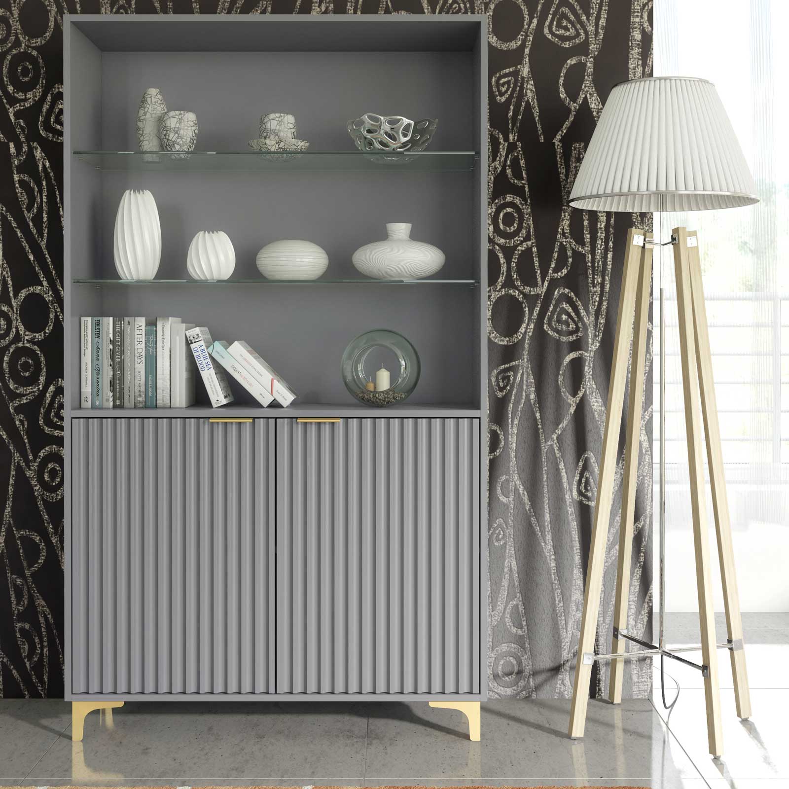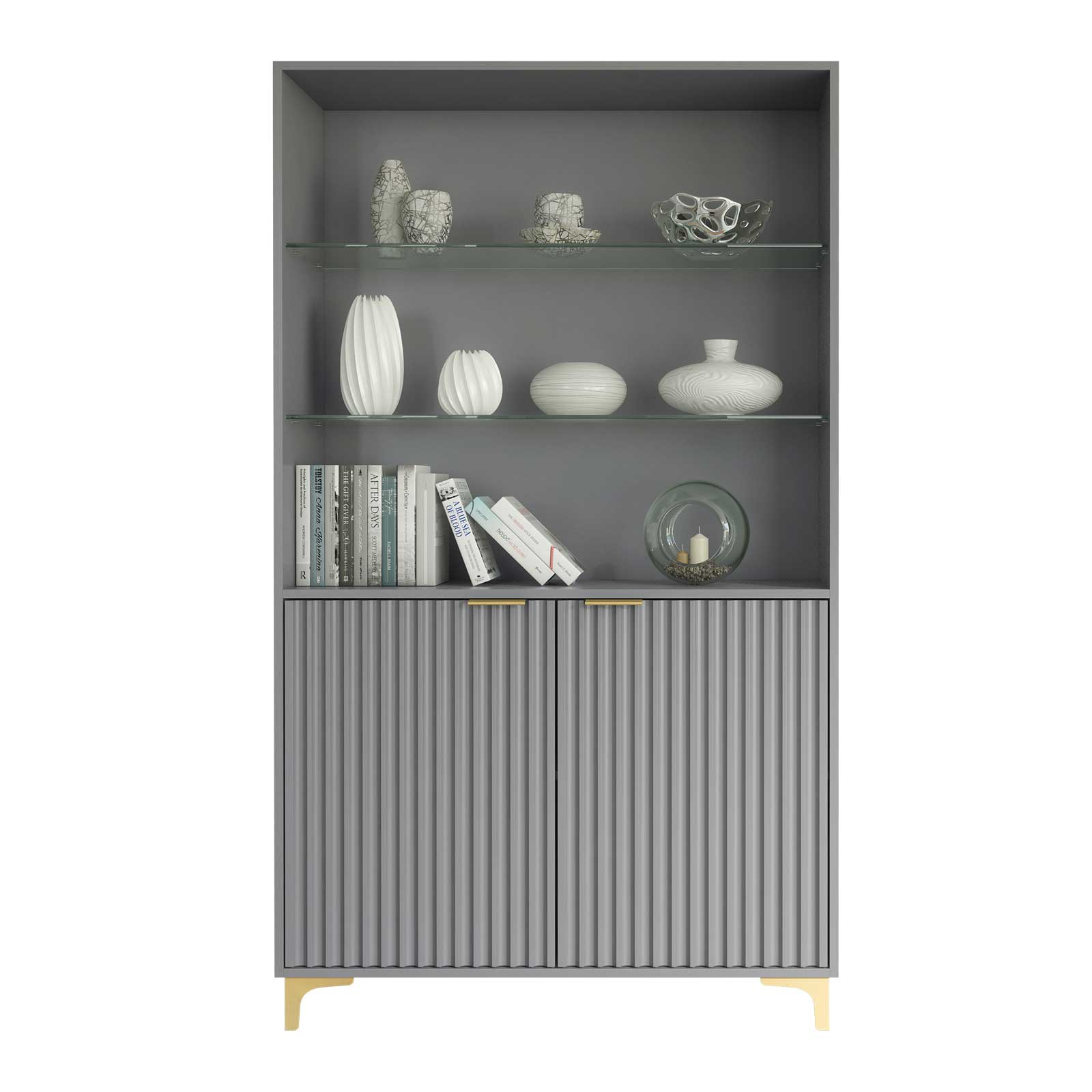 Finished in sophisticated grey, this tall display cabinet features beautifully ribbed (fluted) doors in the lower section. The vertical detailing creates depth and shadow play, giving the unit a premium architectural look while maintaining a clean, contemporary feel.