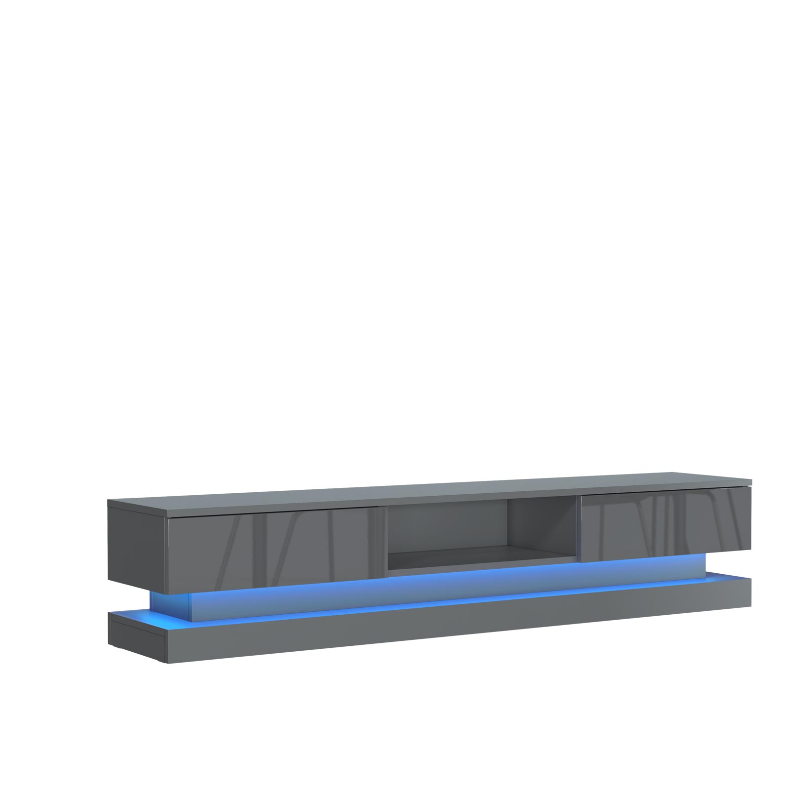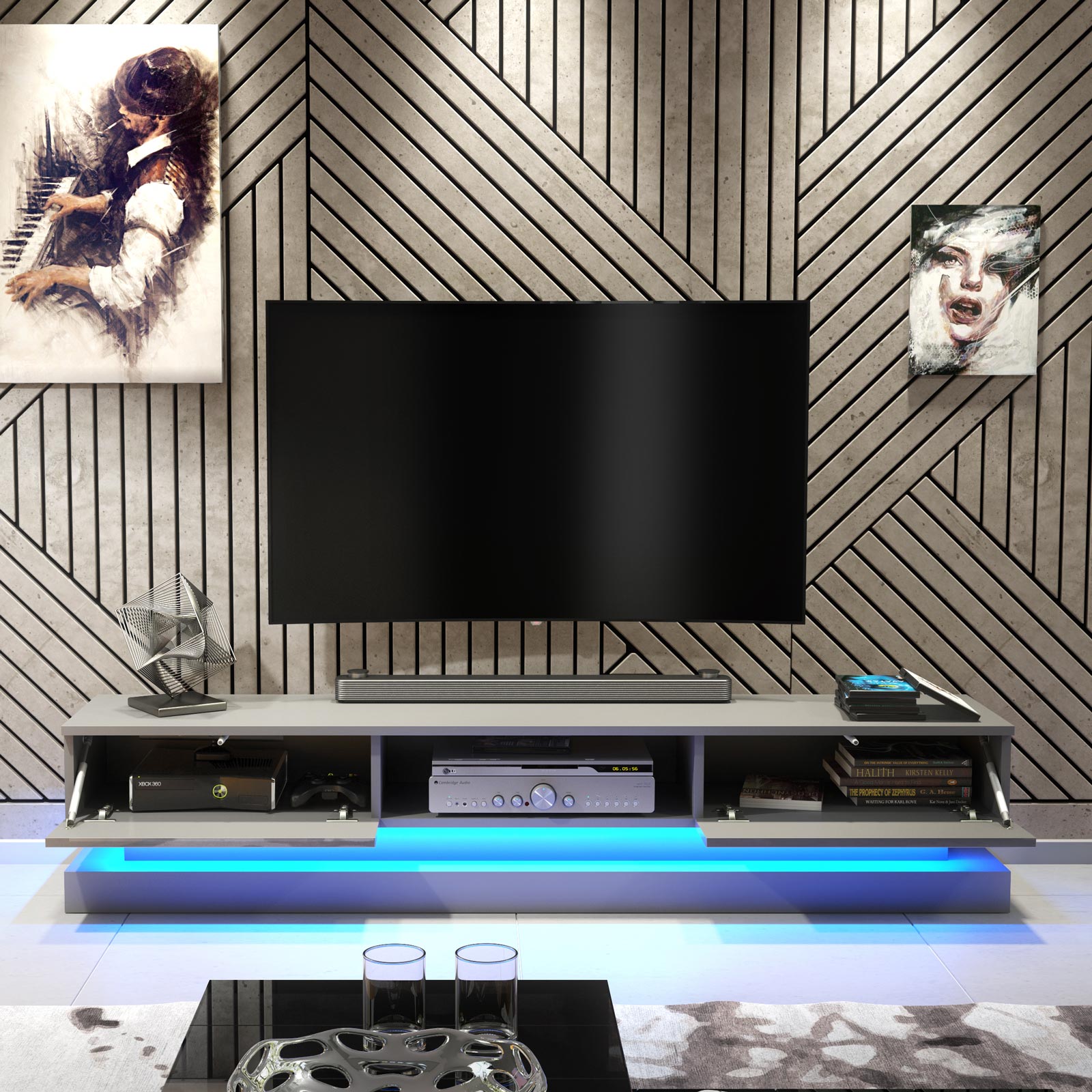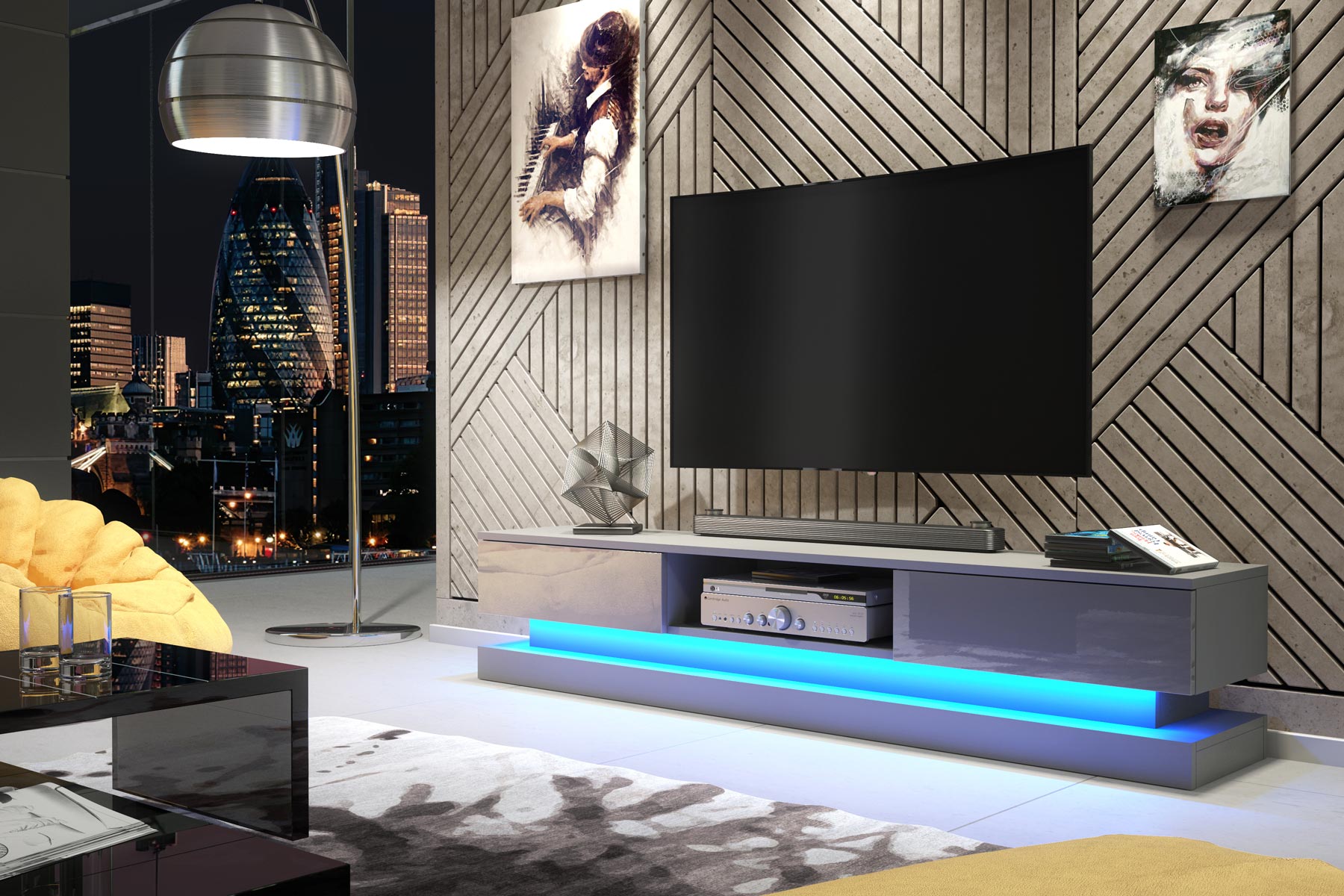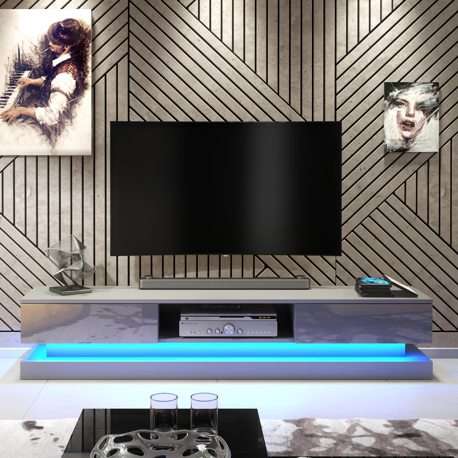 A free LED light strip runs along the full length of the TV unit, adding a soft ambient glow beneath the cabinet. This subtle lighting enhances the floating effect and brings a contemporary atmosphere to the room without overpowering the design.