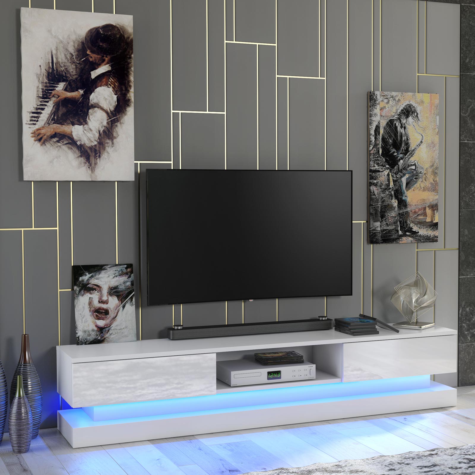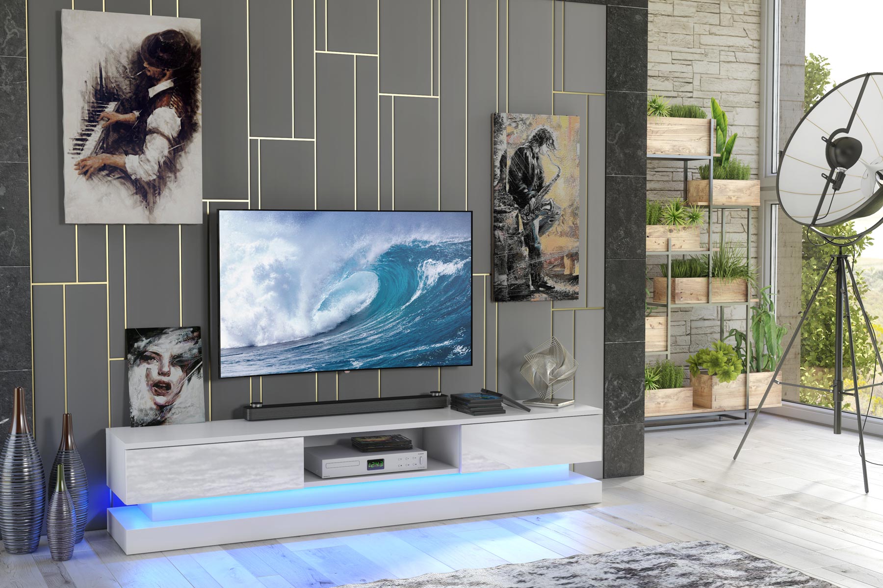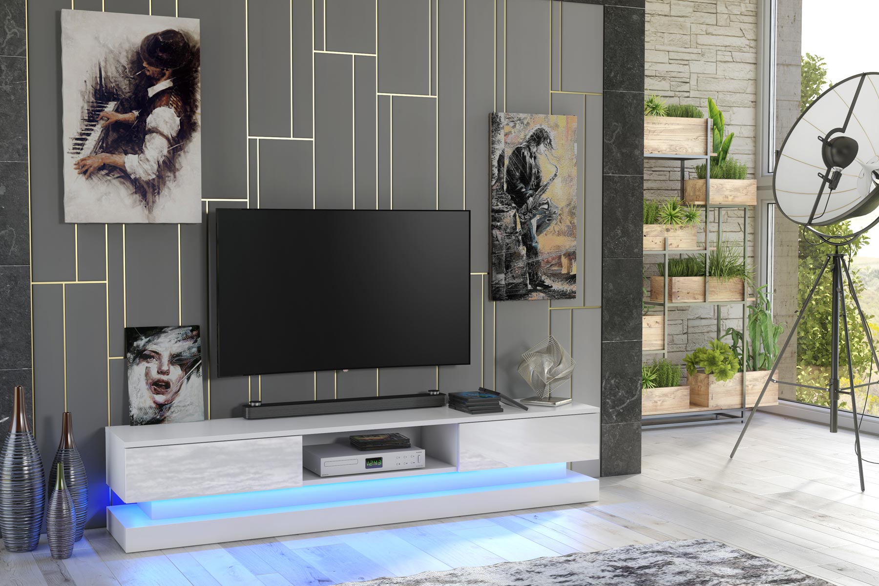 Create a striking modern focal point with this 180cm TV unit in white matt body and white gloss fronts, designed to combine clean aesthetics with practical everyday storage.