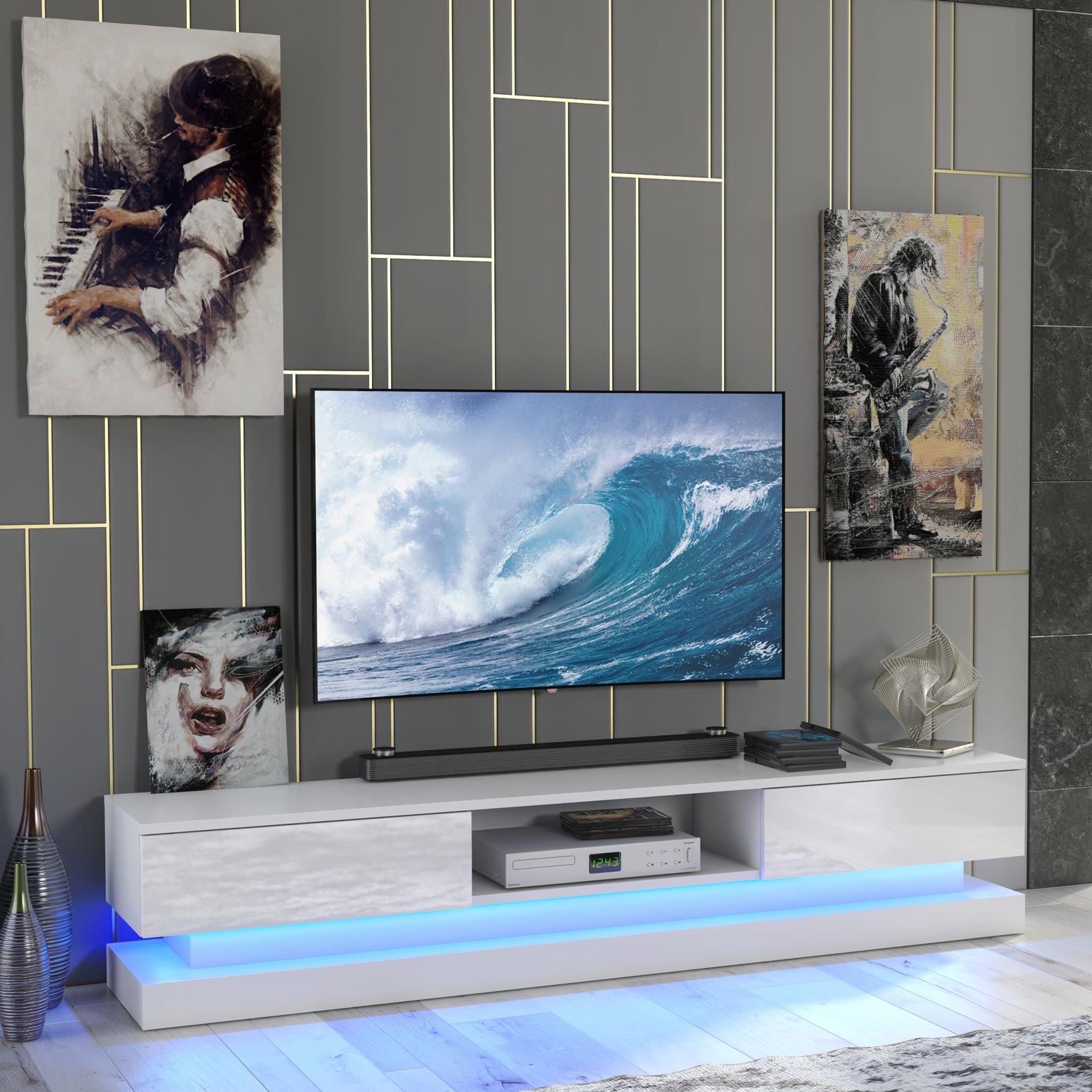 The unit features two push-to-open drop-down doors, offering generous concealed storage for media accessories, remotes, cables, games, or other living room essentials. The handle-free mechanism keeps the front clean, smooth, and visually uninterrupted.