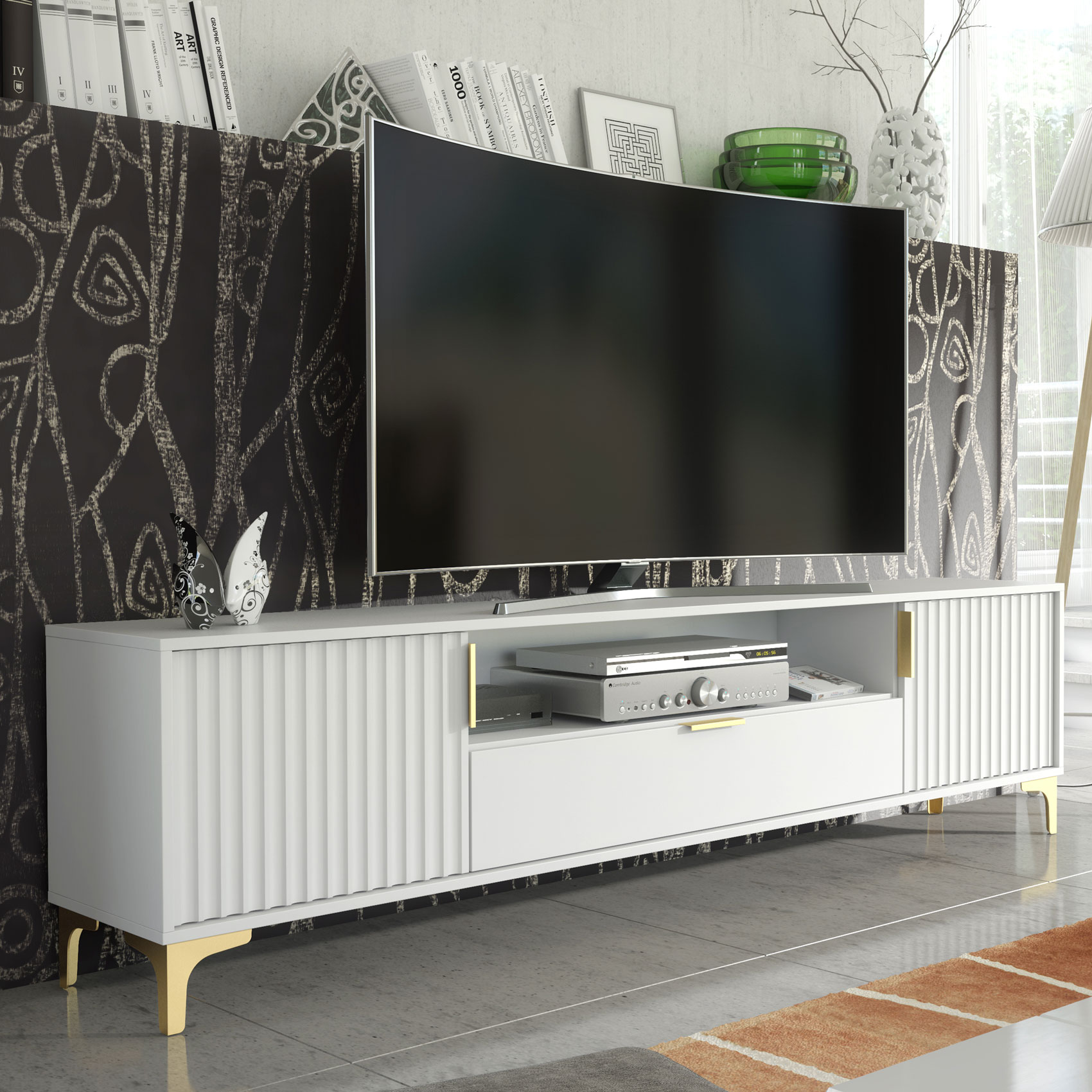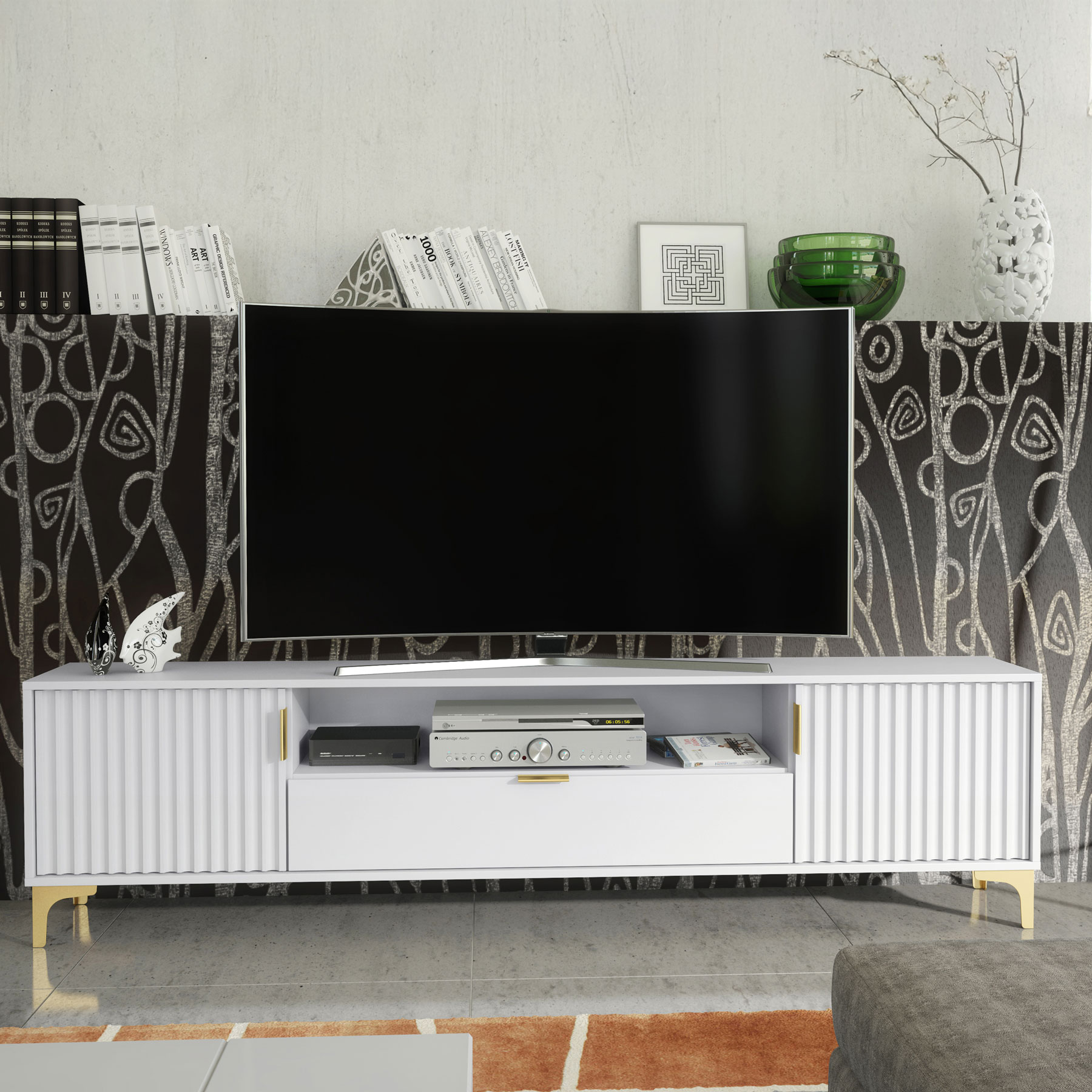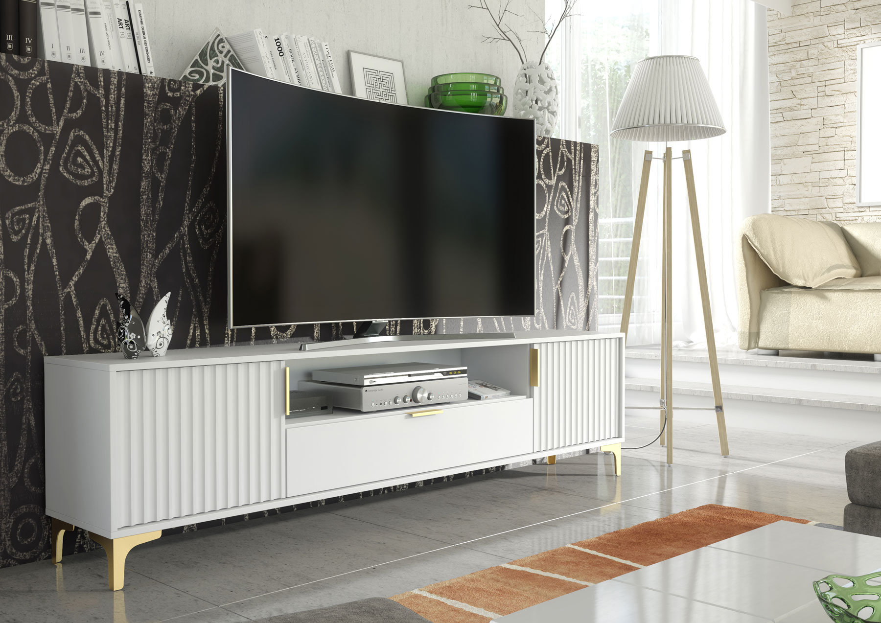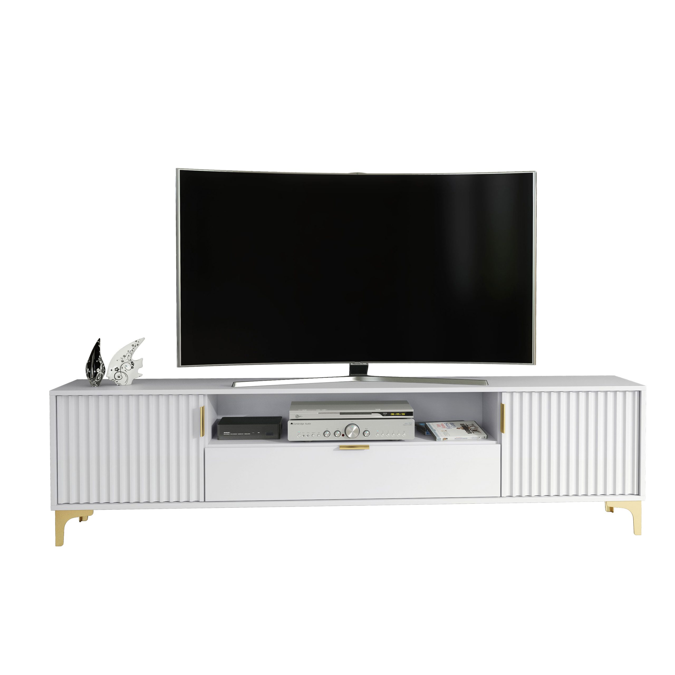 Create a refined focal point in your living room with this 200cm White Fluted TV Unit with Gold Details, designed to combine elegant texture with practical storage.