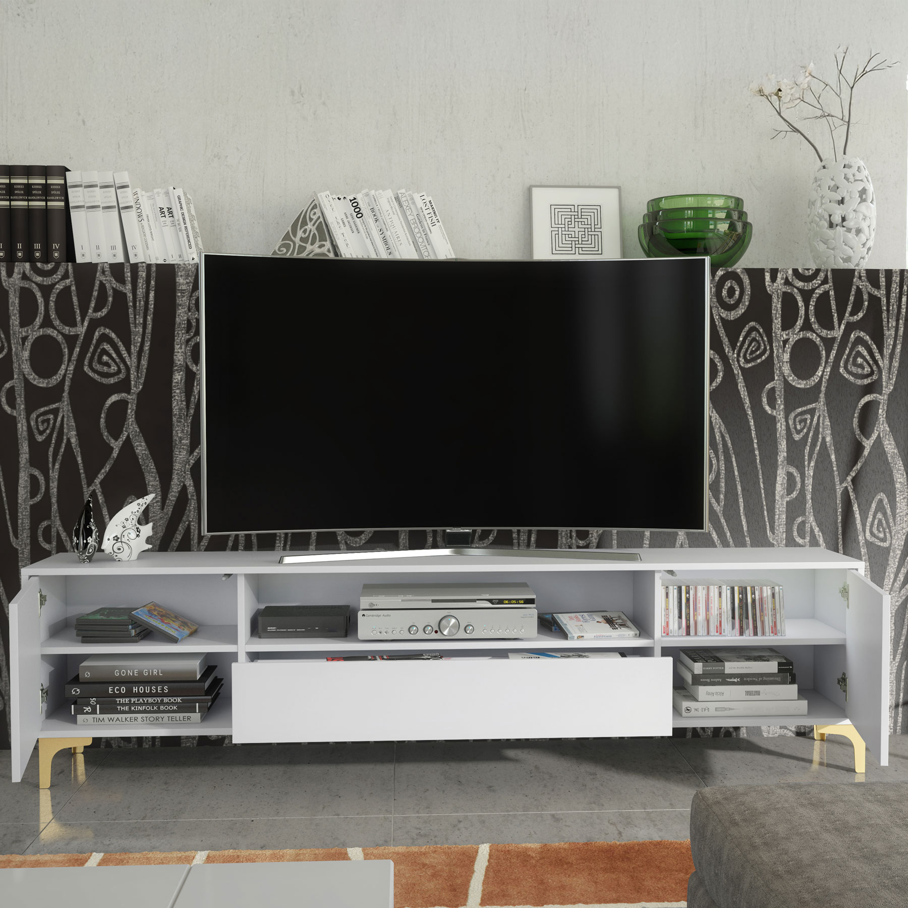 The gold metal legs complete the look, lifting the unit visually and adding a warm contrast against the crisp white finish.