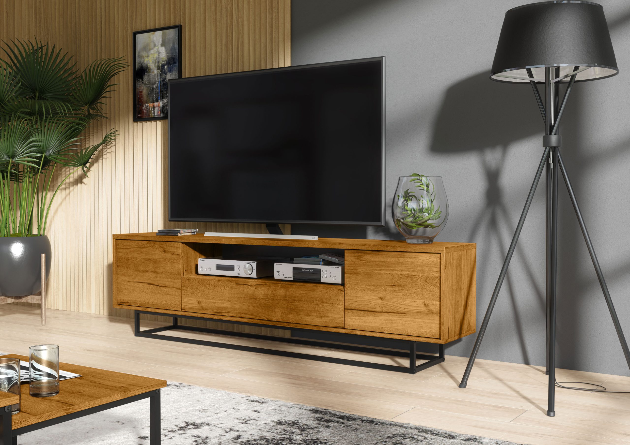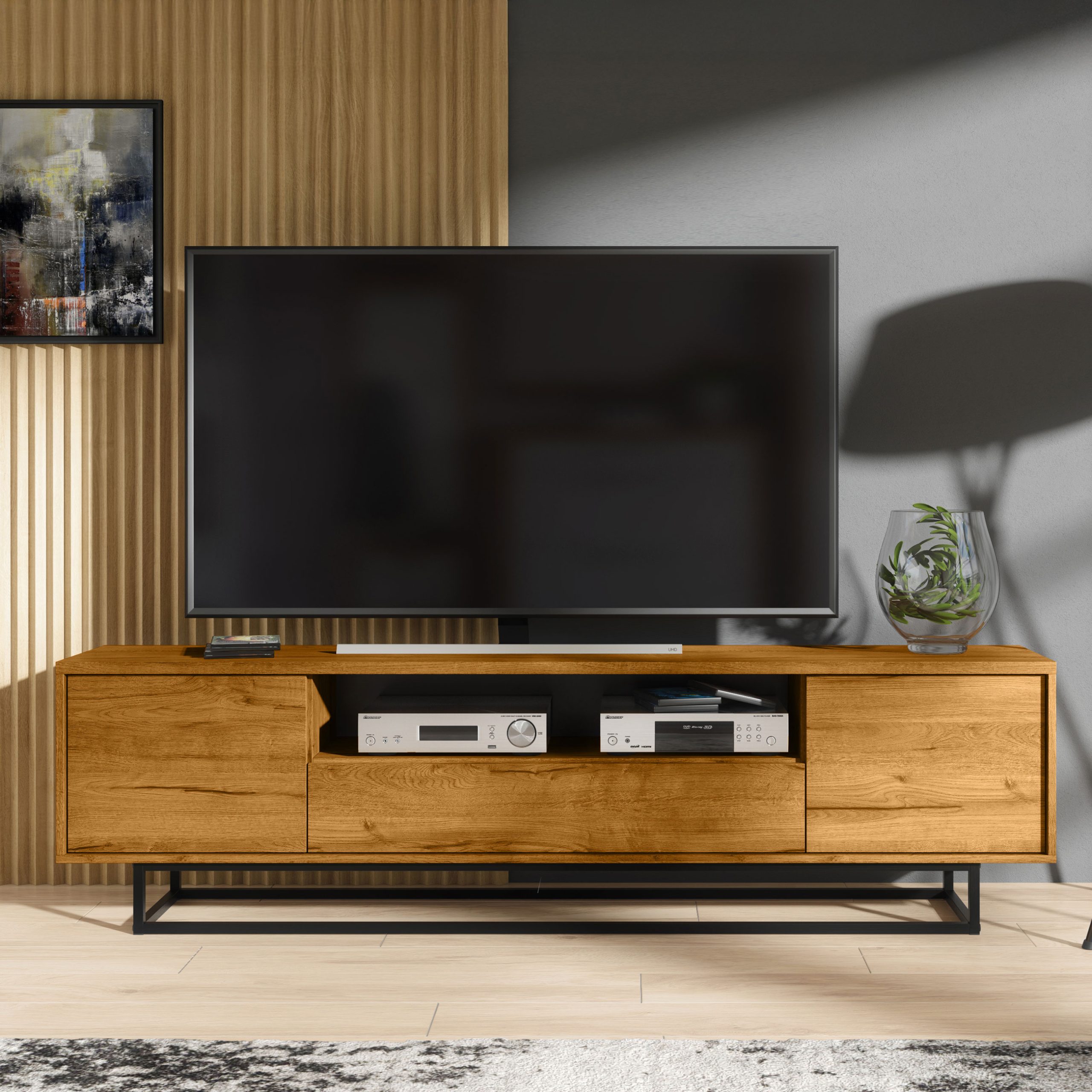 Bring warmth and industrial character into your living space with this striking 200cm Oak Matt TV unit set on a sleek black metal frame. Combining natural wood tones with a bold architectural base, this contemporary media cabinet is designed to make a confident statement in modern interiors.