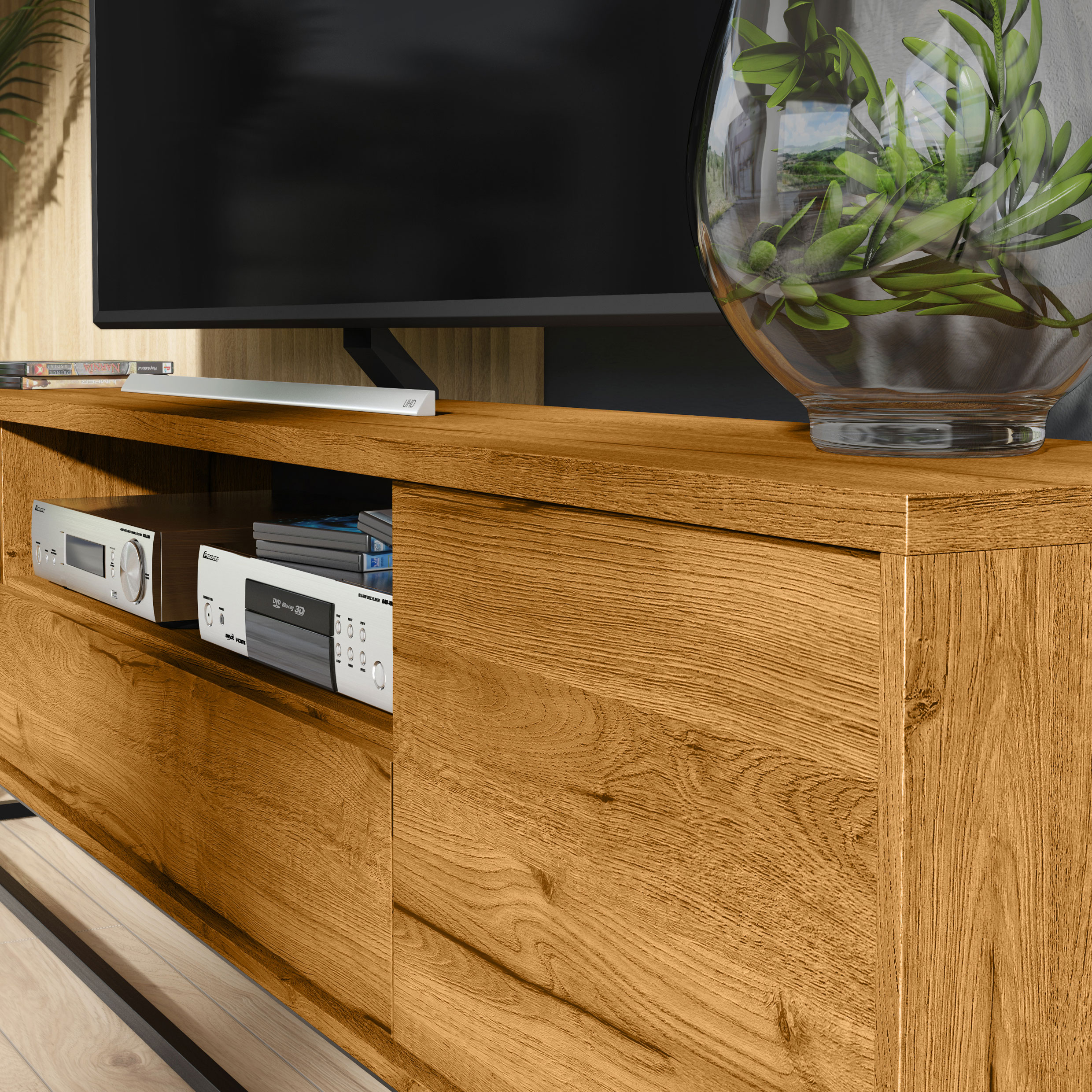 Crafted from durable MDF and chipboard, this TV unit is built for everyday reliability while maintaining a refined, high-end appearance. Its generous 200cm width makes it perfect for large TVs and full entertainment systems.
