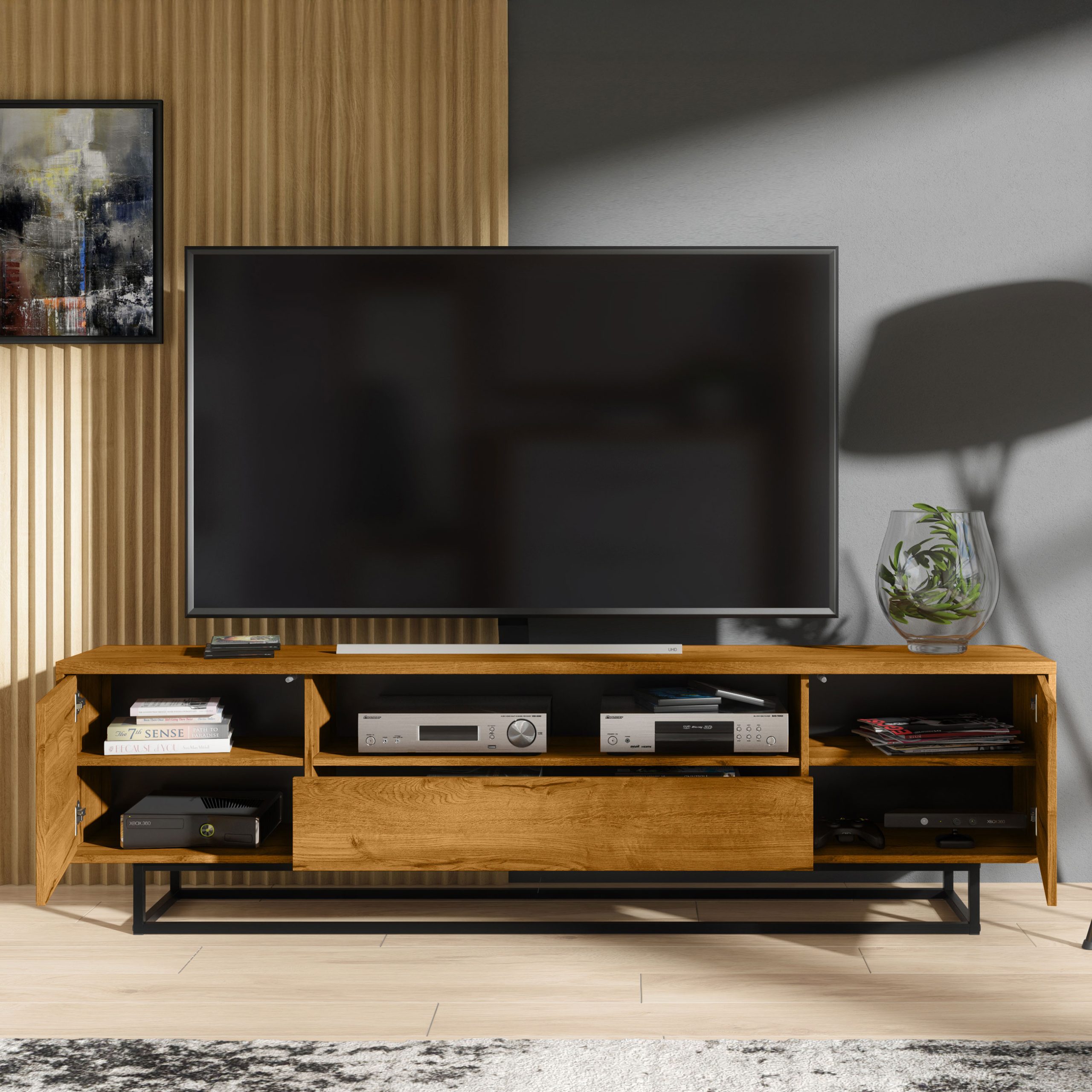 On both sides, the unit features push-to-open doors, offering practical concealed storage for everyday living room essentials. Inside, shelving provides organised space for consoles, accessories, and additional equipment, keeping your setup neat and clutter-free.