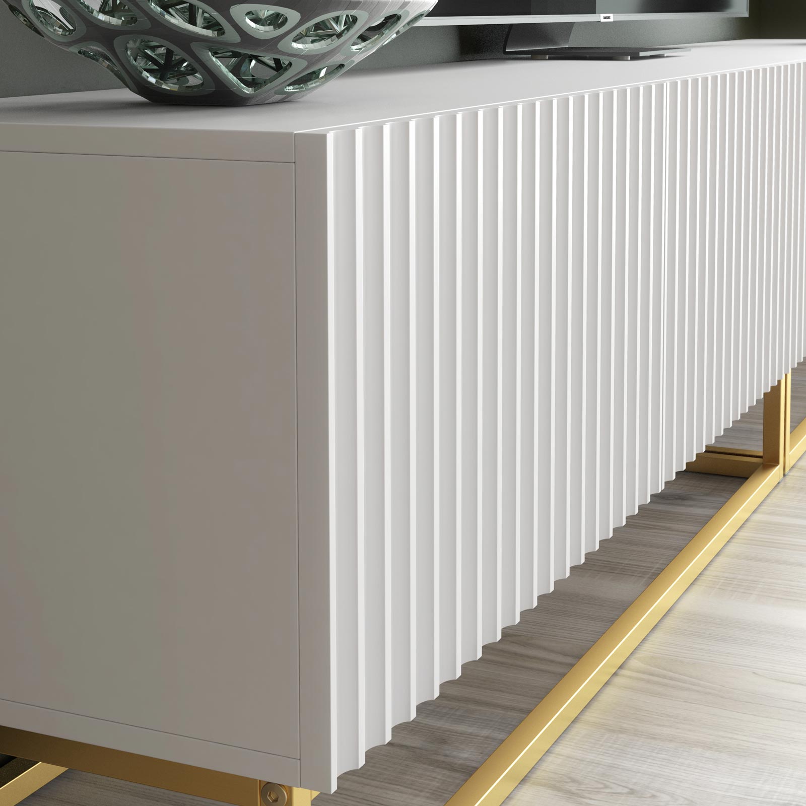 Designed for elegant modern interiors, this piece features textured ribbed (fluted) front panels that add depth, structure and subtle architectural detail while maintaining a clean minimalist silhouette.