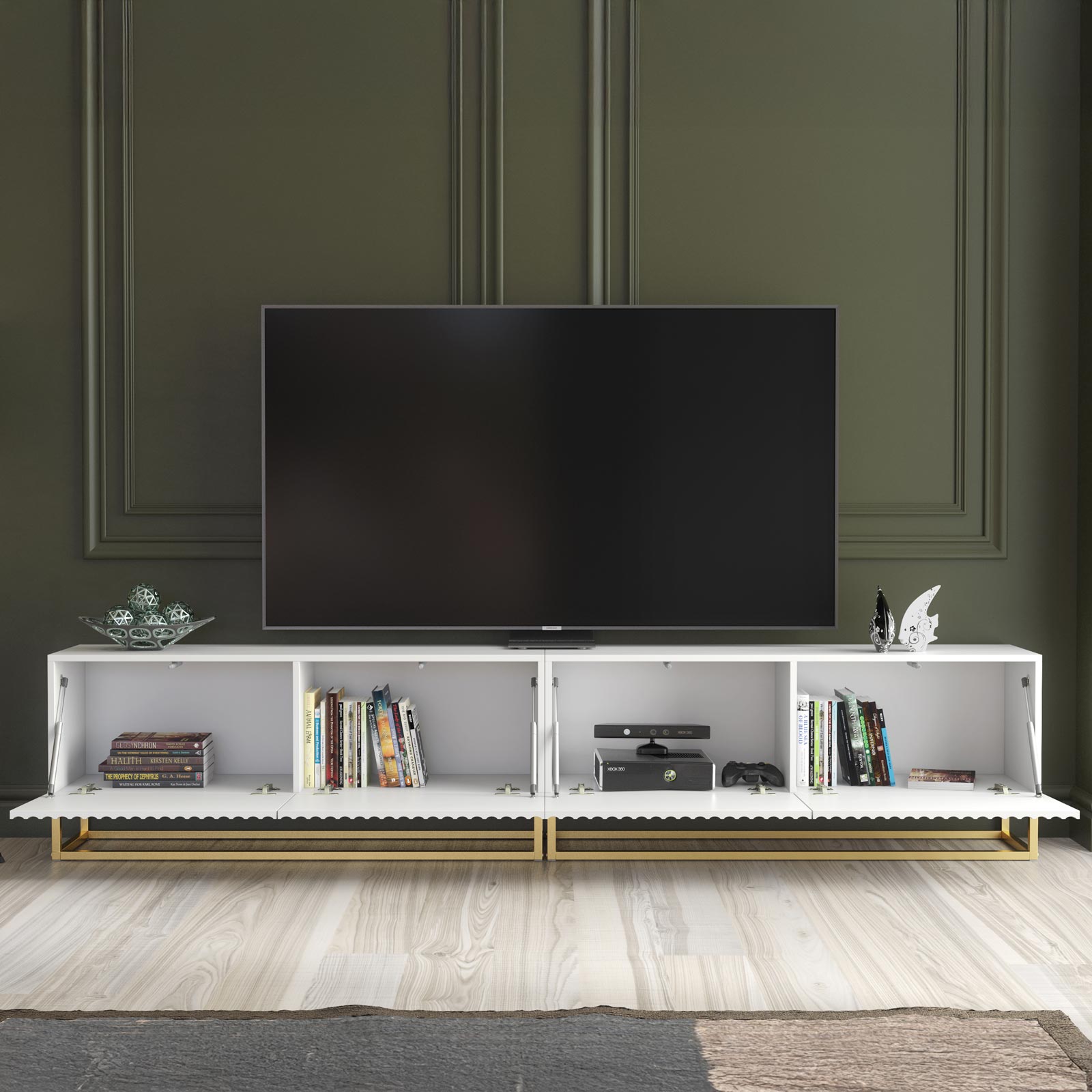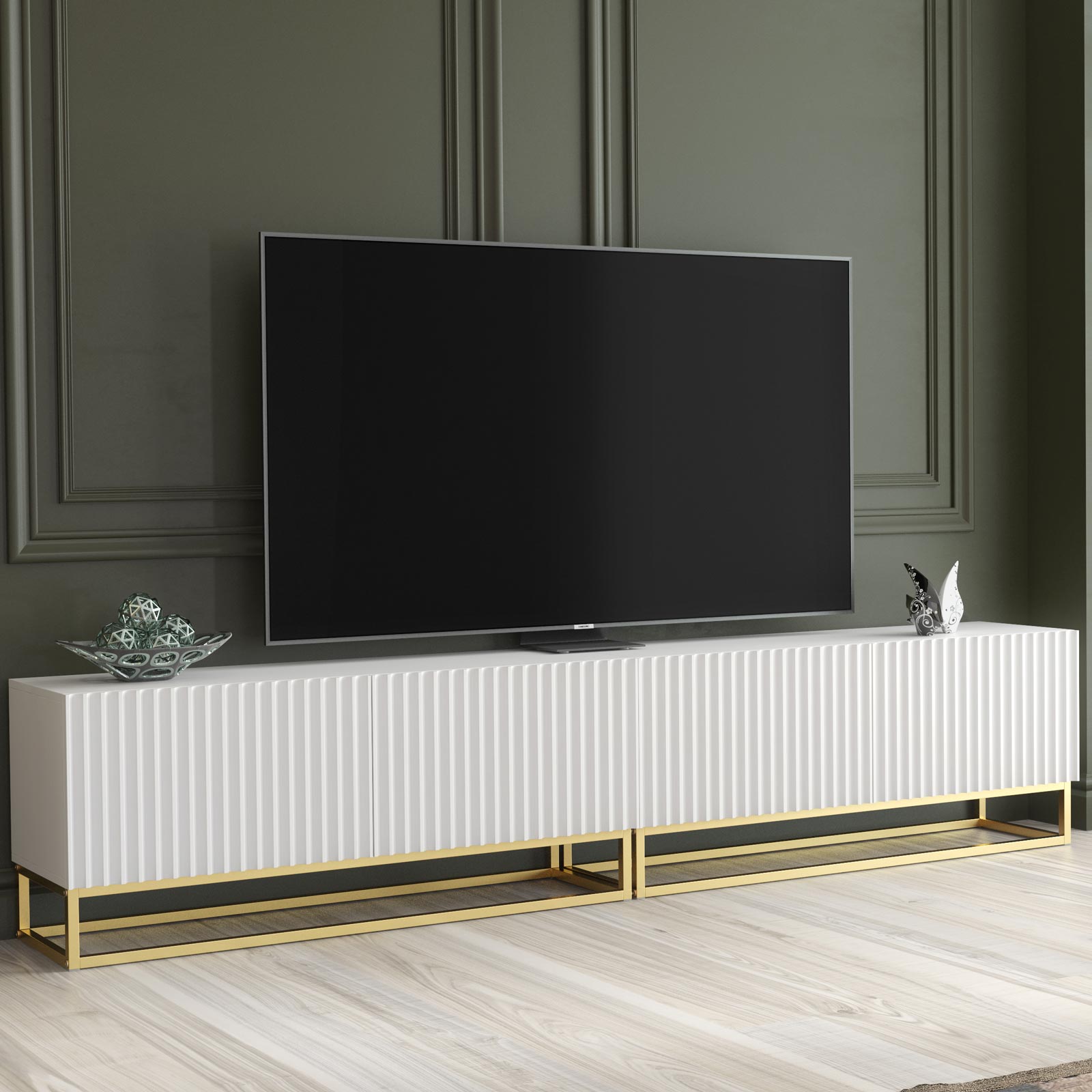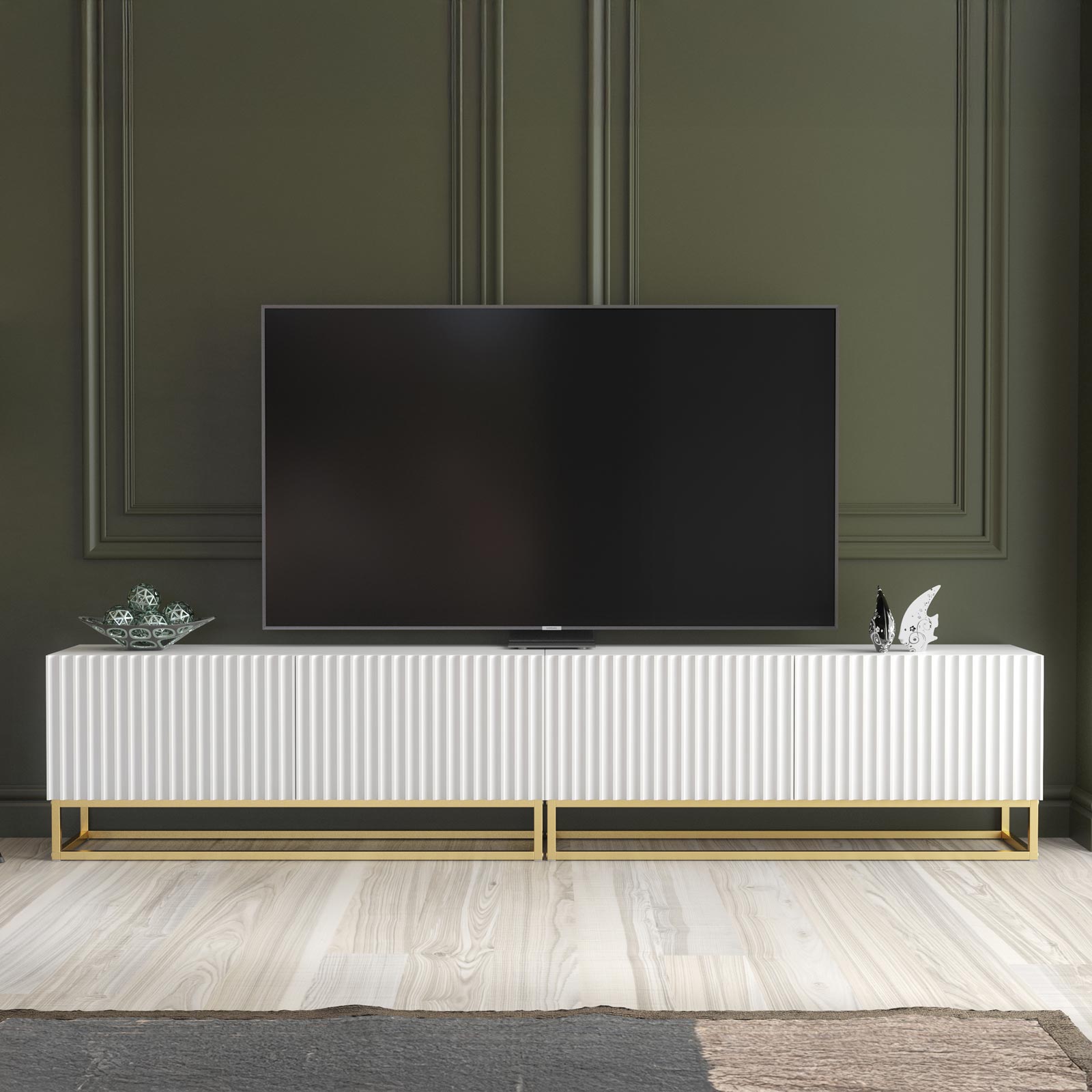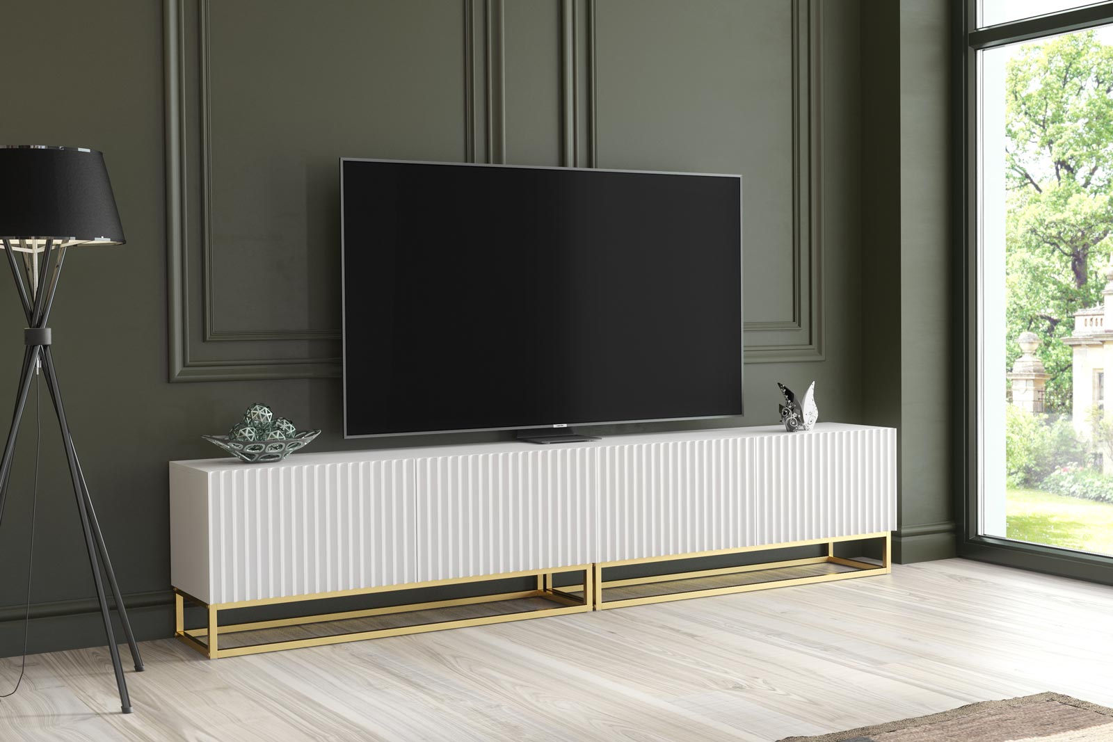 Pair with neutral walls, gold lighting accents and soft textured fabrics to enhance the elegant white and gold contrast. Add sculptural décor or statement artwork above the unit to emphasise the linear 200cm width and create a balanced contemporary media wall.