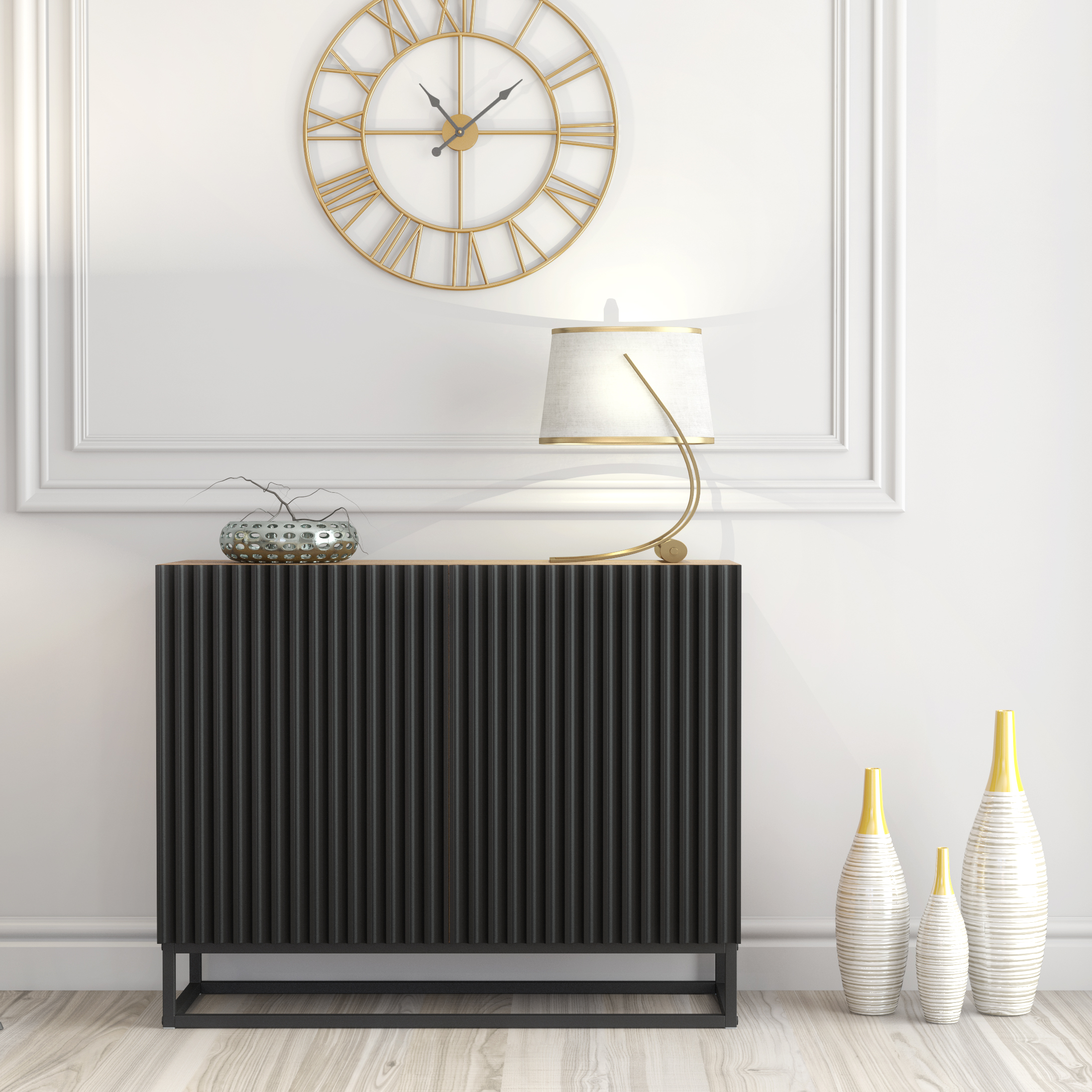 Set on a sleek black steel frame, the sideboard offers excellent stability while maintaining a light, architectural appearance. Every detail — from the precision fluted fronts to the harmonious oak and black colour palette — has been thoughtfully designed to elevate your interior without overpowering it.