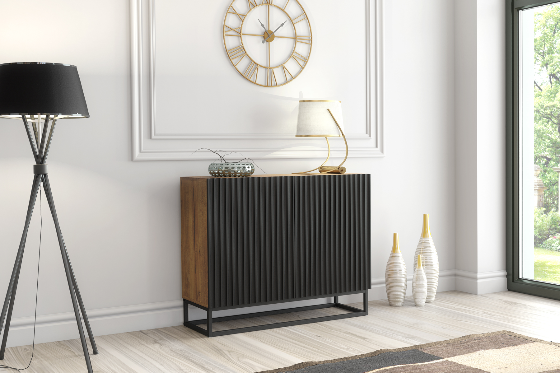 Elevate your interior with this striking 100cm Oak & Black fluted sideboard — a premium designer statement created for modern interiors that value both refined style and everyday functionality. Designed by Olivia Furniture, this compact cabinet delivers the same high-end aesthetic as larger statement pieces, making it ideal for contemporary living rooms, dining spaces, hallways, or stylish home offices.