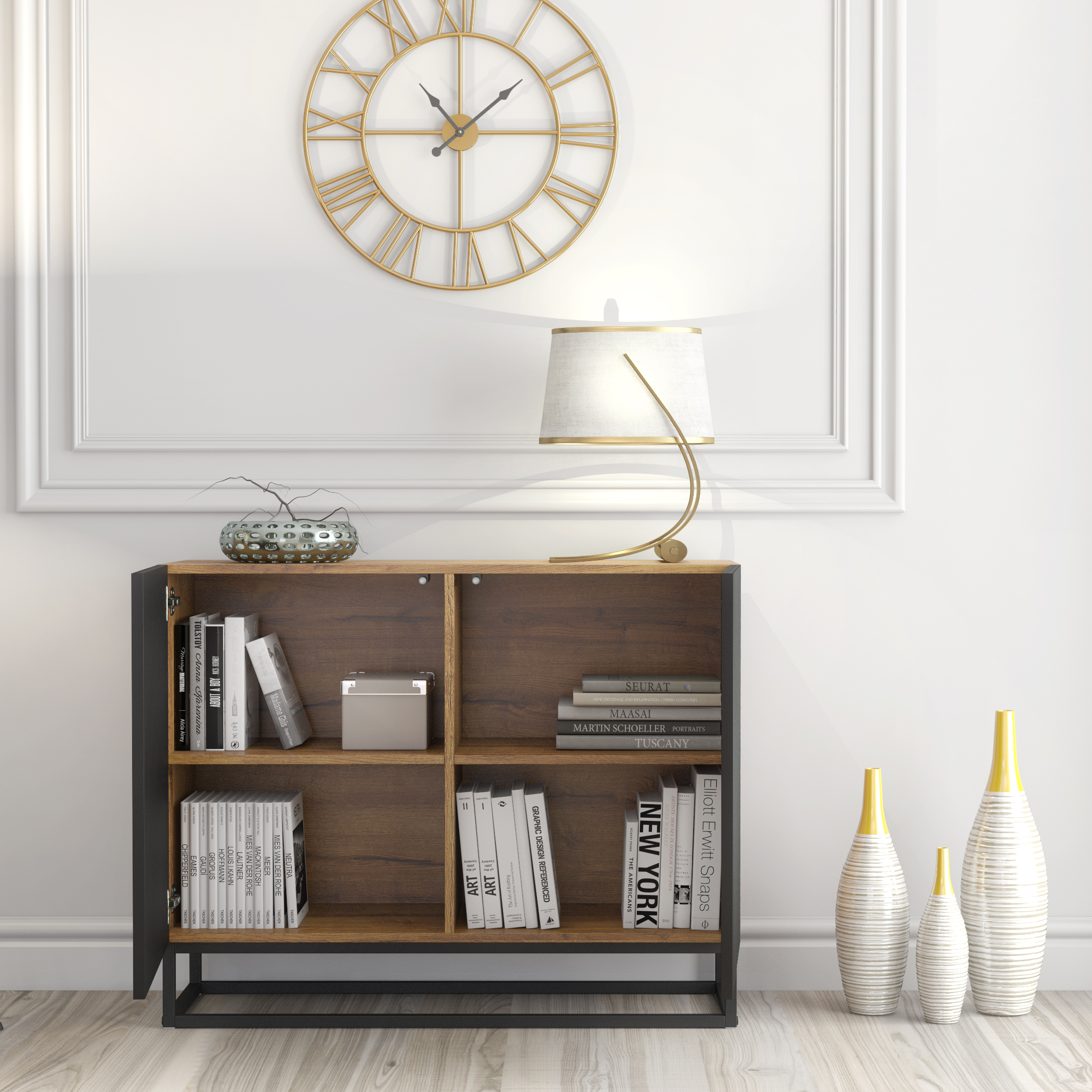 Behind the two soft-opening fluted doors, you’ll find a practical internal shelving layout that provides generous storage for books, tableware, decorative items, documents, or everyday essentials. The concealed storage keeps your space organised while maintaining the calm, clutter-free aesthetic that defines modern luxury interiors.