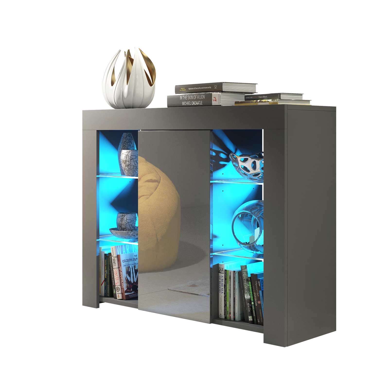 On both sides, the cabinet features glass display sections with four internal glass shelves in total. Free LED lights illuminate these compartments, highlighting decorative pieces, books or ornaments while adding a stylish ambient glow to your room.