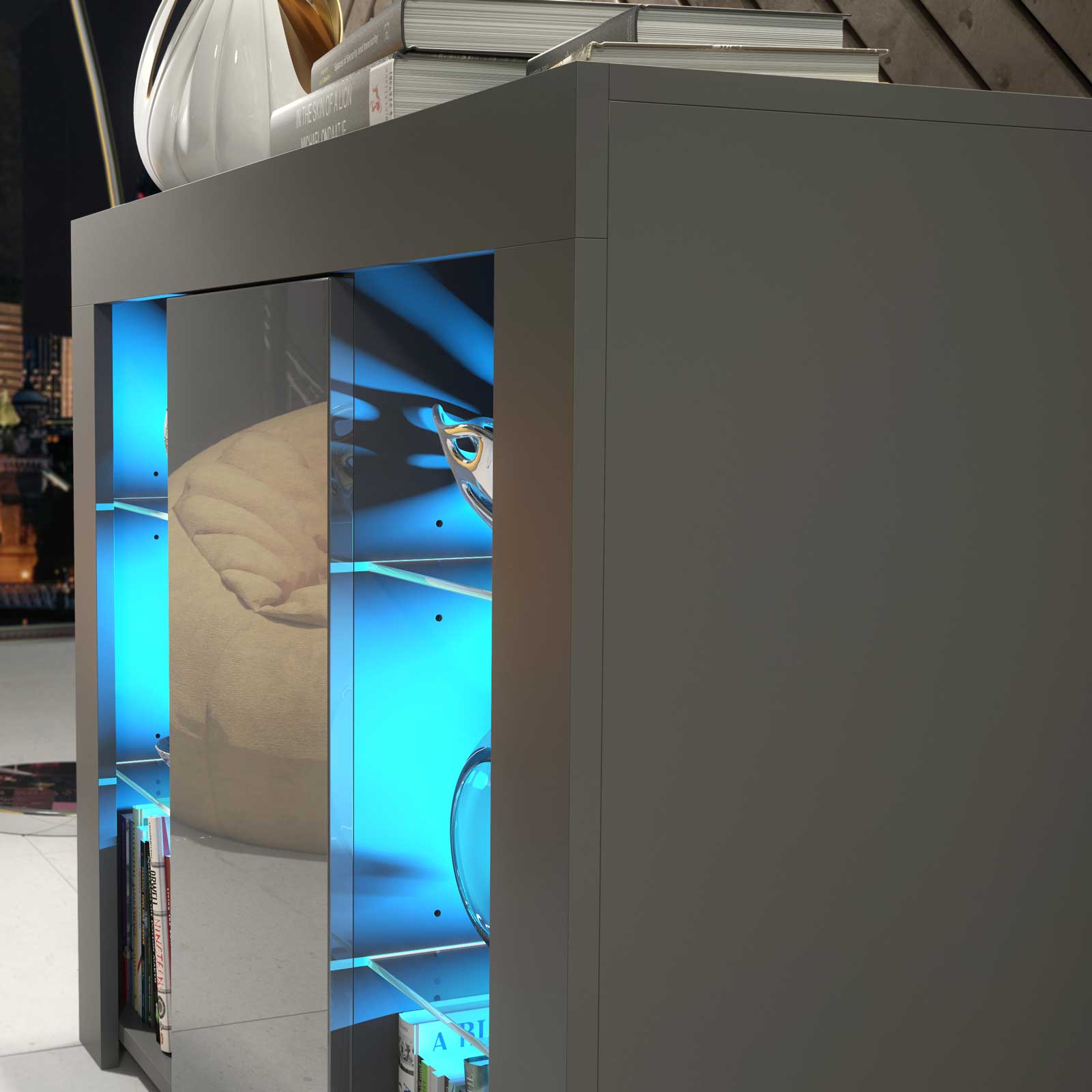 Style with soft lighting, textured fabrics and metallic accessories to enhance the contrast between the matt body and gloss door. Keep décor minimal inside the illuminated sections to let the clean geometry and subtle LED glow stand out.