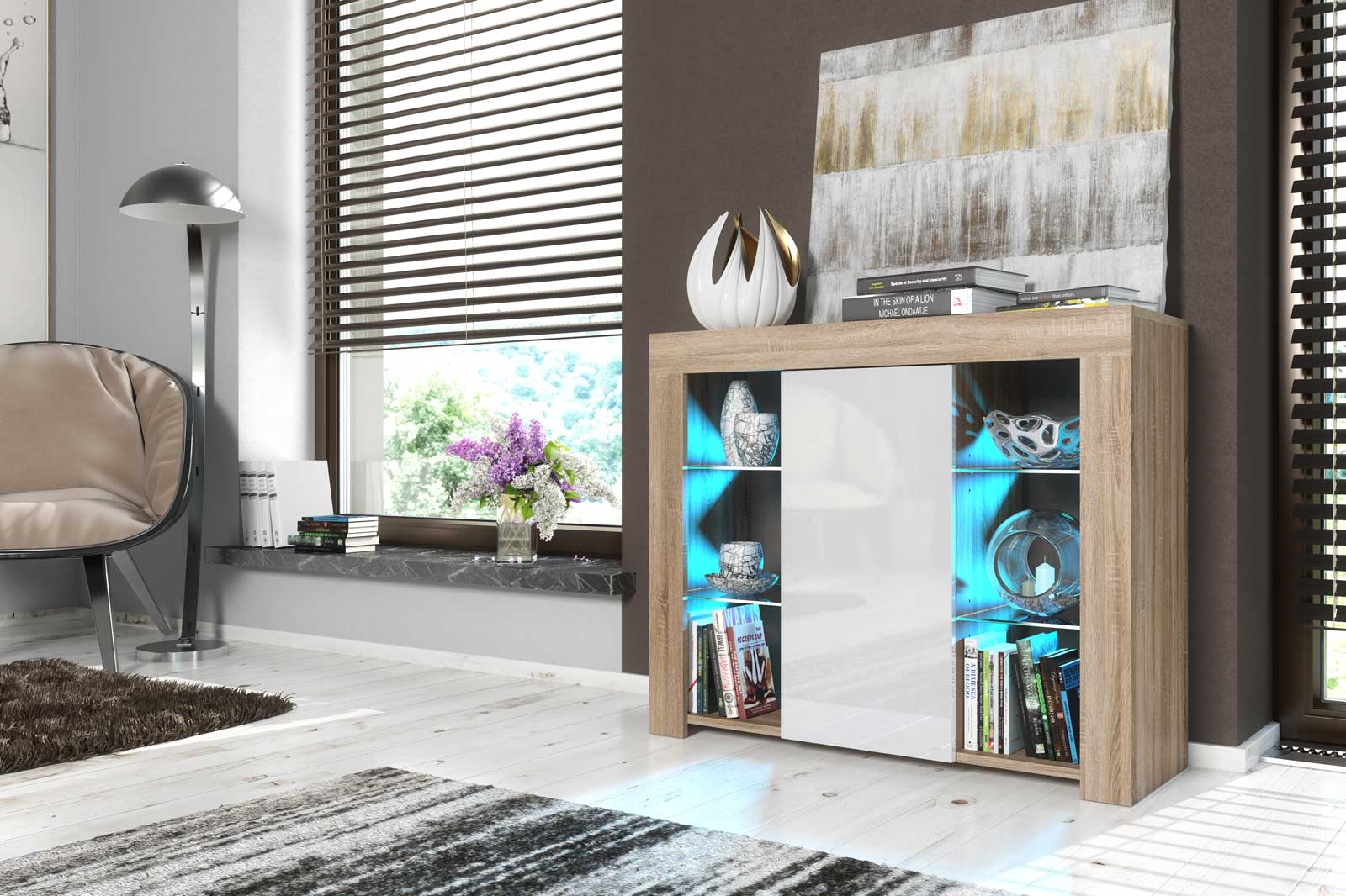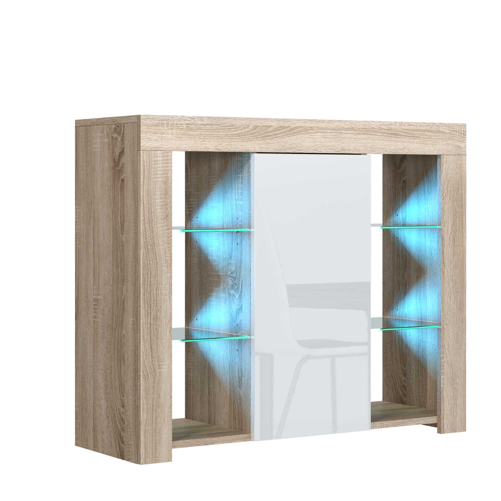 Add warmth and contemporary elegance to your space with this stylish 97cm sideboard. Combining natural oak tones with a clean white gloss finish, this compact yet practical unit delivers both display impact and everyday storage.