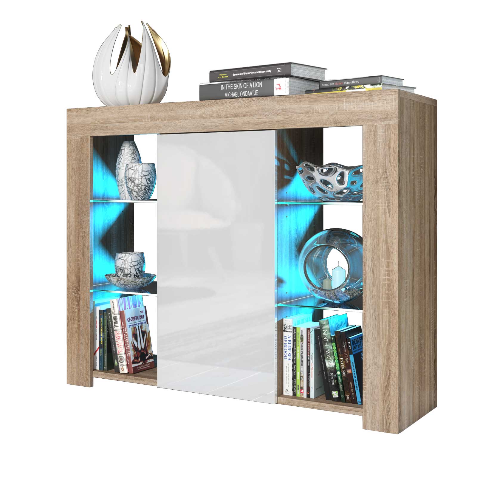 Pair with neutral walls and natural textures such as woven rugs or wooden accents to enhance the warmth of the oak finish. Use the illuminated glass sections to display ceramics or metallic décor for a balanced, modern aesthetic.