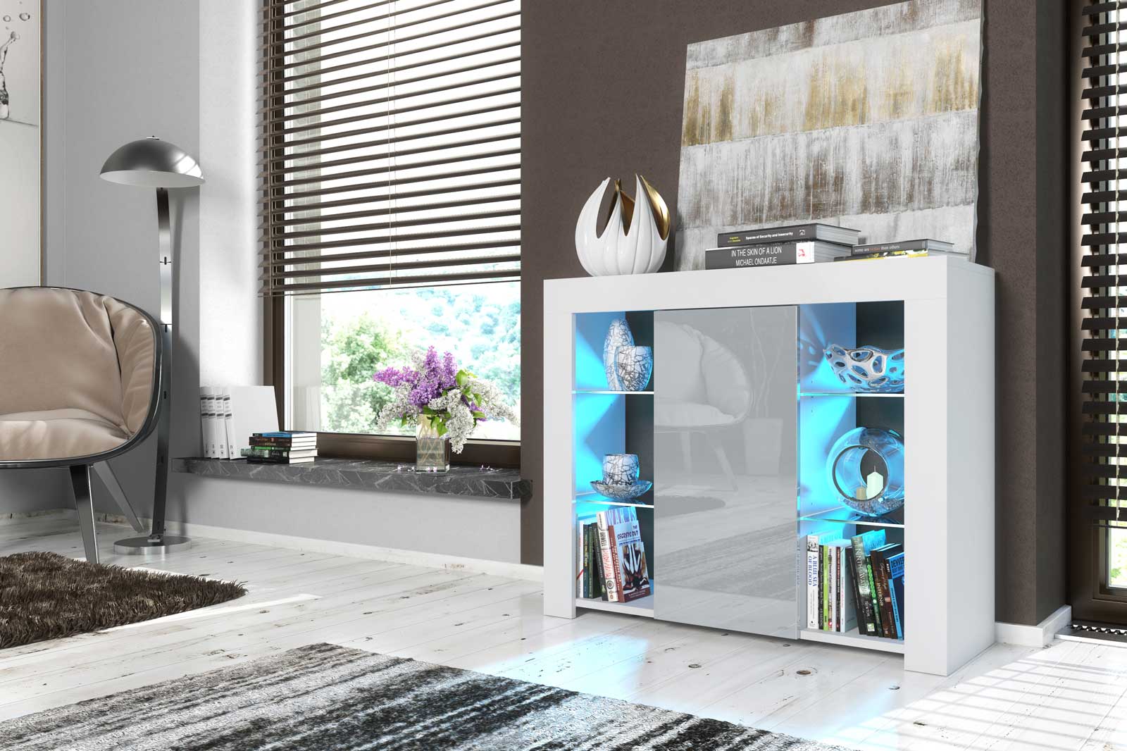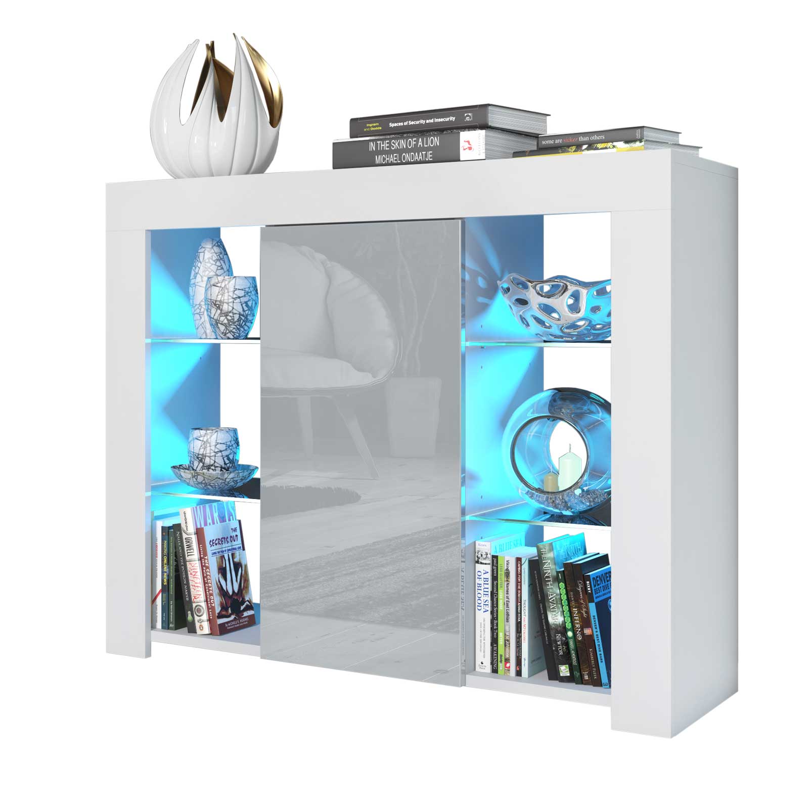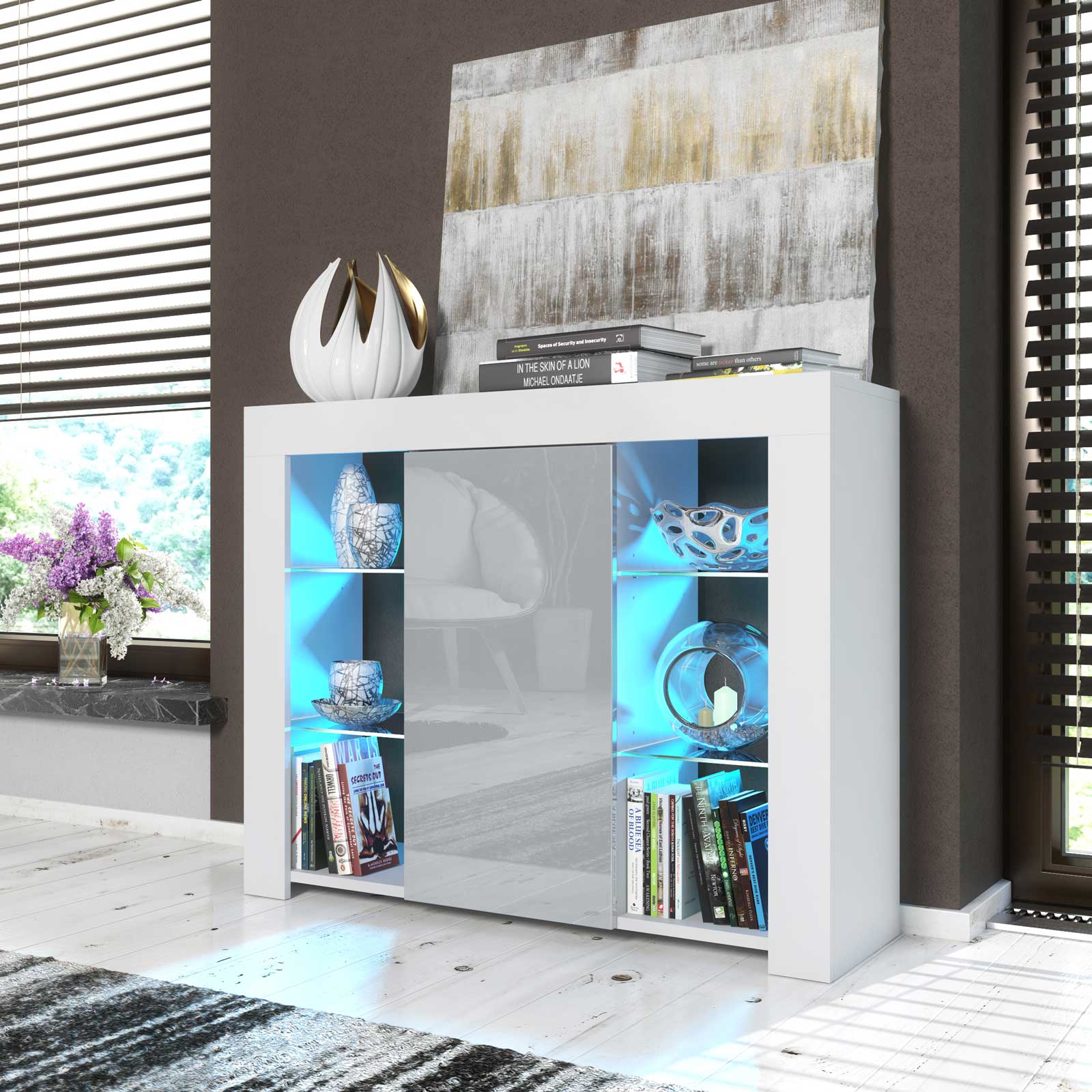 Use the illuminated glass sections to highlight statement décor pieces in cool tones to complement the grey gloss door. Keep the top surface minimal with a single sculpture or vase to maintain a balanced, modern look.