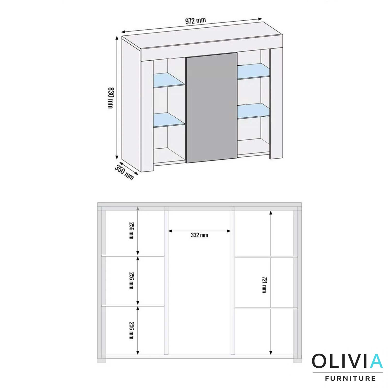 Behind the central grey gloss door, an internal shelf provides practical hidden storage for everyday essentials, helping keep your space tidy and organised.