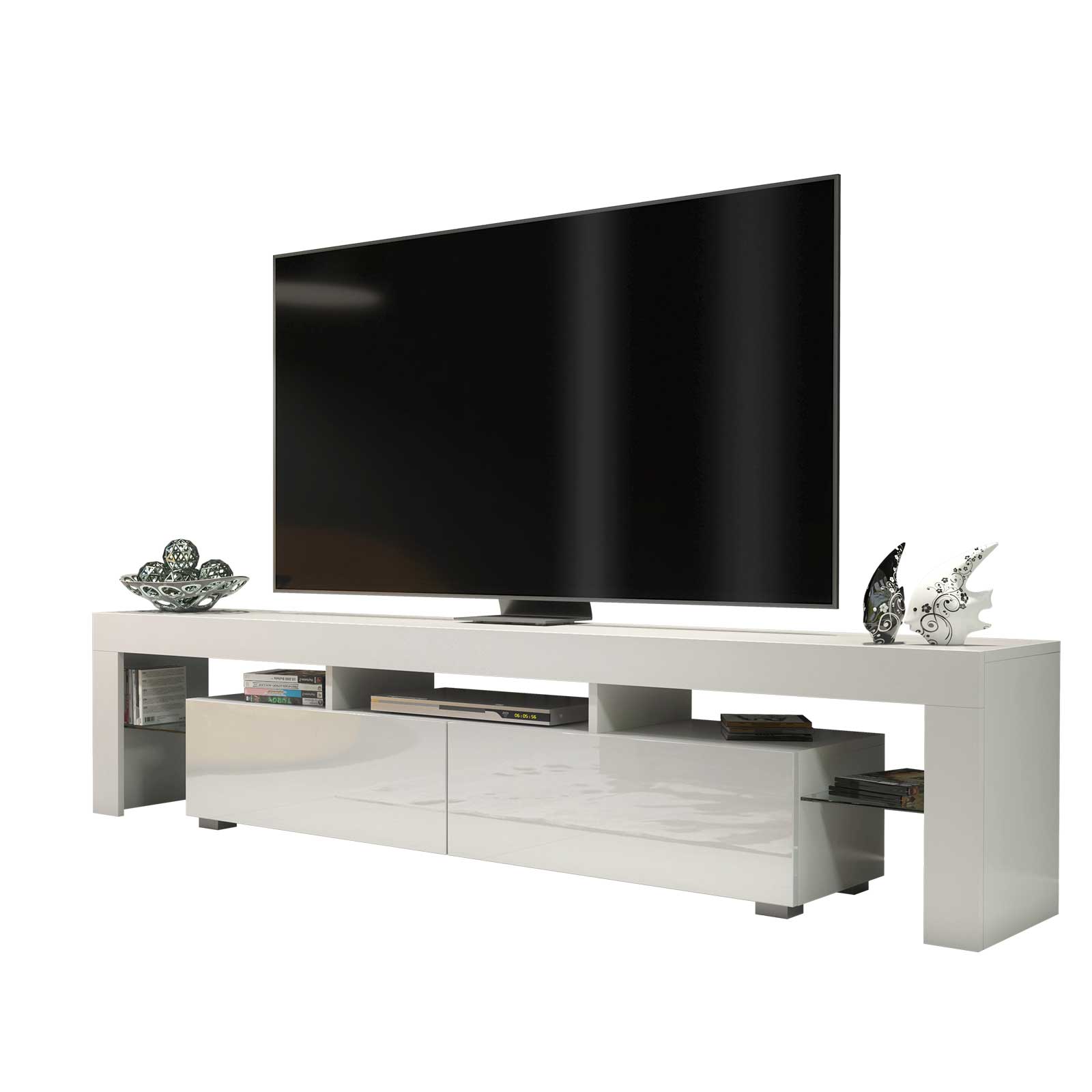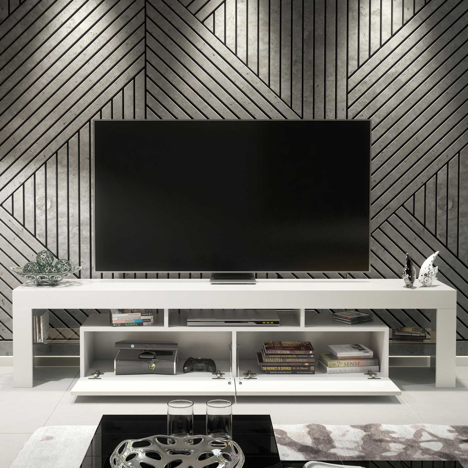 At the centre, two push-to-open drop-down doors provide generous concealed storage — perfect for games consoles, remotes, cables, and everyday living room essentials. The handle-free mechanism keeps the front sleek, uninterrupted, and easy to use.