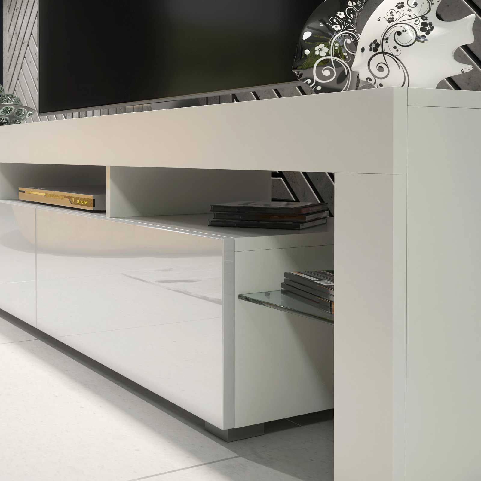 Style with dark wall finishes, textured fabrics, and matte black or metal accessories to emphasise the contrast between the matt body and gloss fronts. Keep décor minimal to let the clean lines, glass display sections, and extra-wide proportions create a bold, modern focal point in your living space.