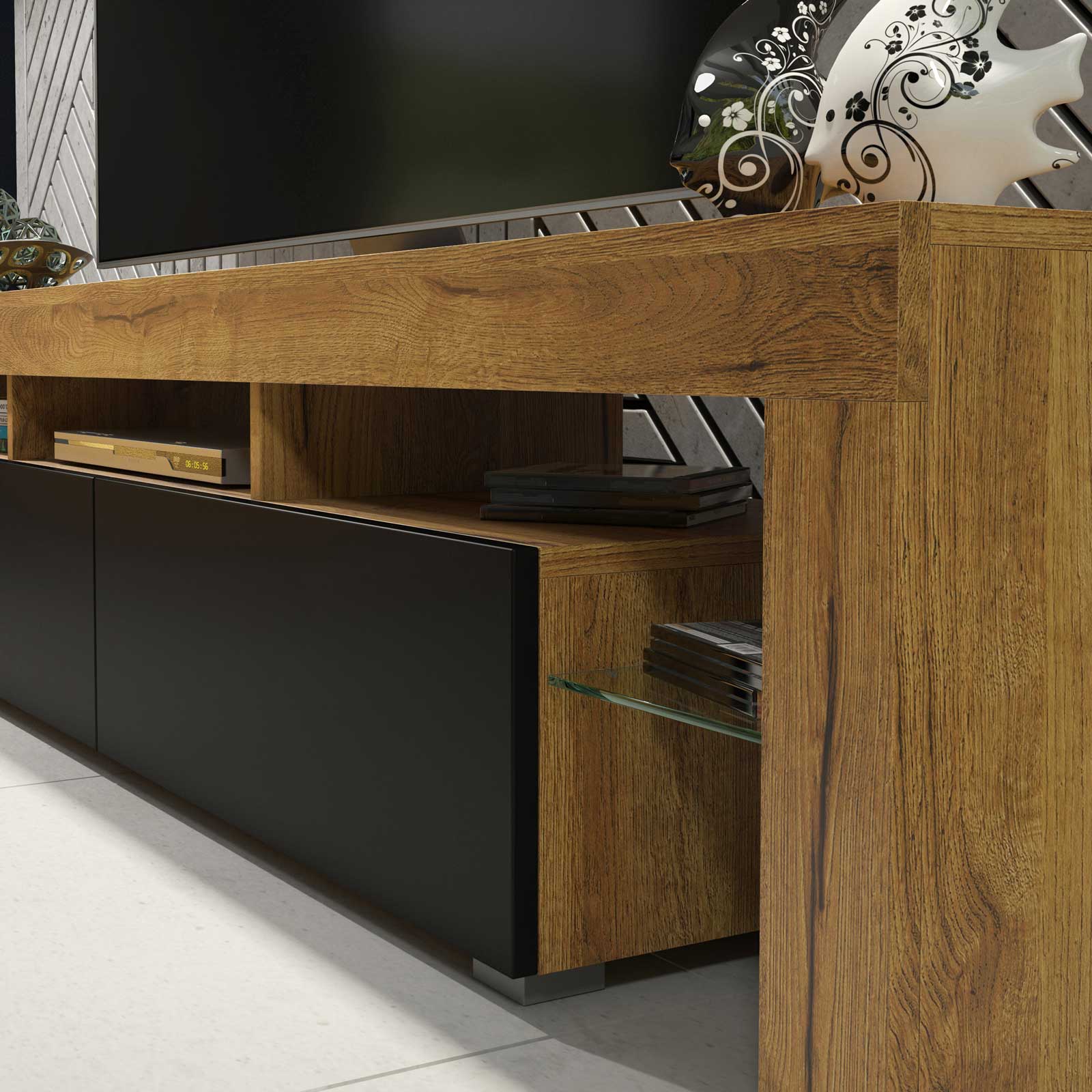 Style with black metal accents, textured fabrics, and neutral tones to emphasise the contrast between the warm oak finish and matt black fronts. Keep accessories minimal to let the clean lines, glass display sections, and extra-wide proportions create a strong, modern statement in your living space.