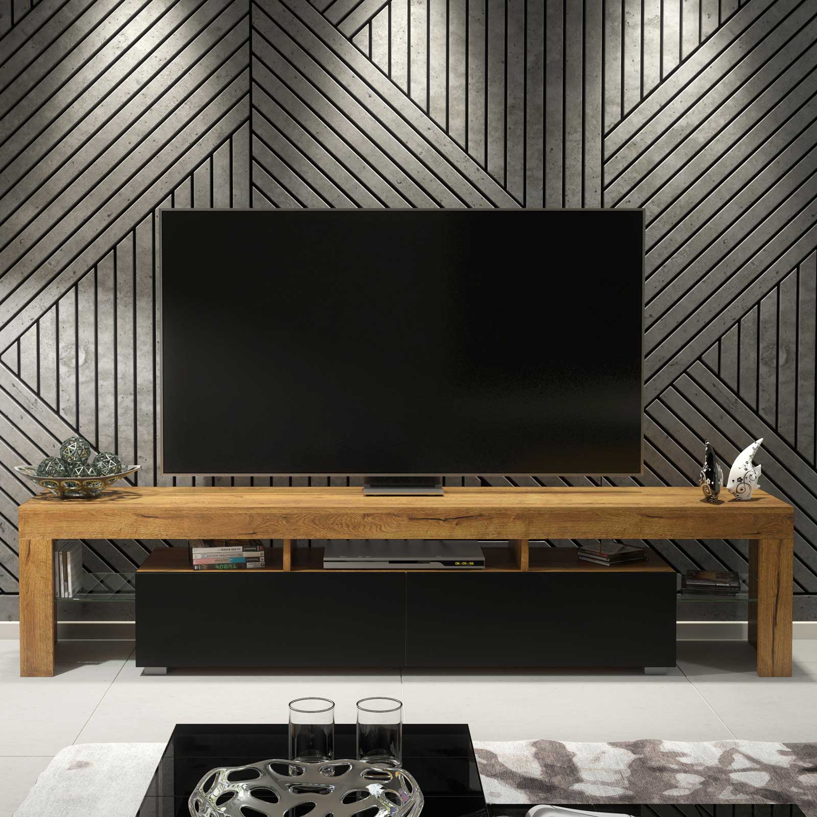 Create a bold, contemporary focal point with this extra-wide 200cm Oak Matt & Black Matt TV unit from Olivia Furniture. Designed for modern interiors that value strong contrast, clean lines, and practical storage, this media cabinet blends natural warmth with a confident, architectural finish.
