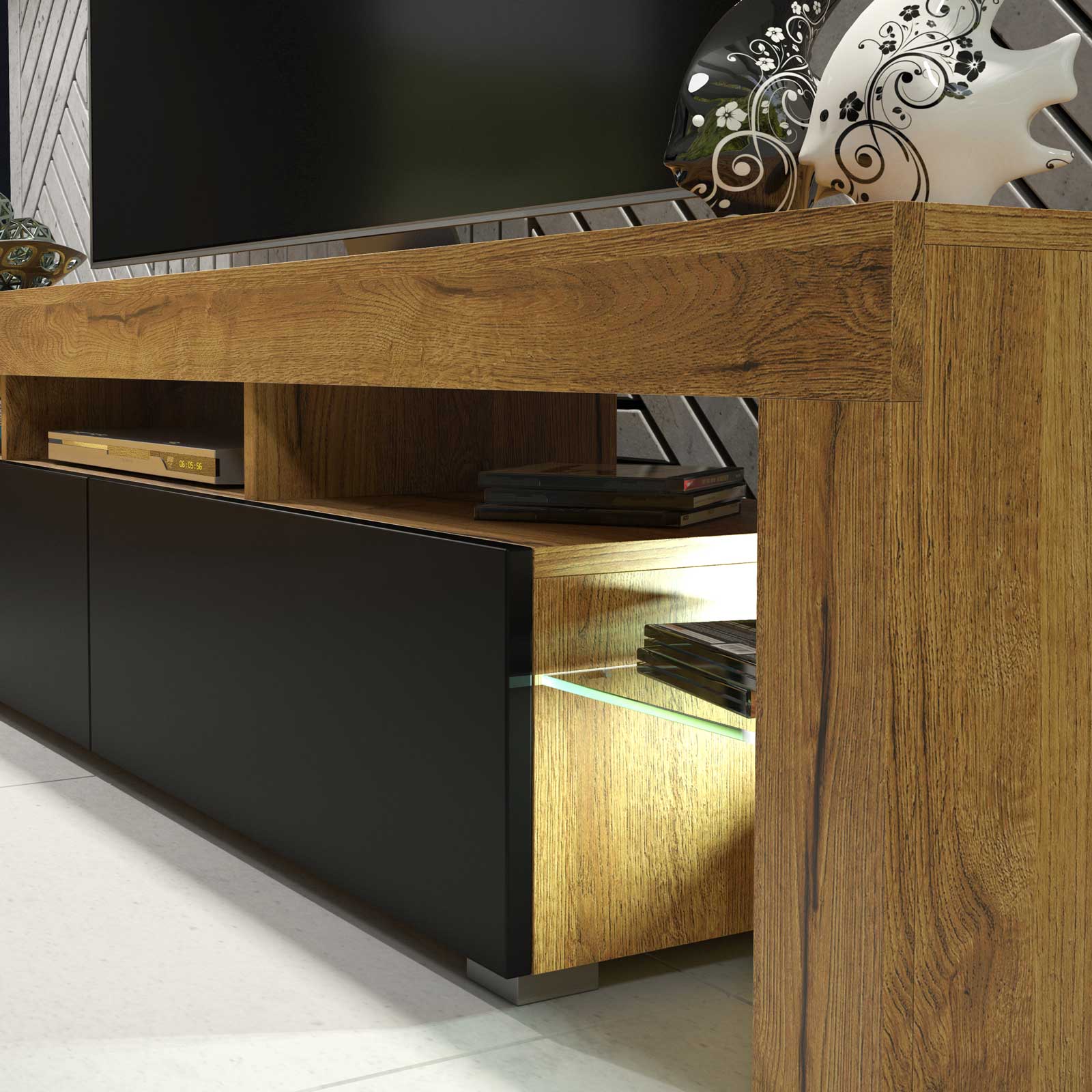 On both sides, the unit features glass display sections with LED backlighting, allowing you to showcase décor, books, or tech accessories in a subtle yet eye-catching way. These illuminated side sections add depth and elevate the unit into a true design feature.