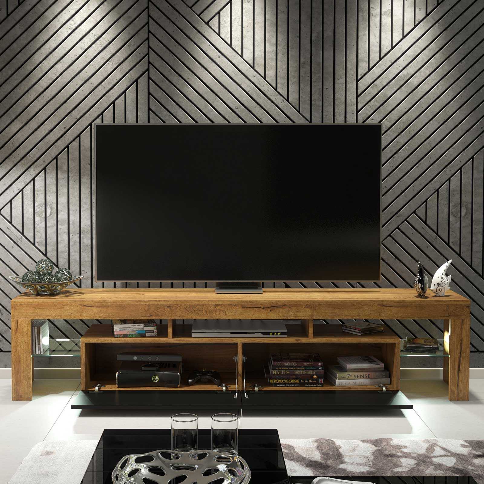 At the centre, two large push-to-open drop-down doors open to reveal generous concealed storage — ideal for games consoles, remotes, DVDs, and everyday living room essentials. The handle-free design keeps the front clean and uninterrupted.