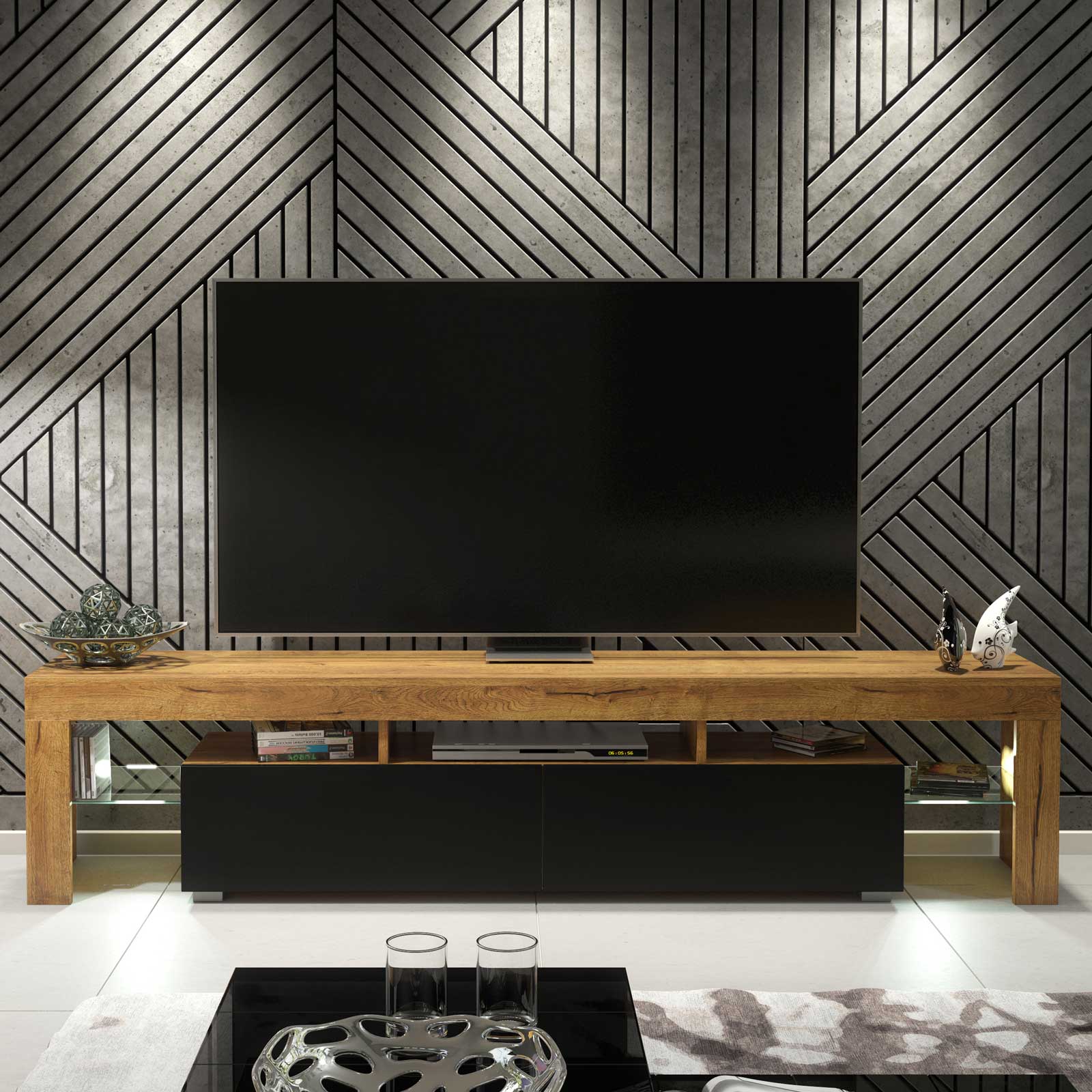 Extra-Wide 200cm Oak Matt & Black Matt TV Unit — Modern Media Cabinet with LED Glass Display, Push-to-Open Drop-Down Storage & AV Niches