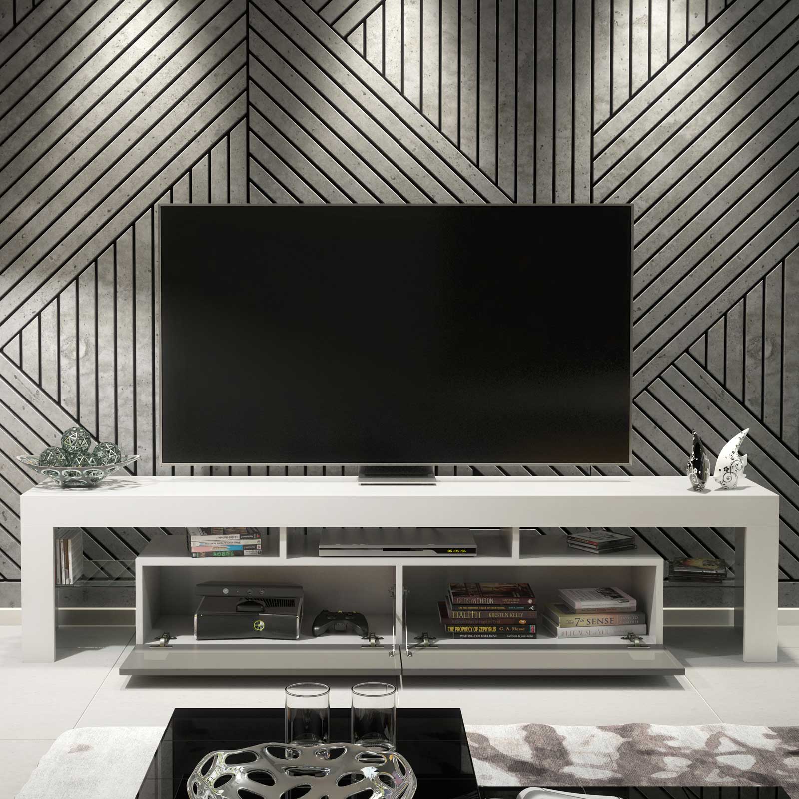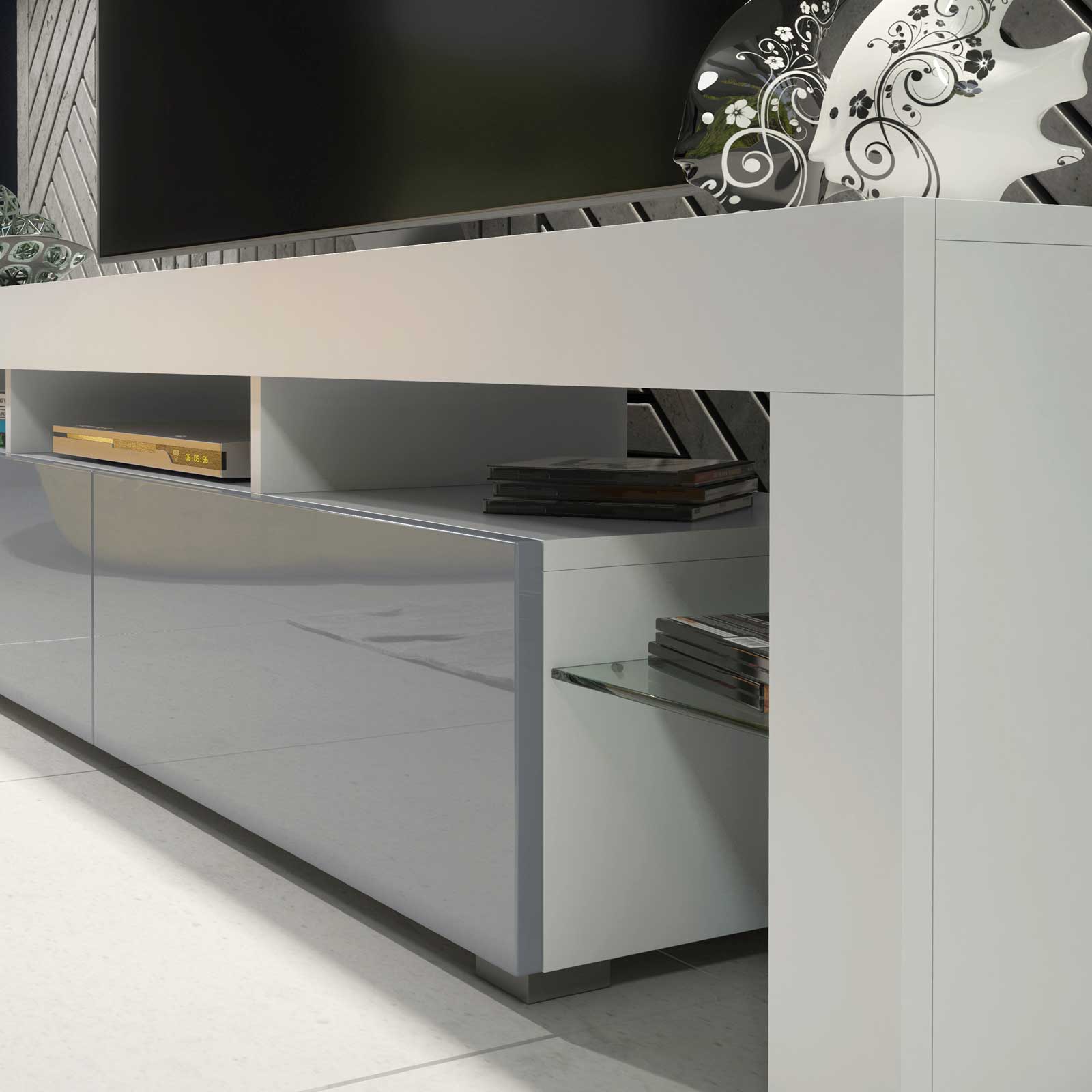 Style with soft grey textiles, neutral tones, and minimal accessories to highlight the contrast between the white matt body and grey gloss fronts. Keep décor understated to let the glass display sections and extra-wide proportions create a calm, modern focal point in your living space.