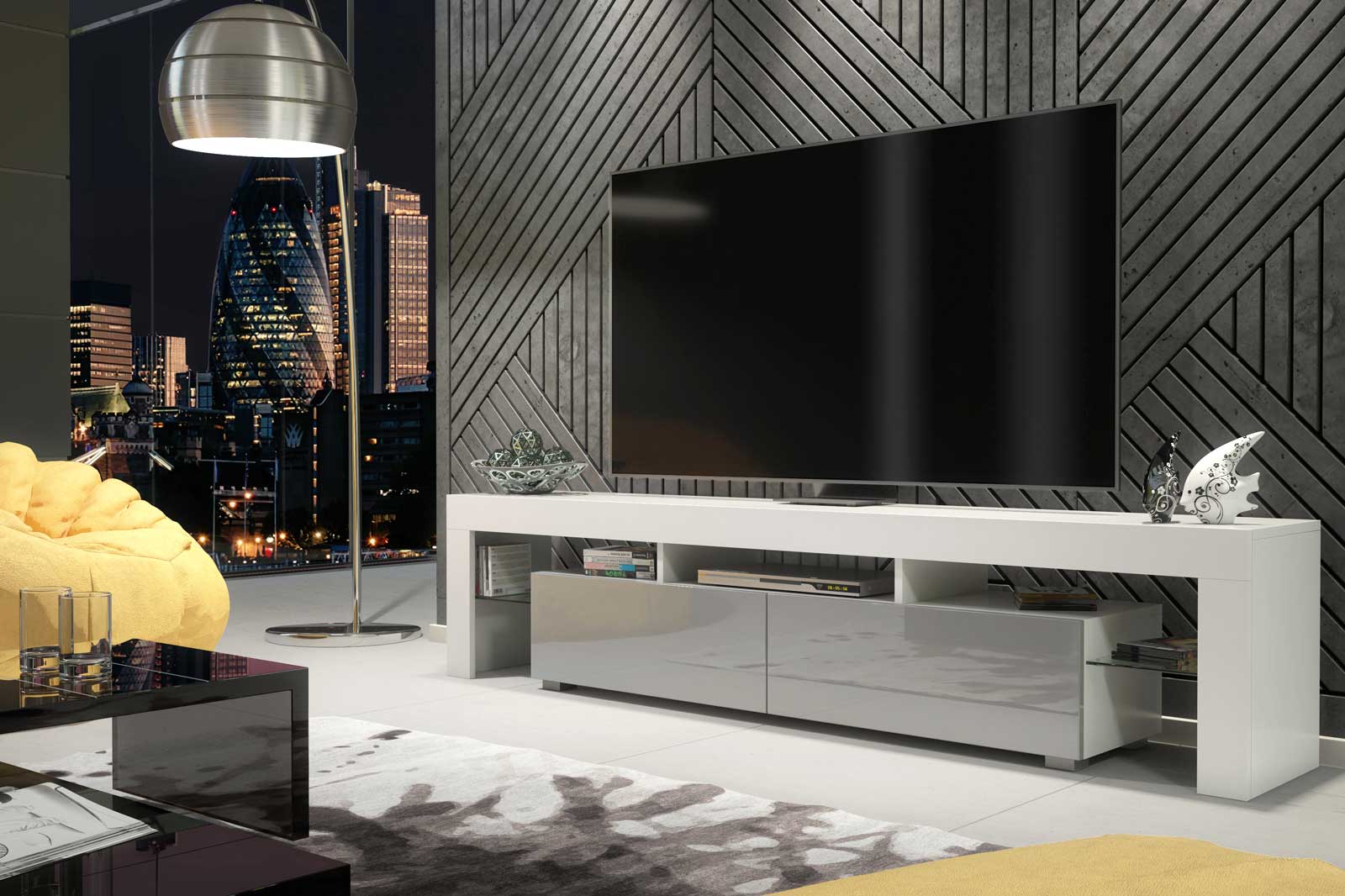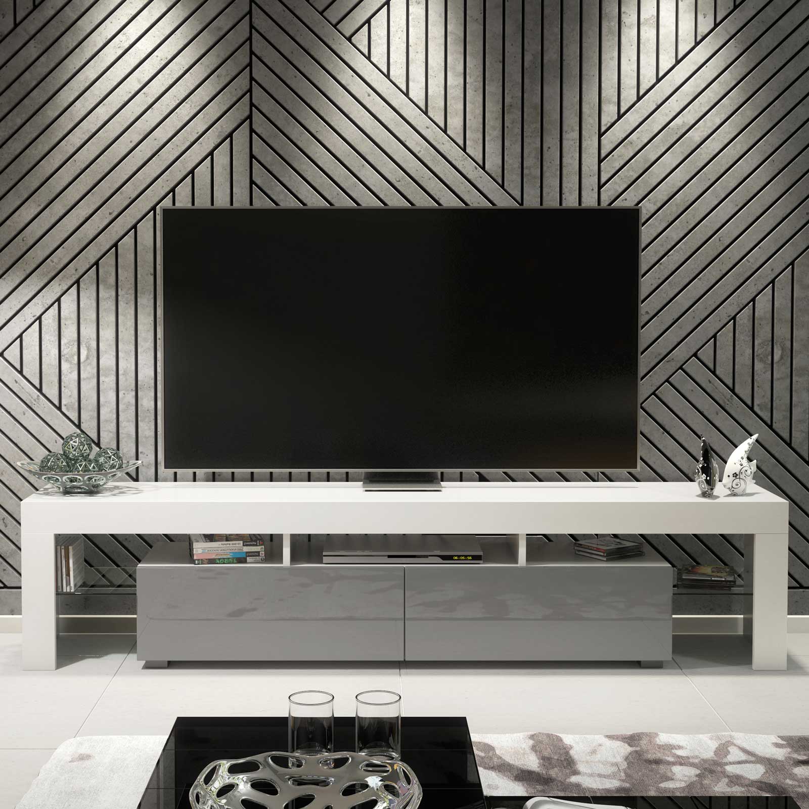 Create a refined, contemporary focal point with this extra-wide 200cm White Matt & Grey Gloss TV unit from Olivia Furniture. Designed for modern interiors that value clean lines, subtle contrast, and practical storage, this media cabinet delivers a balanced, designer look ideal for everyday living.