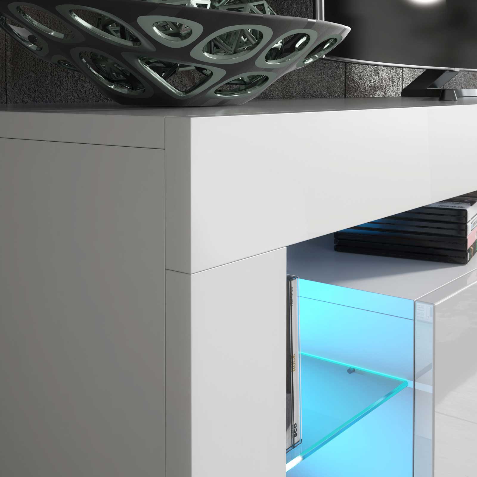 On both sides, the unit features glass display sections with LED backlighting, perfect for showcasing decorative accessories, books, or tech pieces. These illuminated side compartments add depth and visual interest, elevating the unit from simple storage to a true design feature.