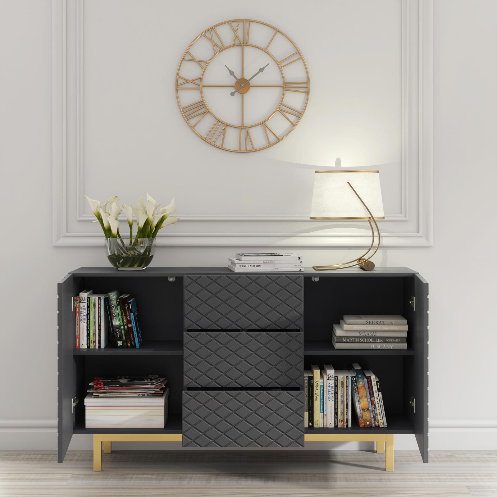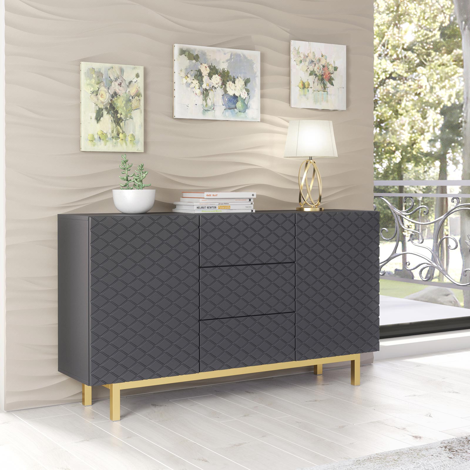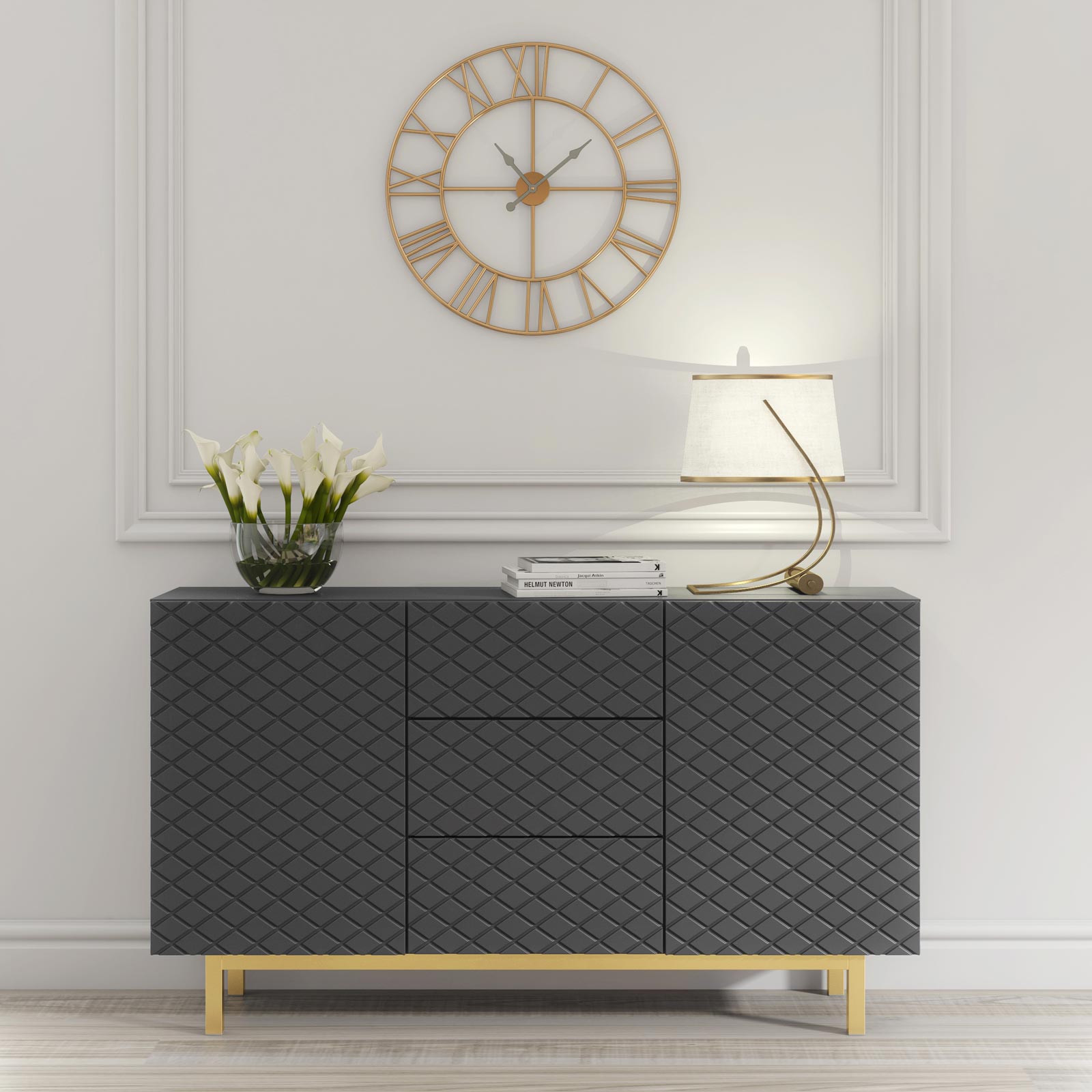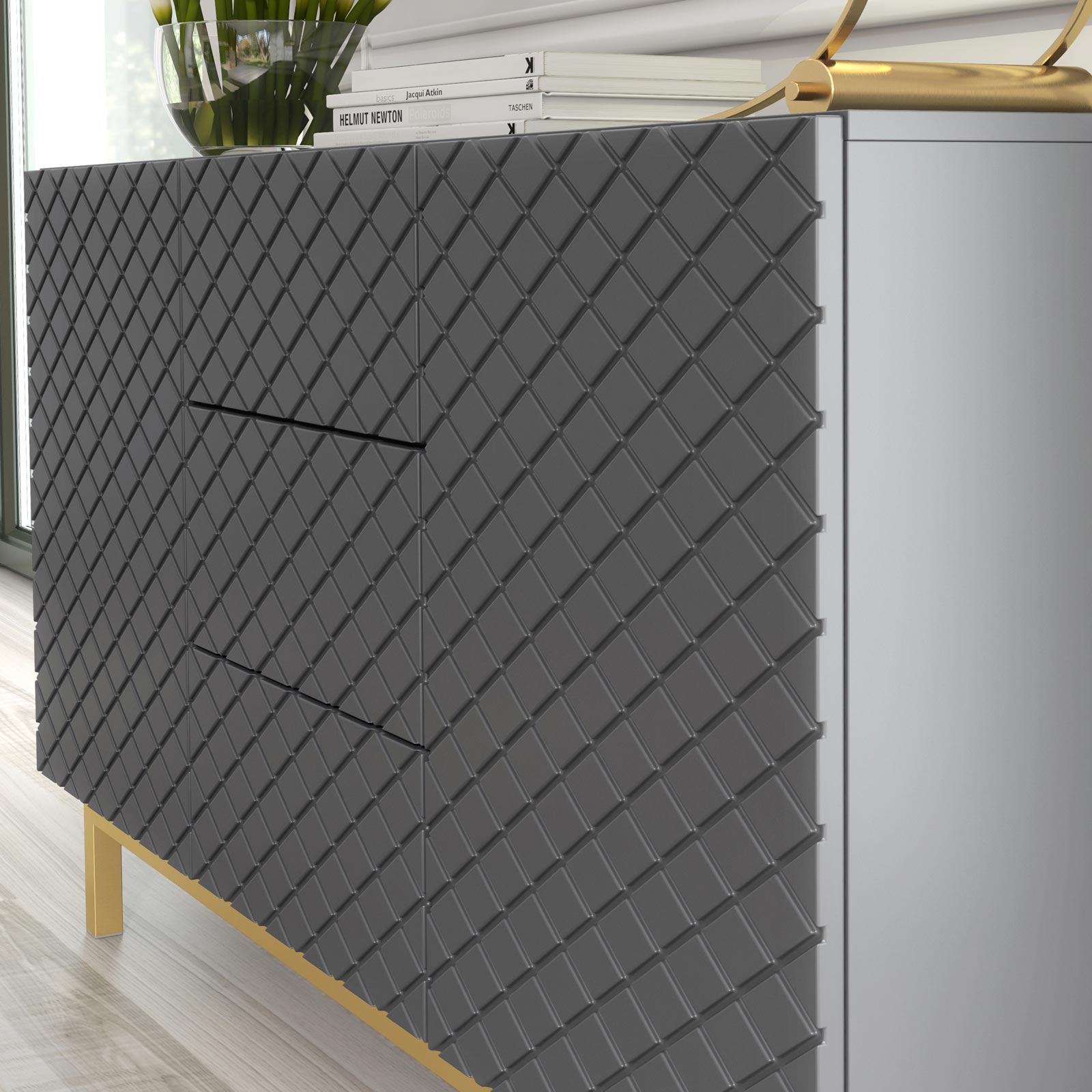 Finished in a sophisticated matt grey, this sideboard delivers a calm, architectural presence while the geometric diamond-pattern front panels create depth and refined surface detail. The structured texture enhances light and shadow, giving the cabinet a premium, designer aesthetic ideal for modern UK interiors.