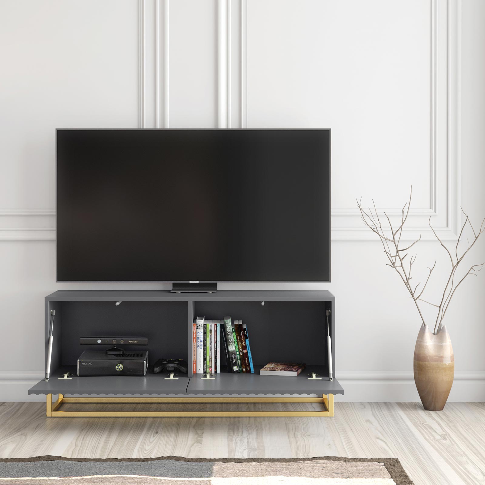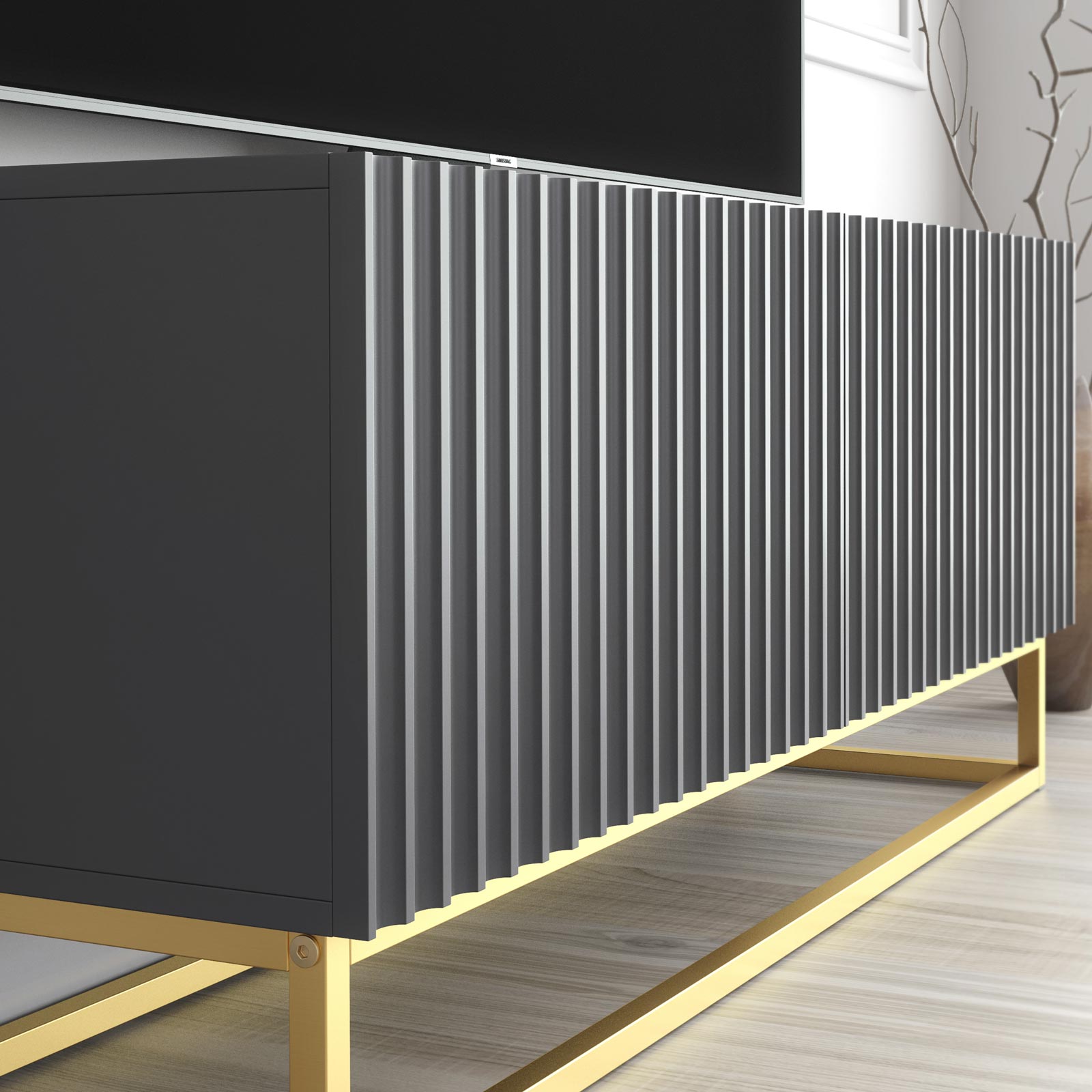 Pair with warm metallic accents, soft lighting and textured décor to highlight the ribbed detailing and gold base. For larger rooms, combine multiple units side-by-side to create a bespoke, full-length media wall with a cohesive luxury finish.