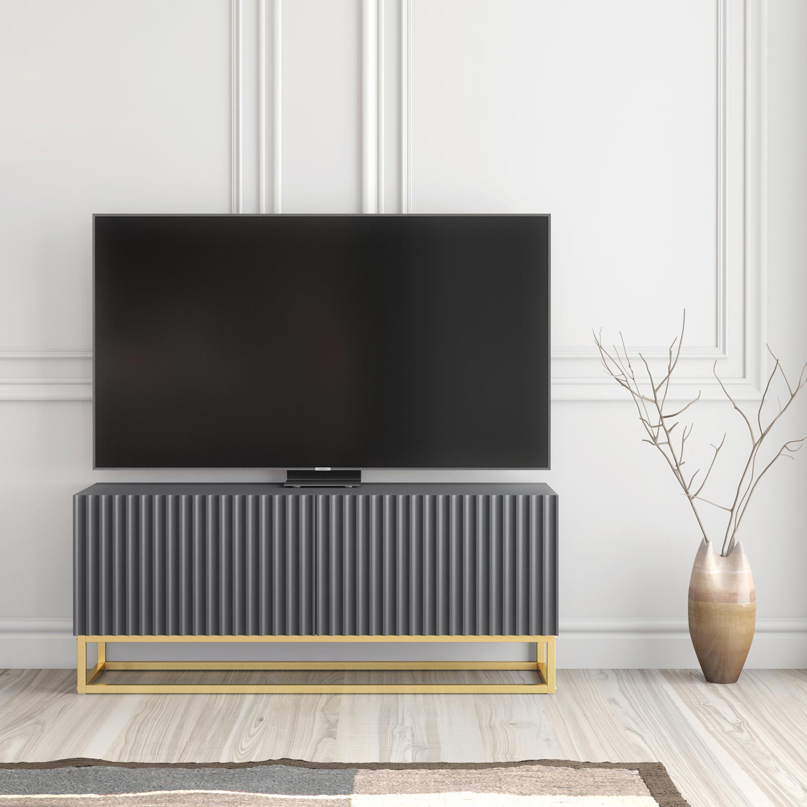 Introduce modern texture and understated luxury into your living space with this 100cm Grey Matt TV Unit, designed with elegant vertically ribbed fronts and a striking gold metal base.