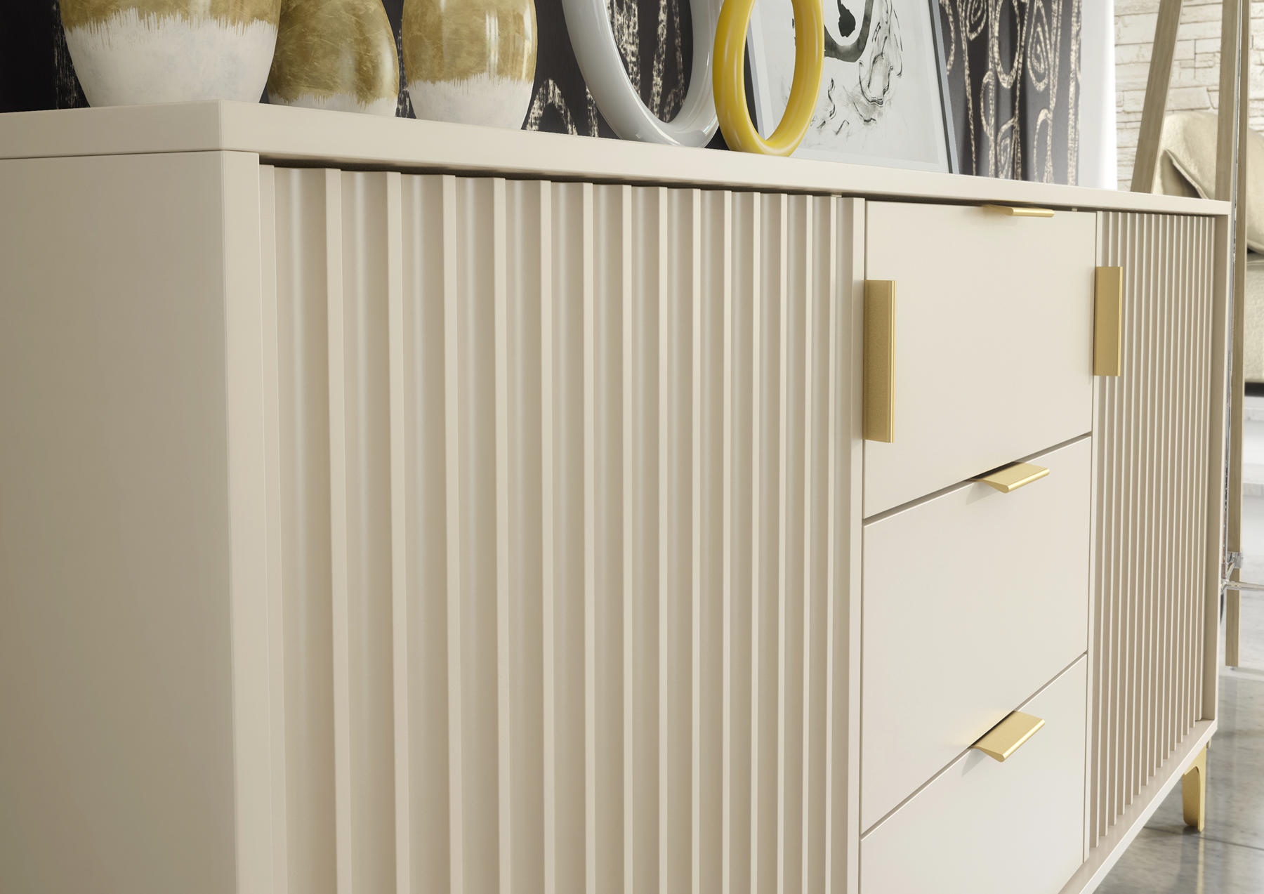 Every detail has been carefully considered, from the delicate fluted fronts to the gold handles and matching gold legs, which add a sophisticated accent and elevate the overall look. The sleek profile and soft matte Cashmere finish bring a warm, refined character that fits seamlessly into both light and dark interiors.
