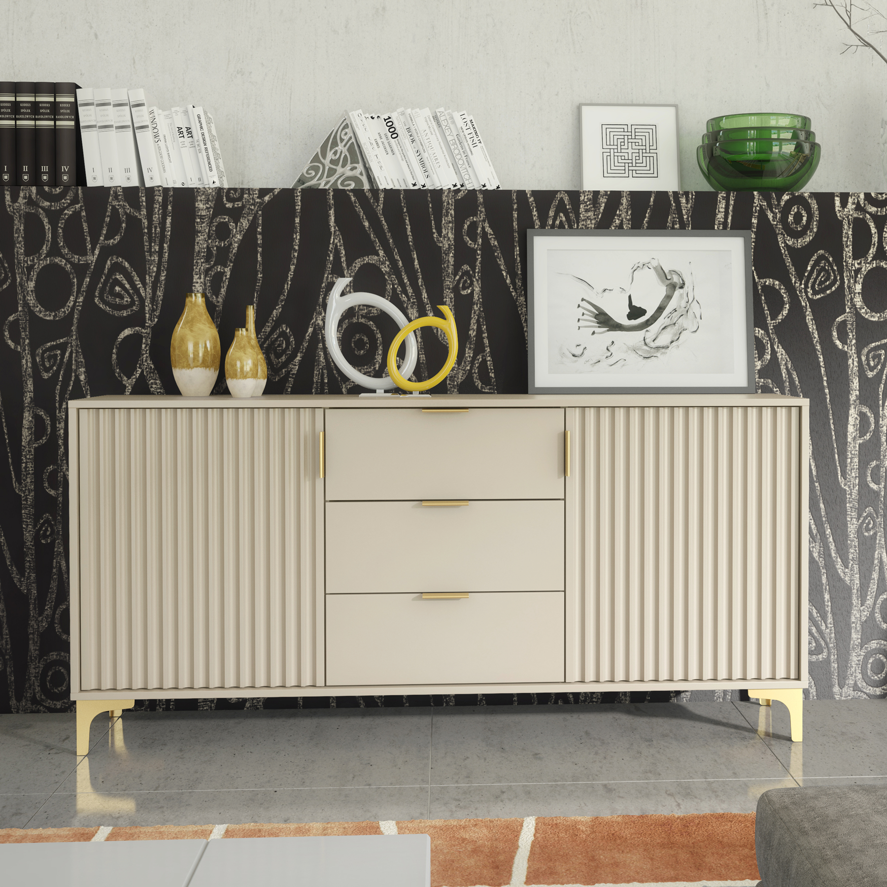 The sideboard features two fluted doors on each side with adjustable shelves behind them — ideal for tableware, books, or everyday essentials — while the three central drawers provide easy-access storage for smaller items, keeping surfaces clear and clutter-free.